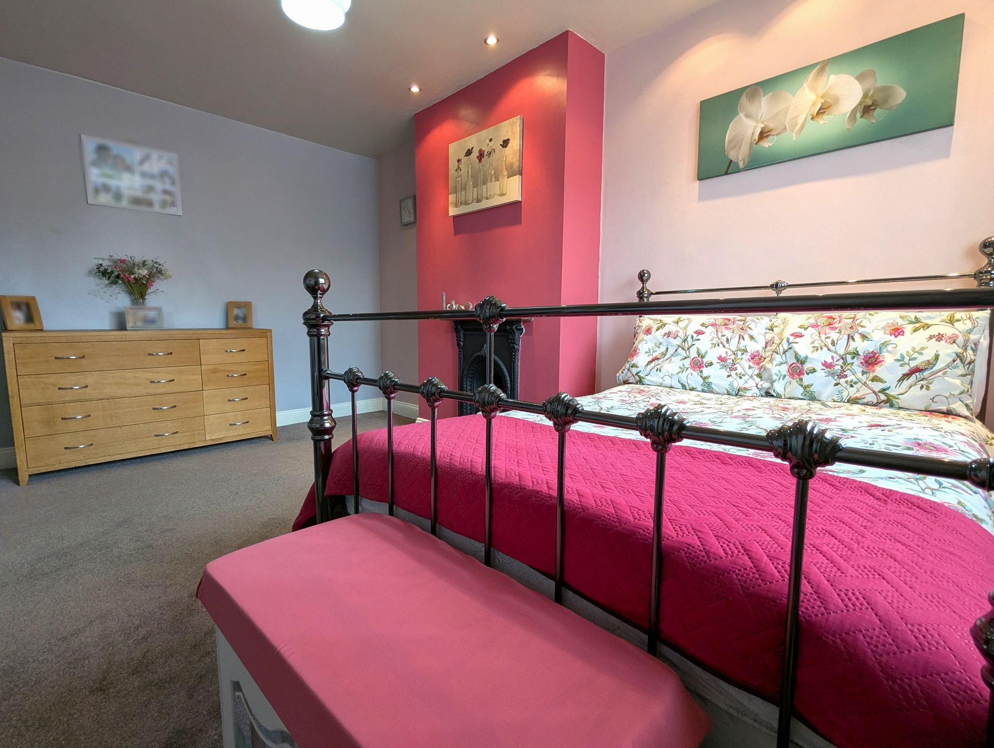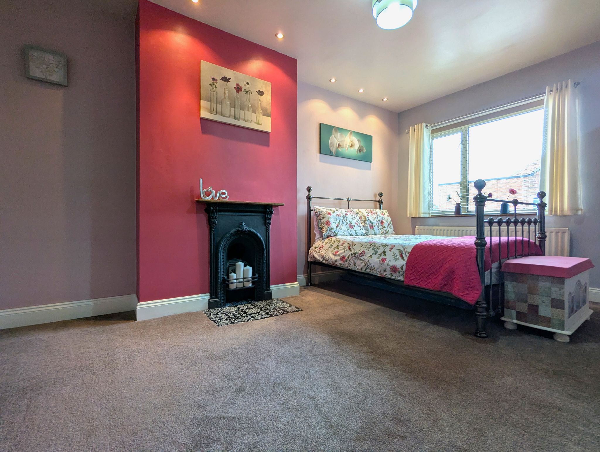 Bedroom One - 14'6 x 12'8 (4.46m x 3.92m) - Spacious carpeted bedroom with a front-facing UPVC triple glazed window, wall mounted radiator and original working fireplace as centrepiece.