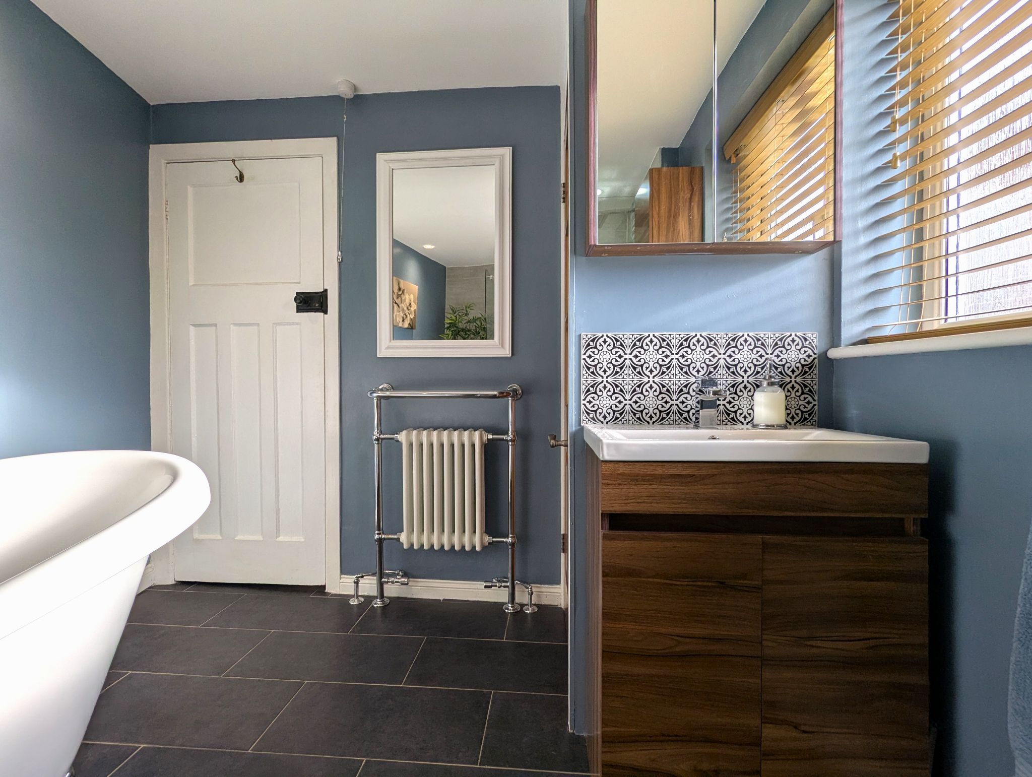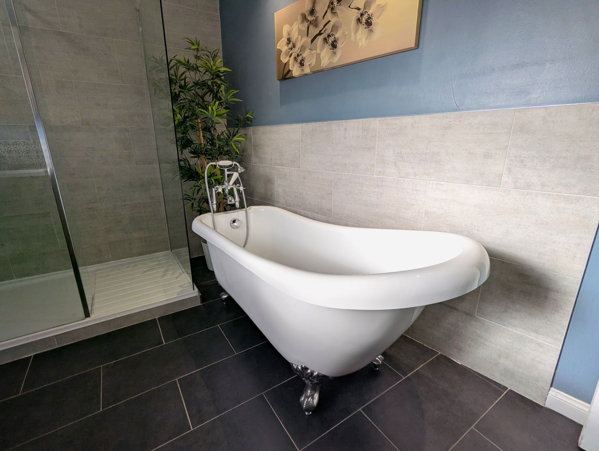 Bathroom - 10'9 x 7'8 (3.35m x 2.40m) - Stylish modern bathroom with tiled flooring and splashbacks. Access to vanity unit with fitted wash basin, stunning freestanding roll-top bath and separate shower enclosure with a rainfall style mixer shower. Side-facing UPVC double glazed window, built-in cupboard housing a combination boiler and wall mounted combined vintage style radiator and heated towel rail.