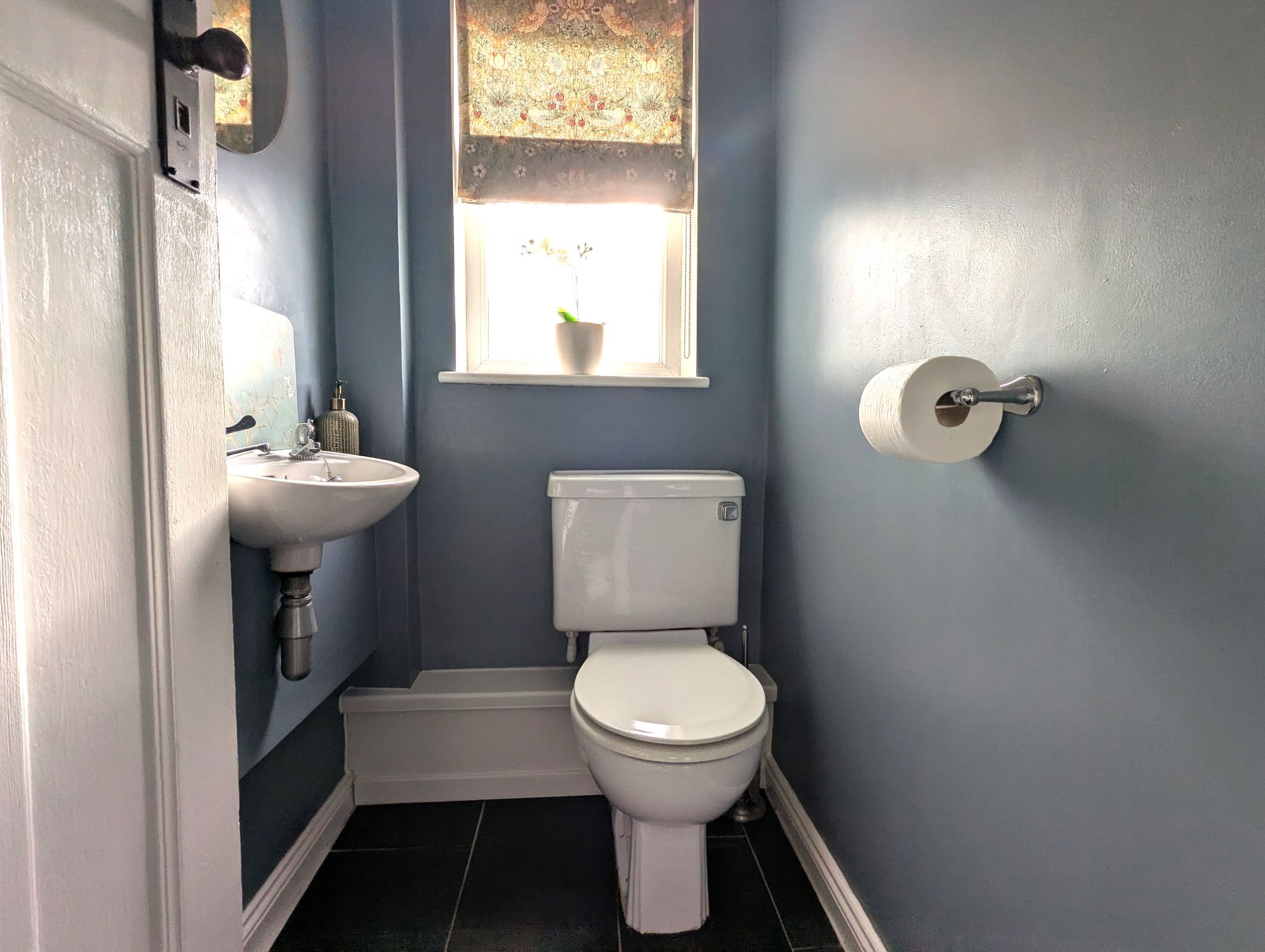 WC - Tiled flooring, access to a toilet and wash basin. Side-facing UPVC double glazed window.