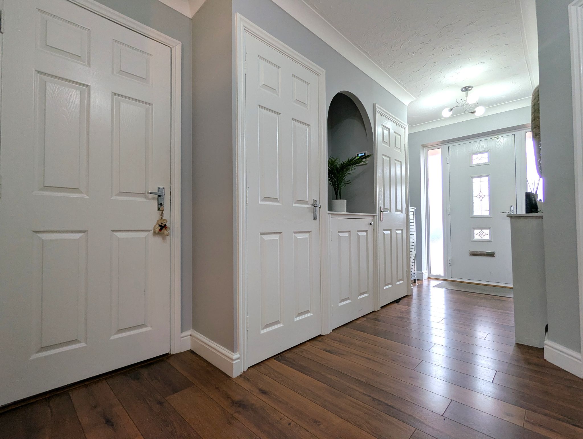 Entrance Hall - Enter via a composite front door into a spacious entrance hall with laminate wood flooring, offering access to a lounge, kitchen with an extended dining area, study, utility, WC, carpeted staircase to the first floor and ample storage via a built-in cupboard and separate fitted cupboards. Enclosed wall mounted radiator.