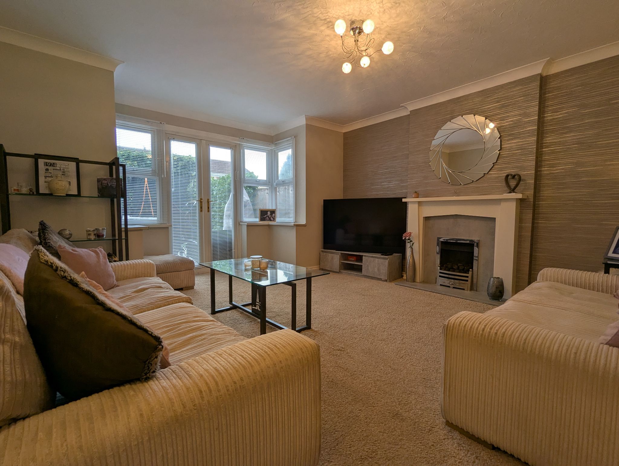 Lounge - 15'6 x 13'6 (4.77m x 4.16m) - Spacious carpeted lounge with a rear-facing bay aspect presented with UPVC double glazed windows and double French doors looking out onto the rear garden. Gas fireplace as centrepiece and 2 wall mounted radiators.