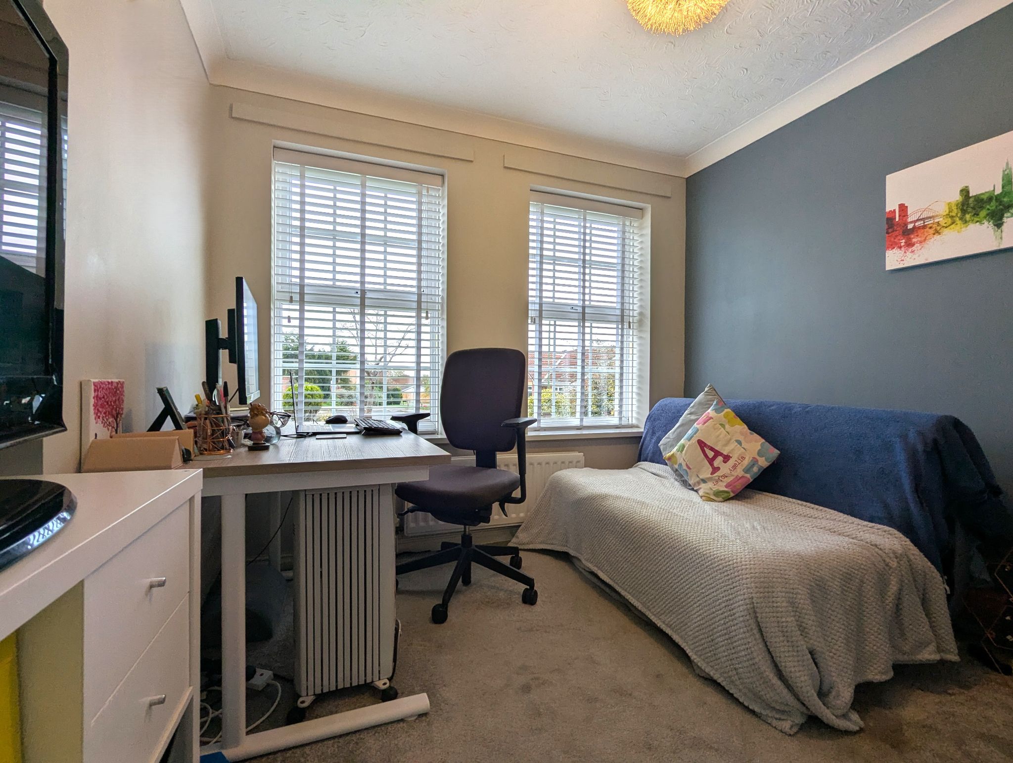 Study - 11'5 x 9' (3.52m x 2.76m) - A versatile reception room with a diverse range of uses, currently used as a study. Carpeted flooring, 2 front-facing UPVC double glazed windows and a wall mounted radiator.