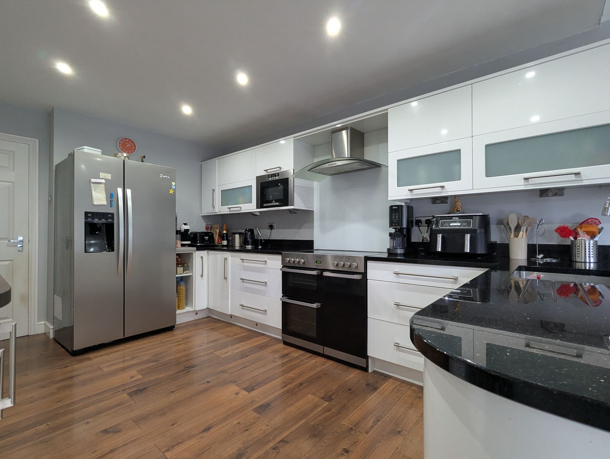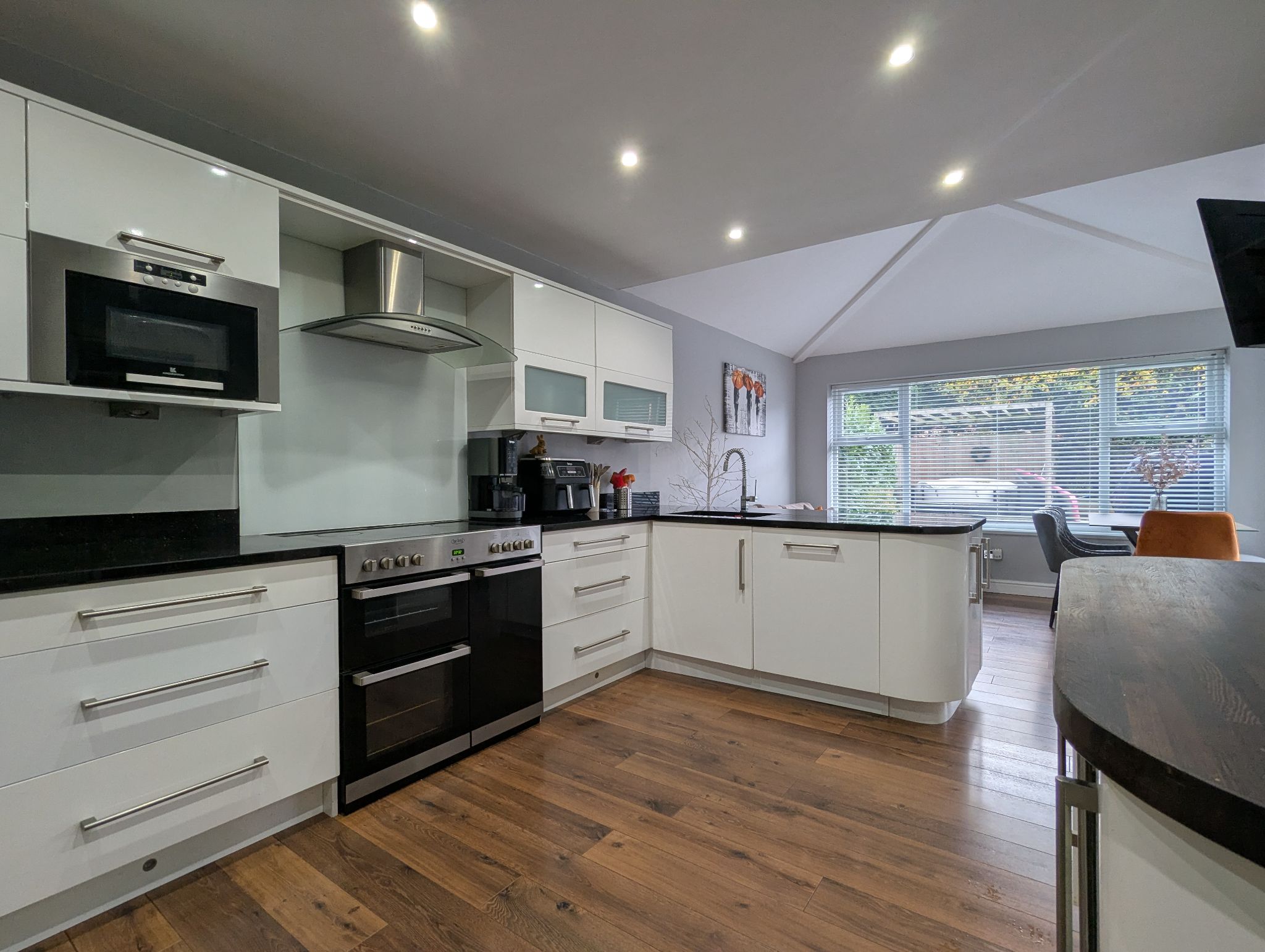 Kitchen/Diner - 24'1 x 10'1 opening to 12'5 (7.35m x 3.09m opening to 3.83m) - A generously proportioned kitchen space leading to an extension at the far side for a dining area and snug. With laminate wood flooring throughout, the kitchen offers ample storage with many fitted base and wall units with a sleek white gloss finish and contrasting black granite work surfaces. A freestanding electric range cooker as centrepiece with an overhead fitted extractor and glass splashback. Integrated microwave and dishwasher as well as space for a freestanding American style fridge/freezer. Stainless sink with mixer tap. Down lighting and plinth lighting. Rear-facing UPVC double glazed windows and bifolding patio doors looking out onto the rear garden. 2 wall mounted radiator.