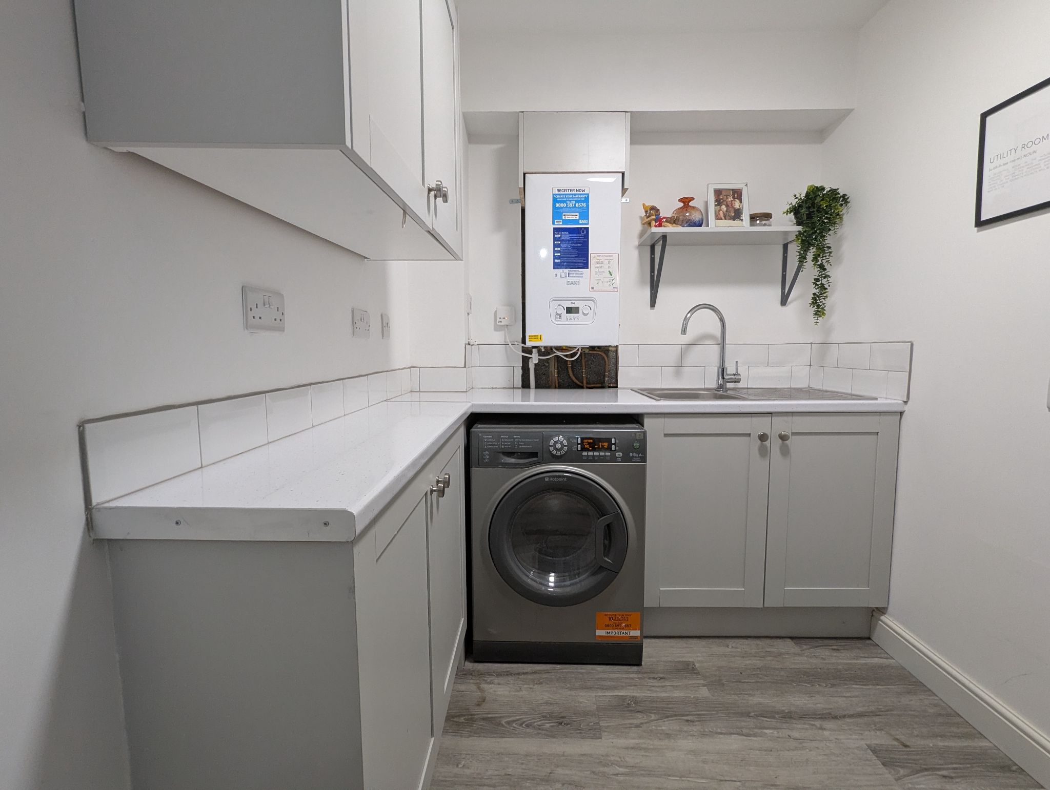 Utility - 6' x 7'5 (1.83m x 2.30m) - Built into the rear of the garage offering ample work space and fitted storage units. Space for a freestanding washing machine. Baxi combination boiler. Vinyl flooring and access to the remaining storage space in the garage.