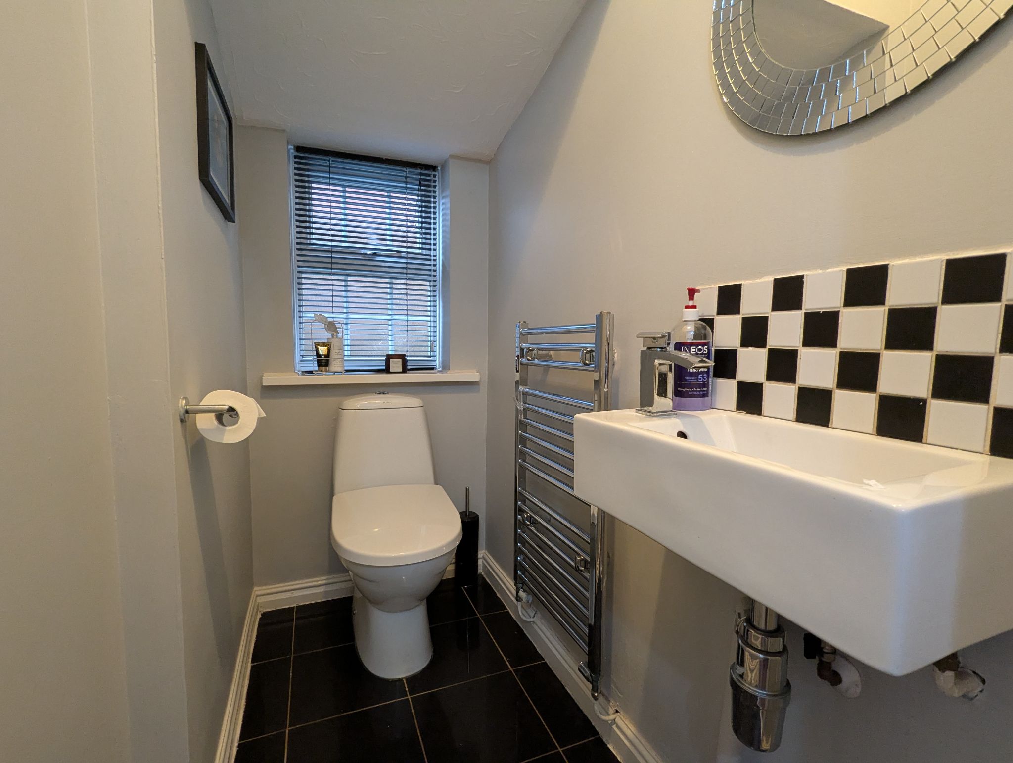 WC - Tiled flooring, access to a toilet and wash basin. Side-facing UPVC double glazed window and wall mounted heated towel rail.