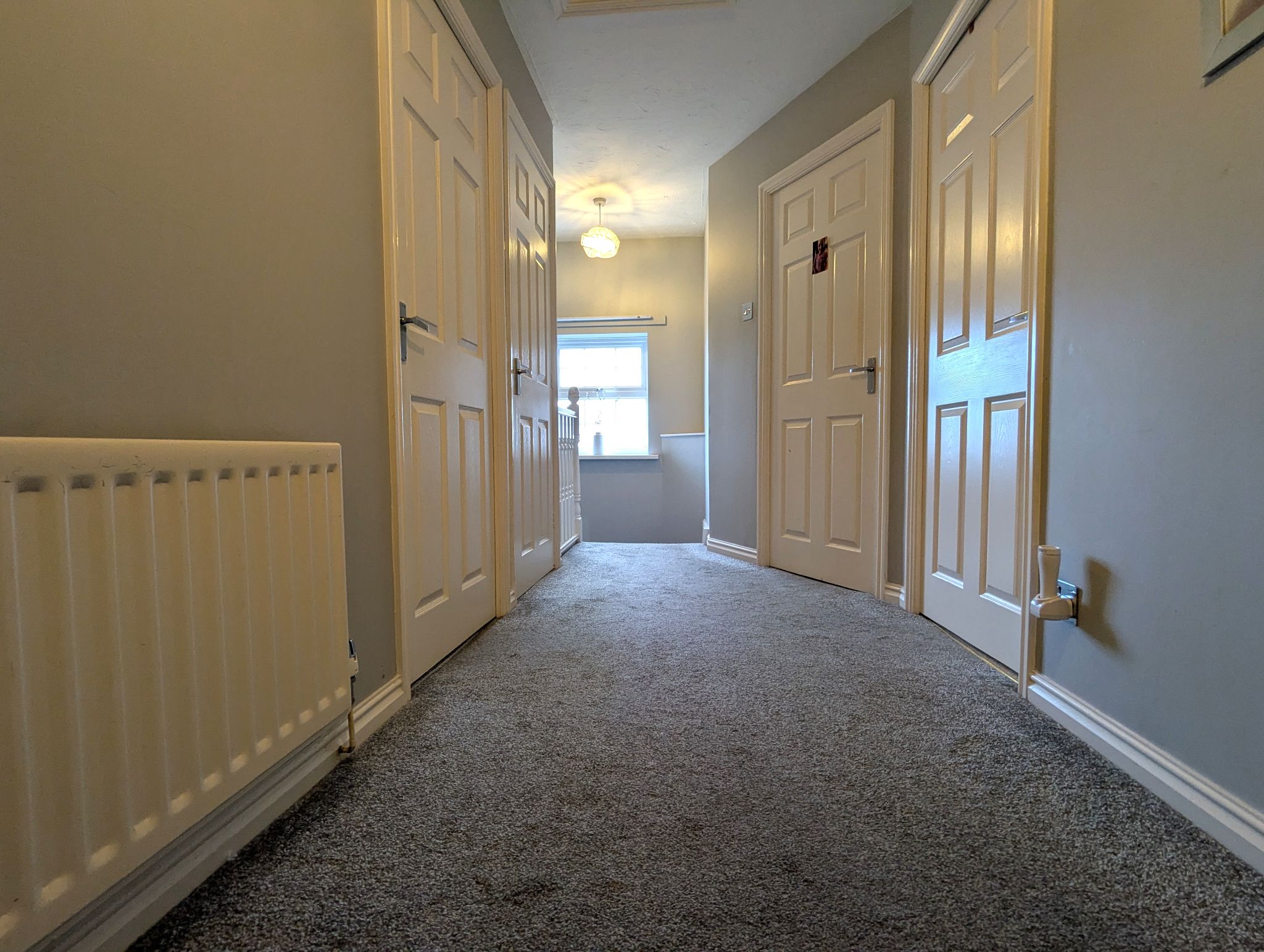 First Floor Landing - Long carpeted landing with a side-facing UPVC double glazed window, offering access to 3 double bedrooms and 1 single bedroom, family bathroom, built-in cupboard and loft hatch. Wall mounted radiator.