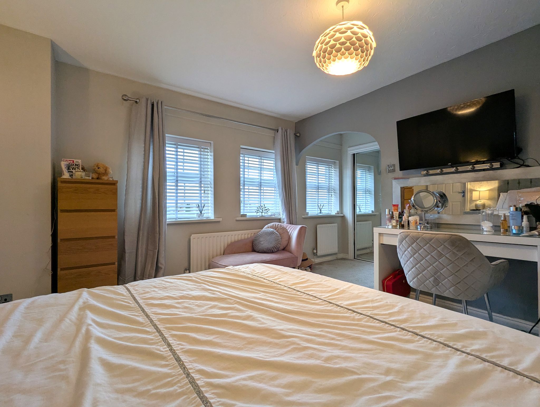Bedroom One - 12'7 x 12'6 (3.68m x 3.87m), dressing area 8'4 x 3'7 (2.59m x 1.15m) - Spacious carpeted bedroom with an open plan aspect for a dressing area featuring large fitted wardrobes with sliding mirrored doors. 3 front-facing UPVC double glazed windows, 2 wall mounted radiators and access to an ensuite.