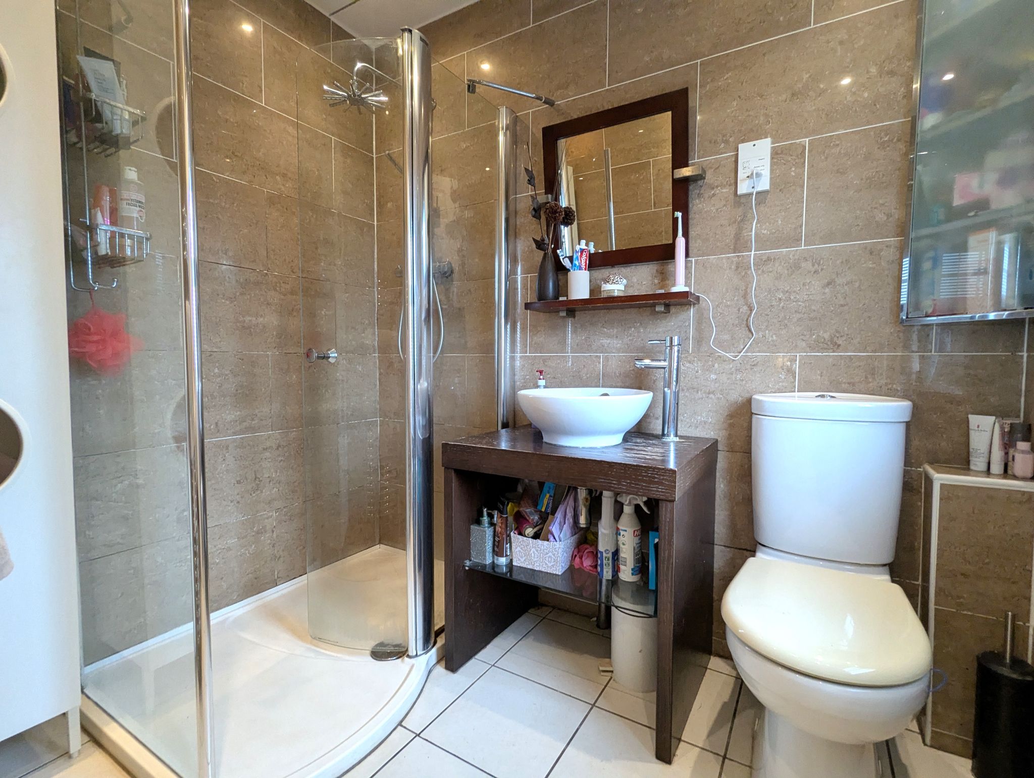 Ensuite - 7'2 x 5'3 (2.20m x 1.64m) - Tiled flooring along with a full height tiled splashback throughout. Access to a toilet, wash basin and walk-in shower unit with a rainfall style mains supplied mixer shower. Front-facing UPVC double glazed window, wall mounted heated towel rail and extractor fan.