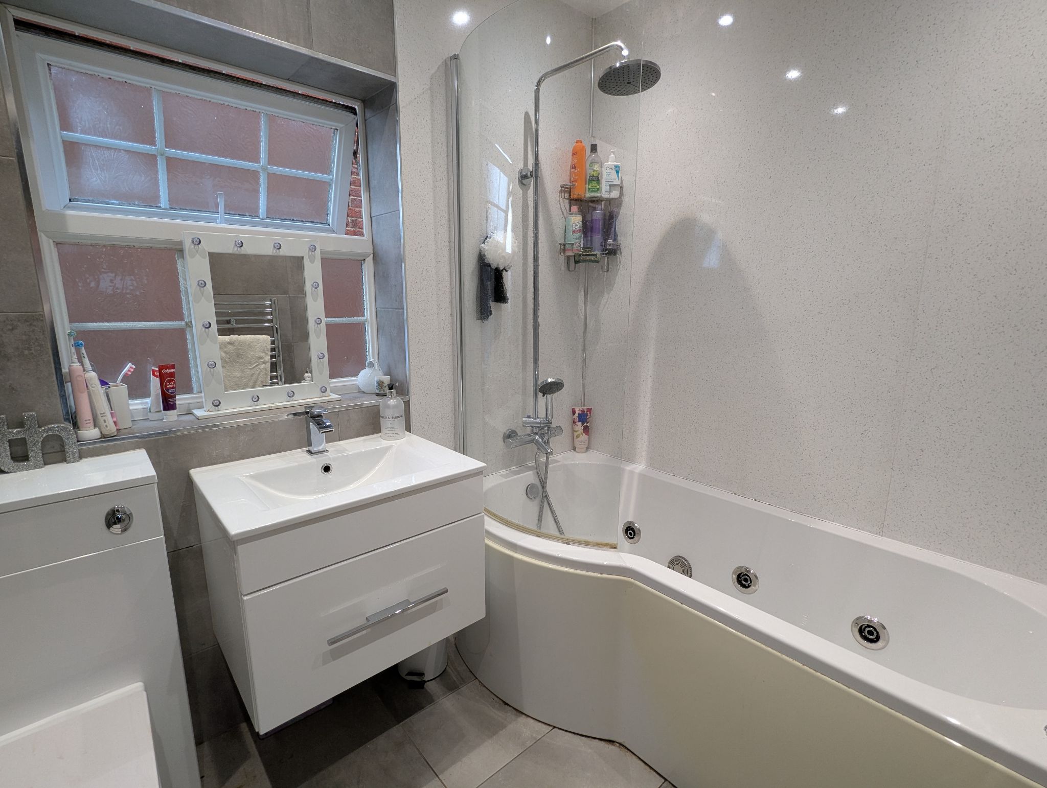 Family Bathroom - 7'4 x 5'5 (2.26m x 1.69m) - Tiled flooring along with a full height tiled splashback to the most part. Access to a toilet, wash basin and 'P' shaped bath with jetstreams along with a rainfall style mixer supplied shower and cladding splashback. Side-facing UPVC double glazed window. Wall mounted heated towel rail and extractor fan.
