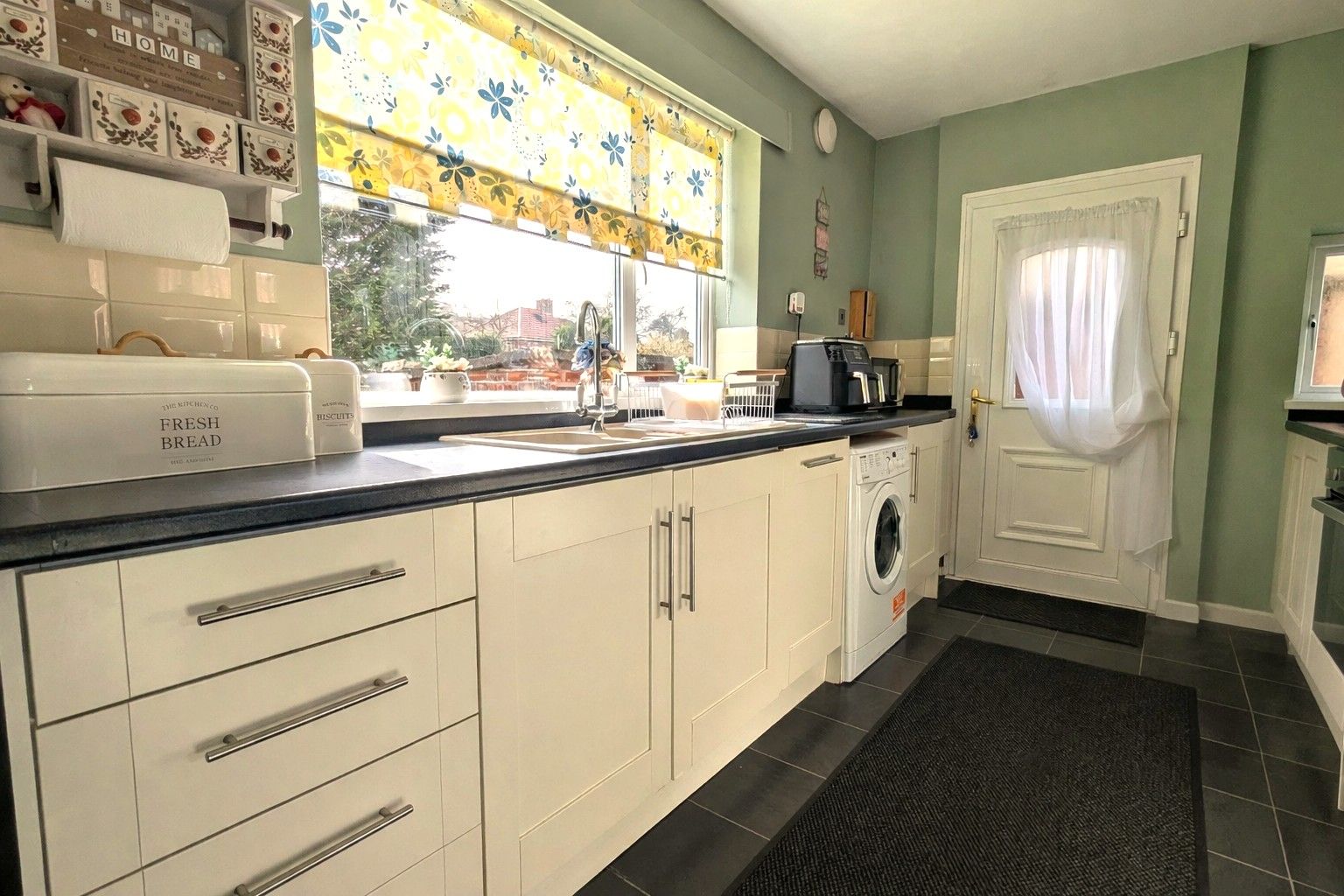 Kitchen - 14'1 x 8'0 - Consisting of uPVC double glazed window, rear door, lino flooring, wall and base units with contrasting work tops, tiled splash backs, plumbing for washing machine, chrome mixer taps, integrated oven and hob with extractor.