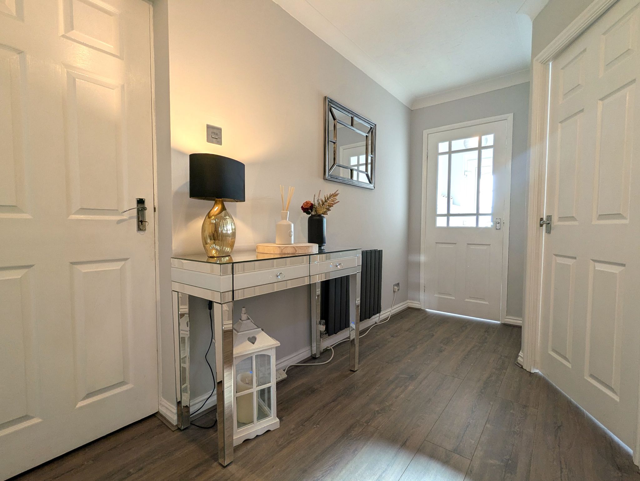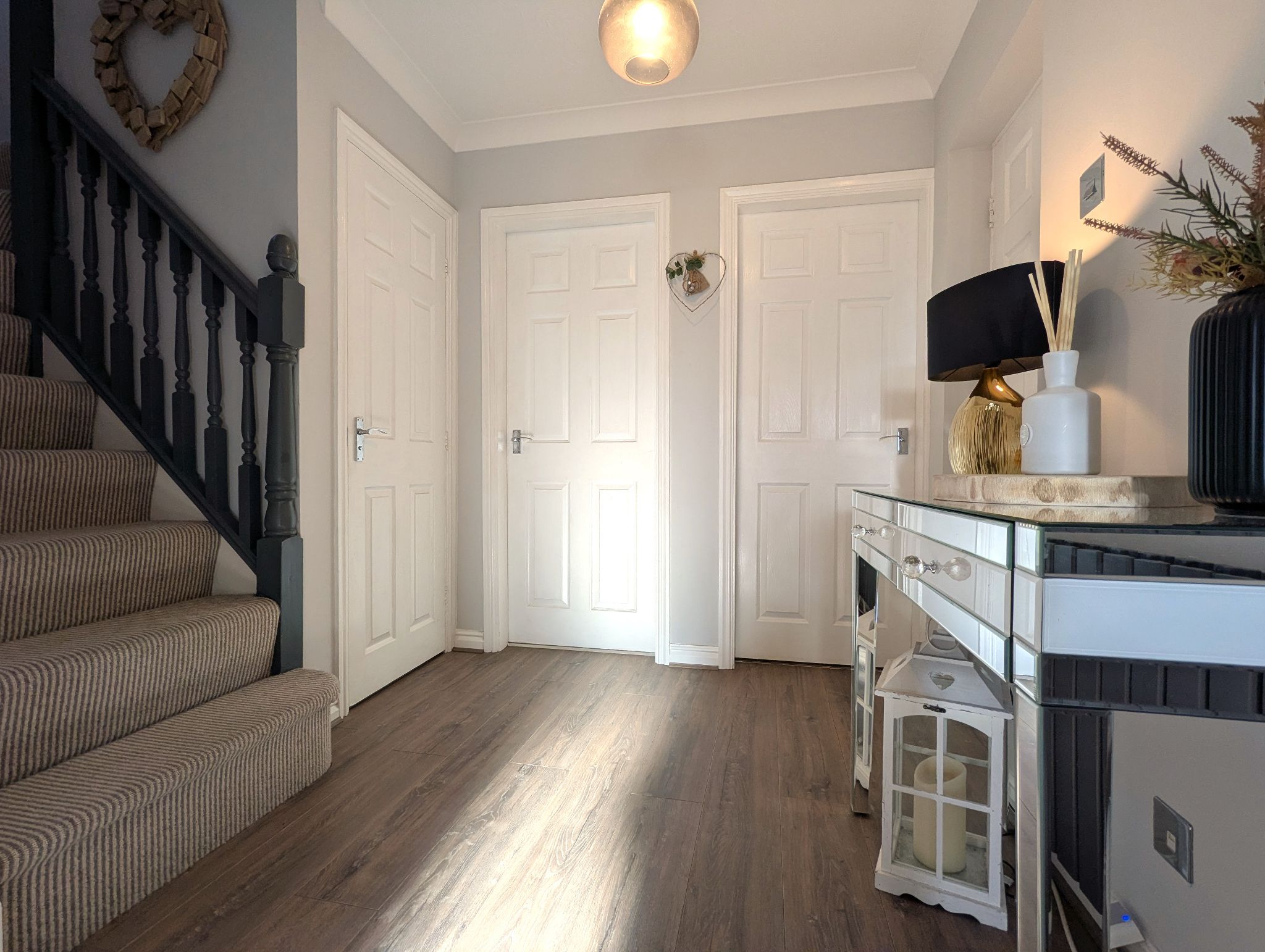 Hallway - Generous hallway with laminate flooring, offering access to (clockwise) a study, carpeted staircase to the first floor, WC, kitchen/diner, lounge and utility. Wall mounted custom radiator.
