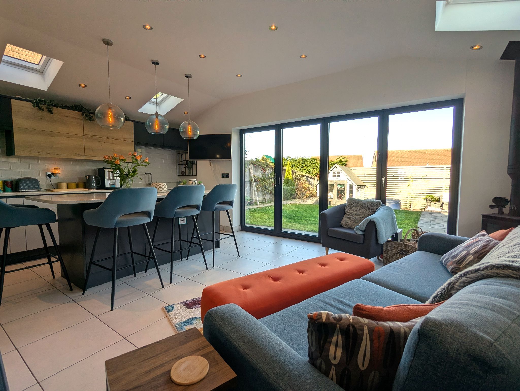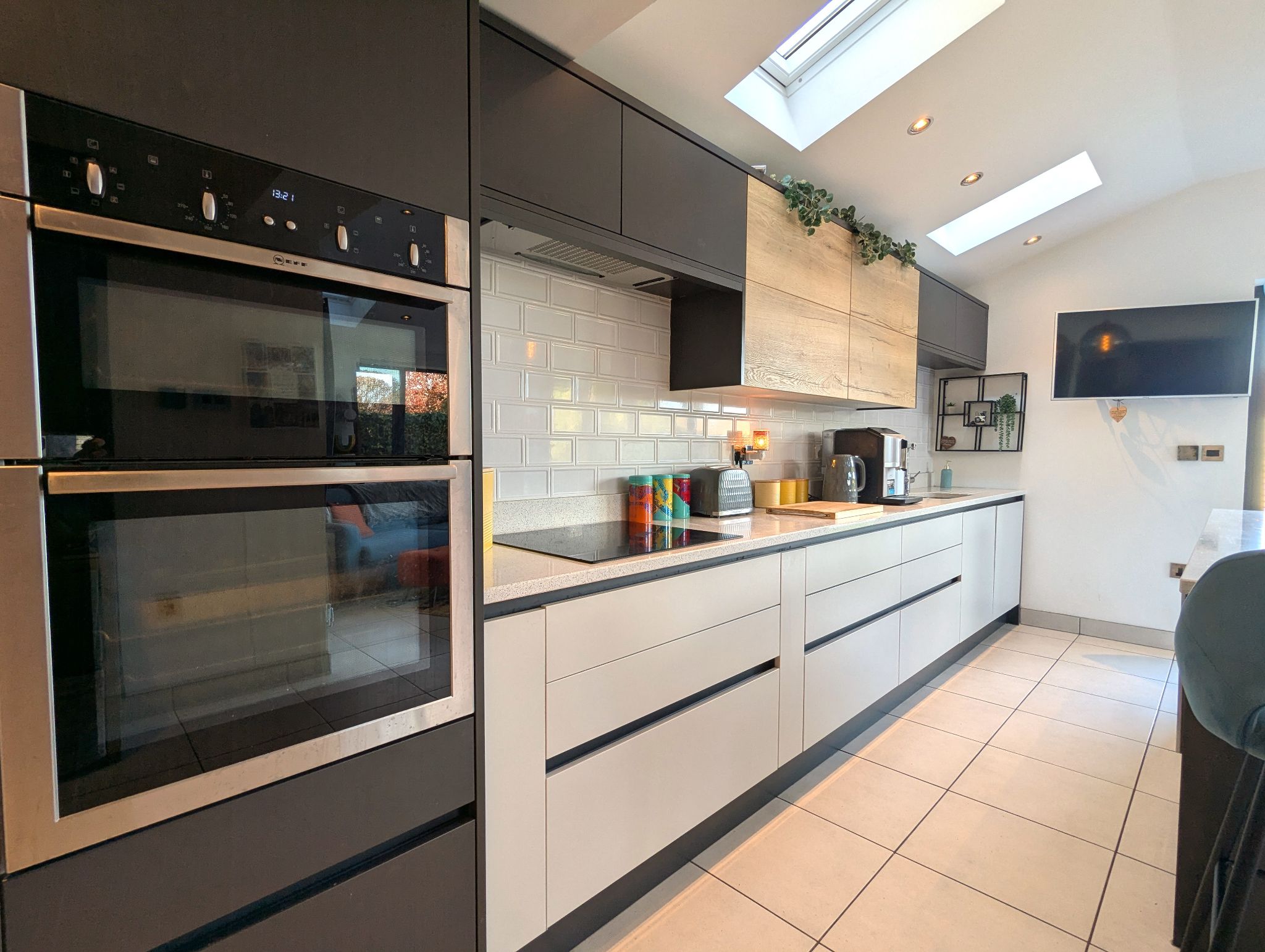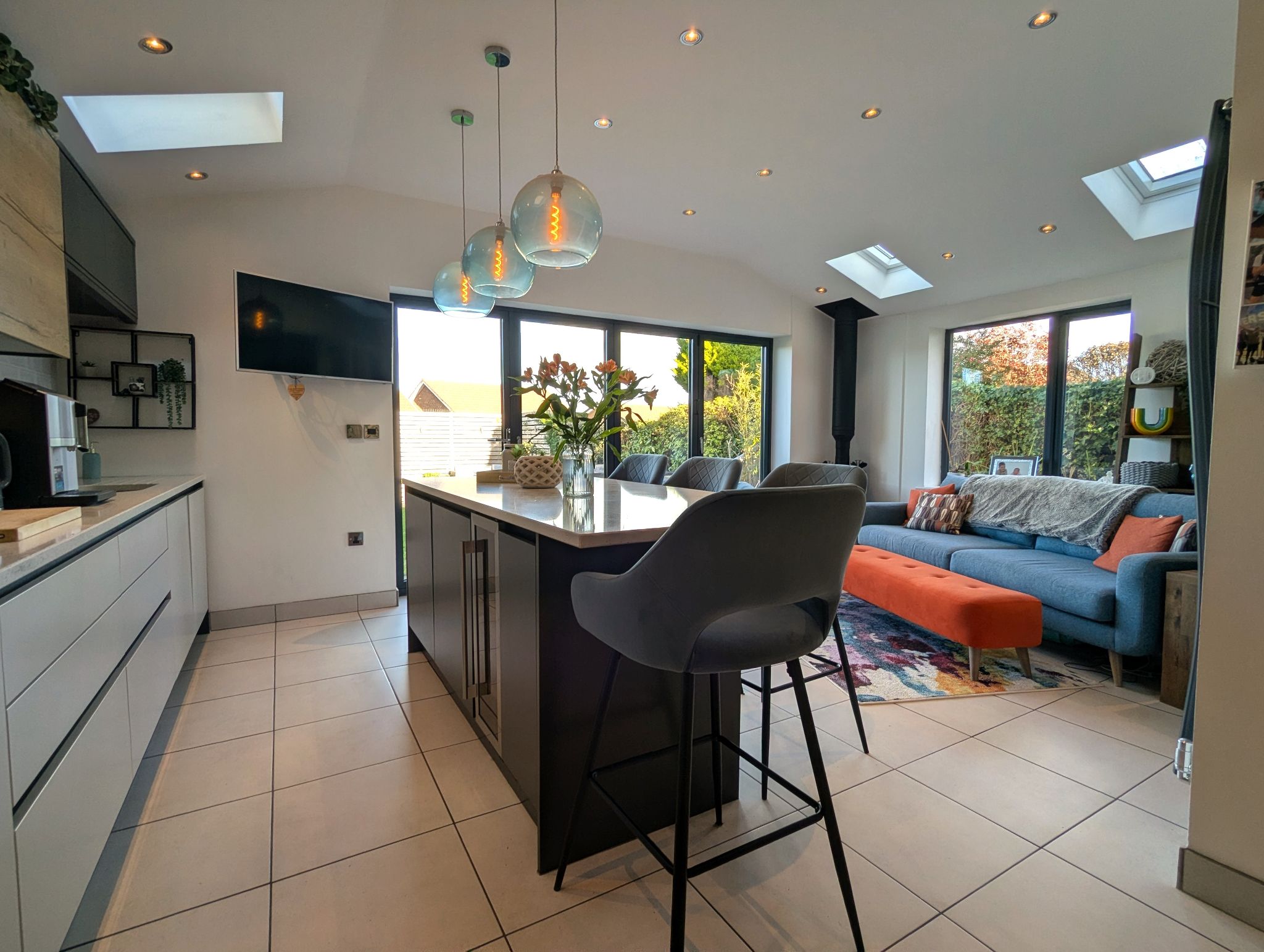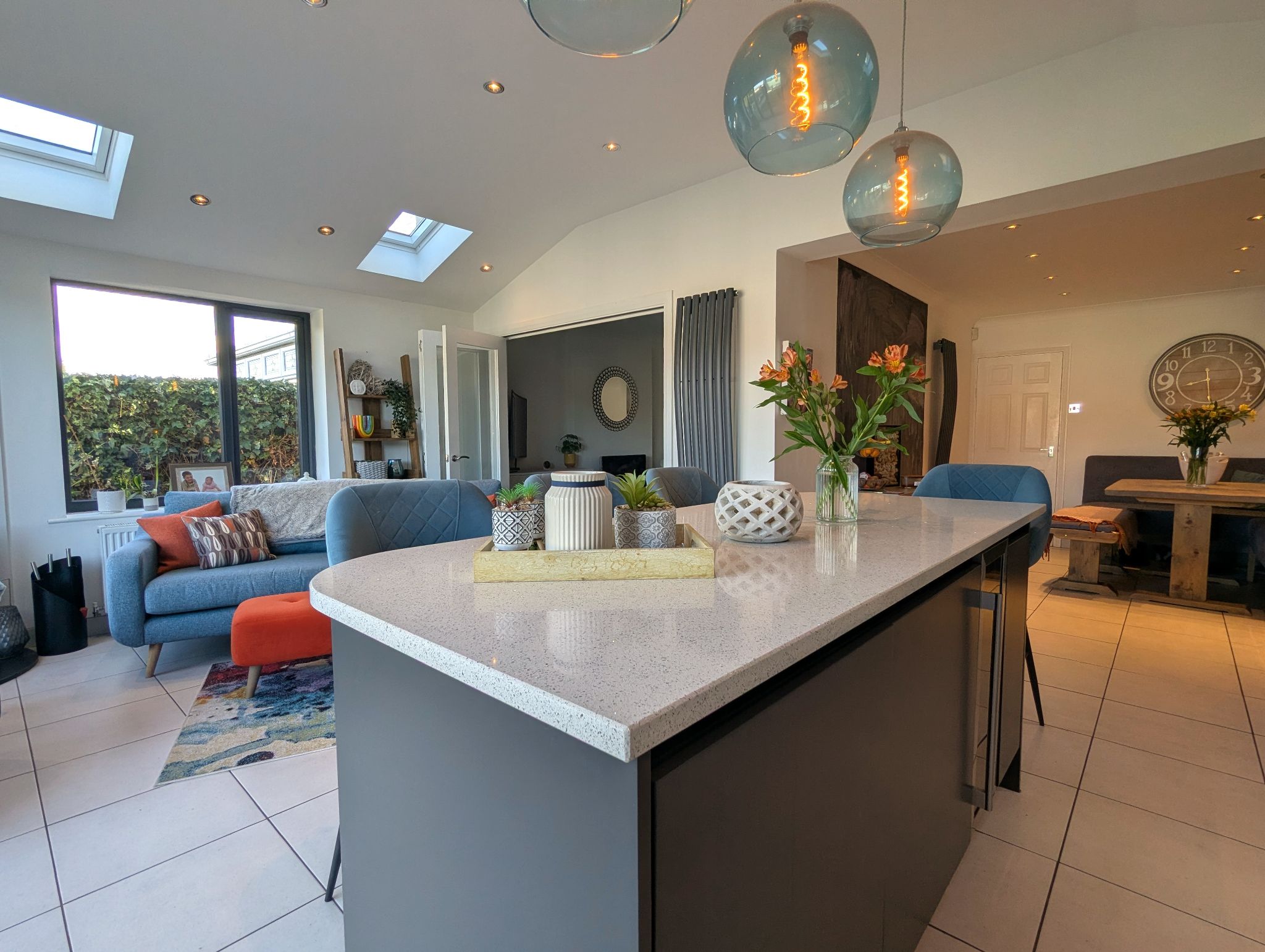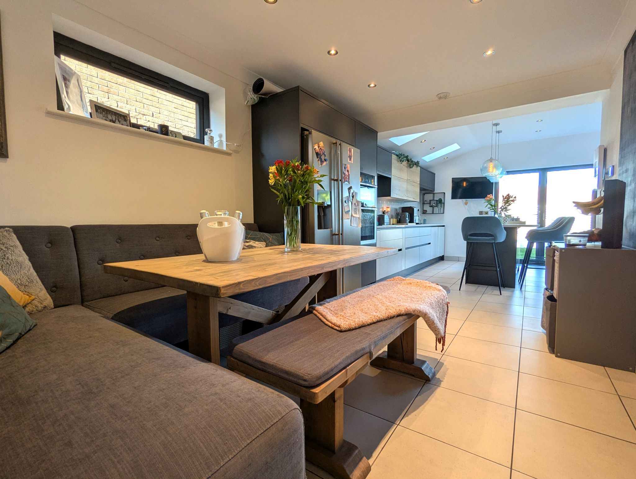Kitchen/Diner/Snug - 26'1 x 9'3 opening to 19' (7.97m x 2.86m opening to 5.81m) - The heart of the house! A stunning arrangement with tiled flooring, we first come upon a large dining area with a side-facing UPVC double glazed window, which leads onto an extension with a stunning kitchen range complete with island along with a snug area. The kitchen offers ample storage and work space with its many fitted units and sleek quartz work surfaces. Integrated appliances include a twin oven, induction hob with overhead extractor and dishwasher along with space for a freestanding American fridge/freezer. A stainless steel one-and-a-half sink with a mixer tap which provides instant boiling water and 2 wall mounted custom vertical radiators.