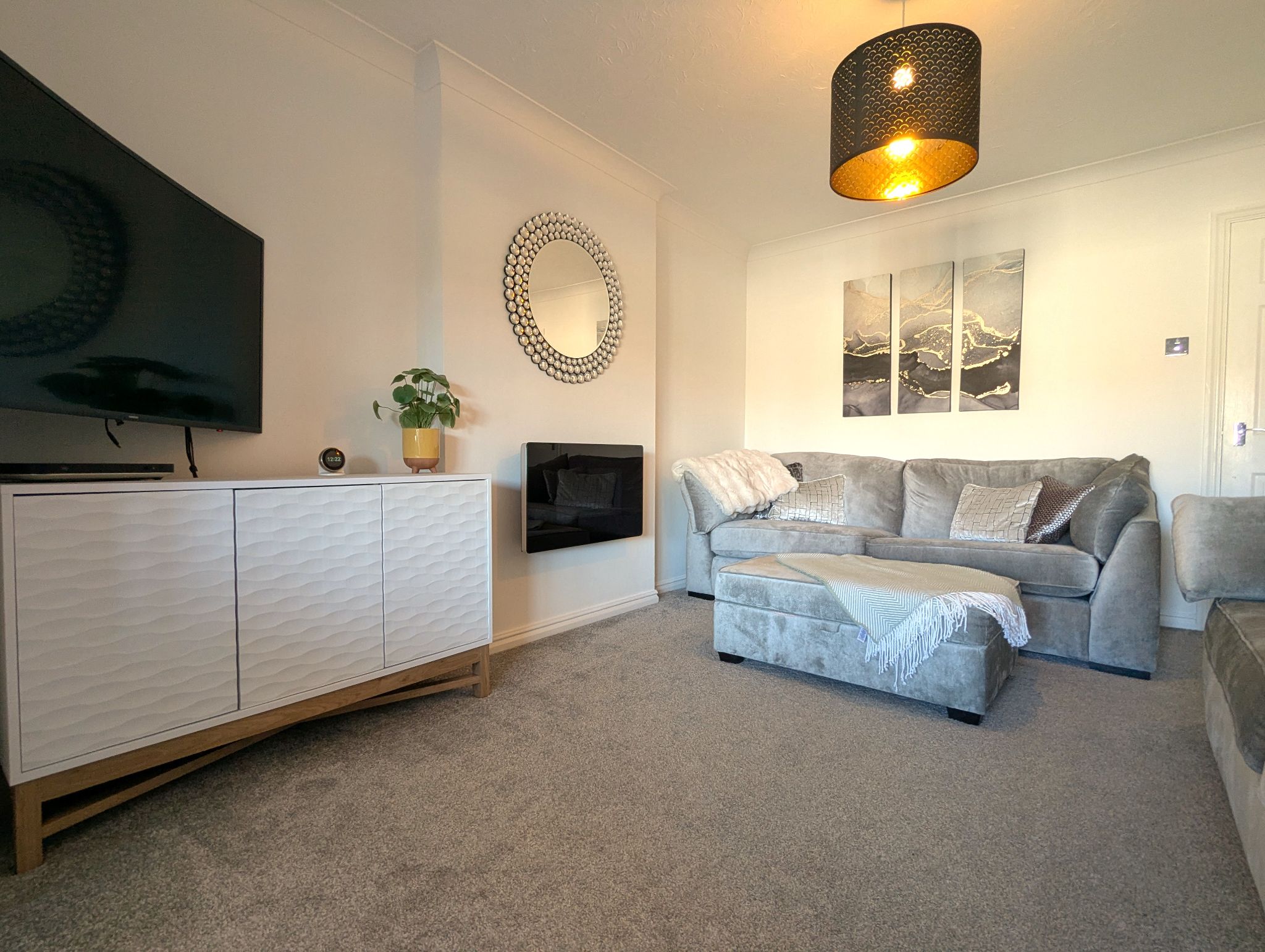 Lounge - 14'2 x 11'7 (4.34m x 3.58m) - A spacious carpeted lounge with internal bi-fold doors looking out onto the snug area in the extension. Gas fireplace and wall mounted radiator.