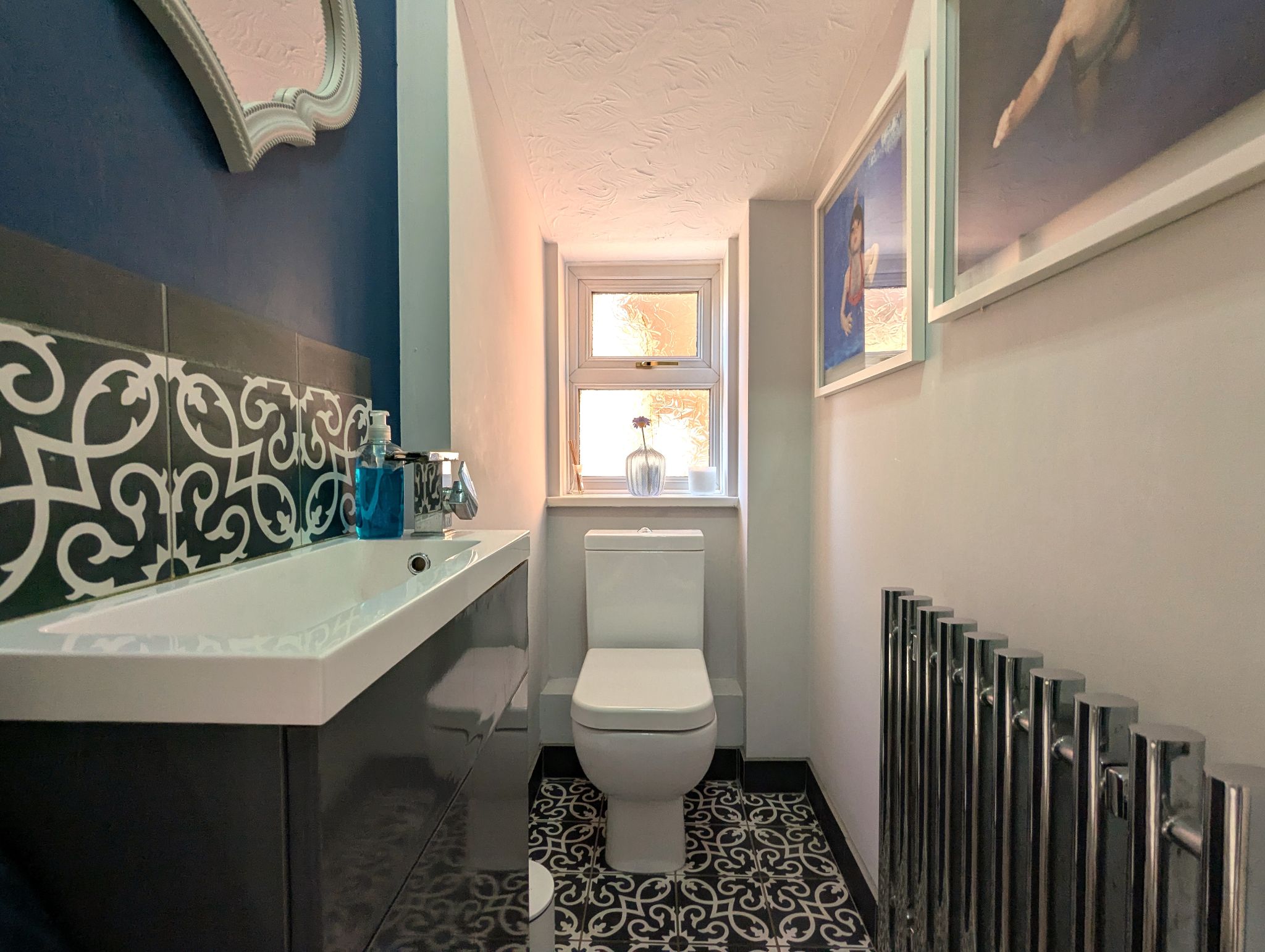 WC - Stylish ground floor WC with tiled flooring, toilet and wash basin, side-facing UPVC double glazed window and wall mounted radiator.