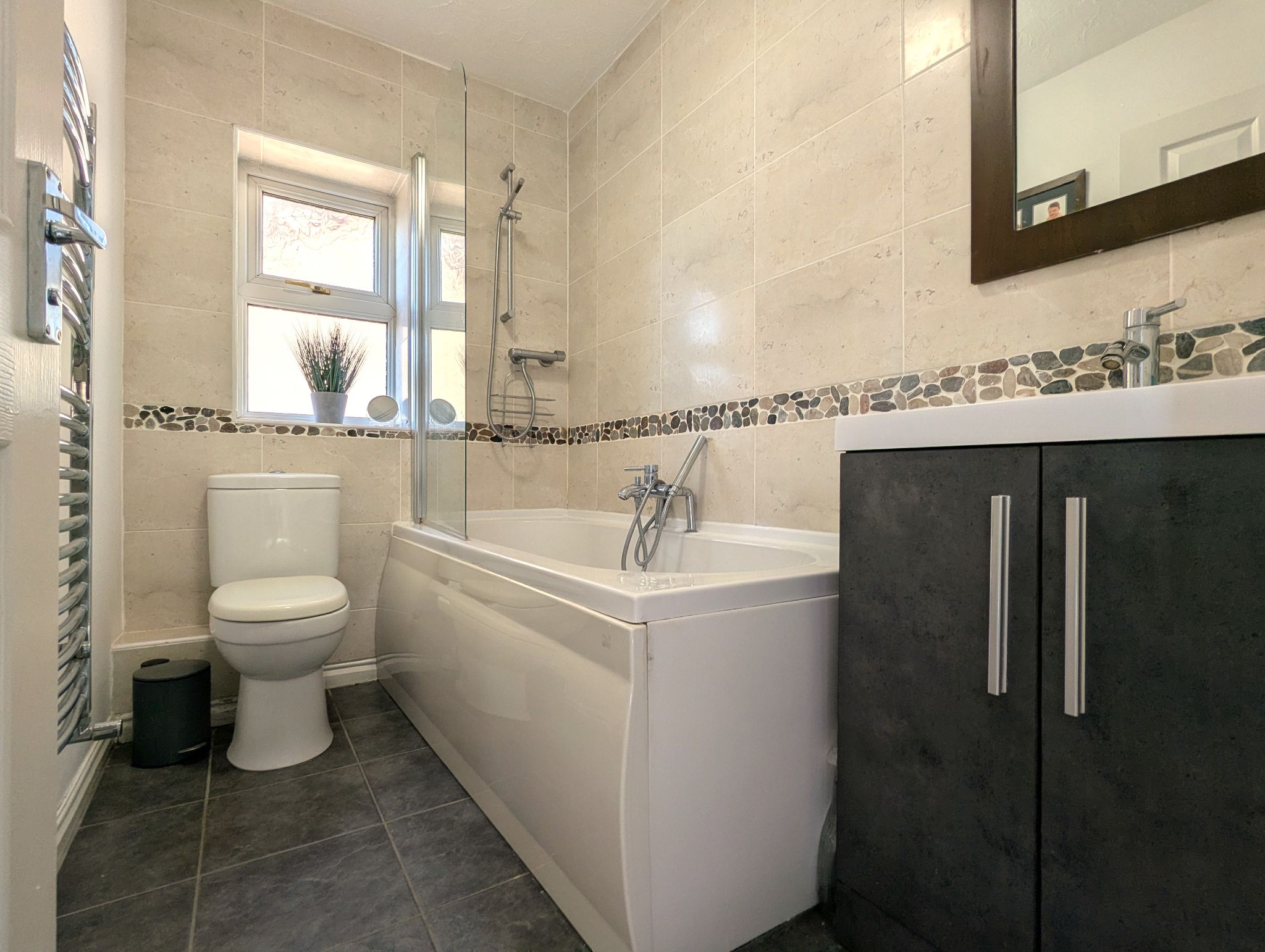 Family Bathroom - 4'9 x 7'7 (1.52m x 2.37m) - Tiled flooring and splashback with access to a toilet, vanity unit with fitted wash basin and bath with jetstreams and mixer supplied shower. Side-facing UPVC double glazed window, wall mounted heated towel rail and extractor fan.