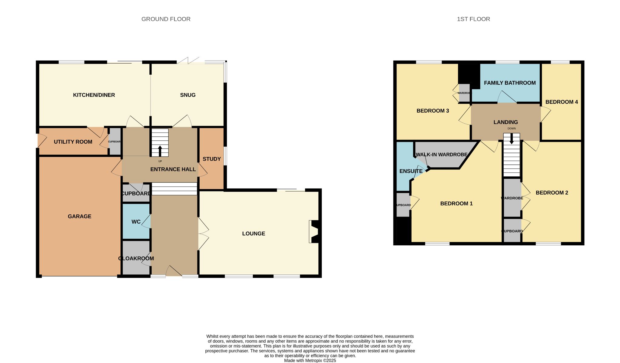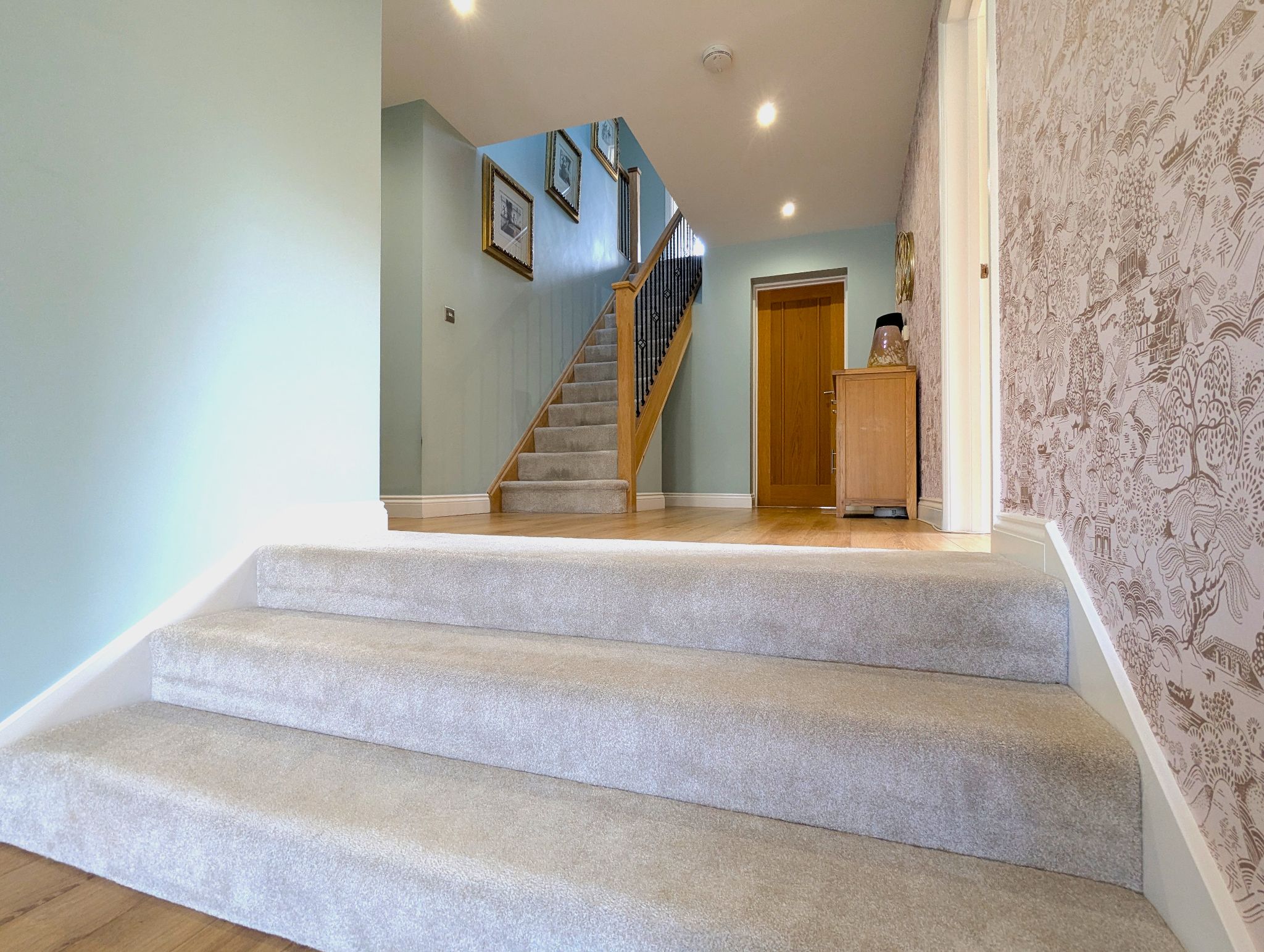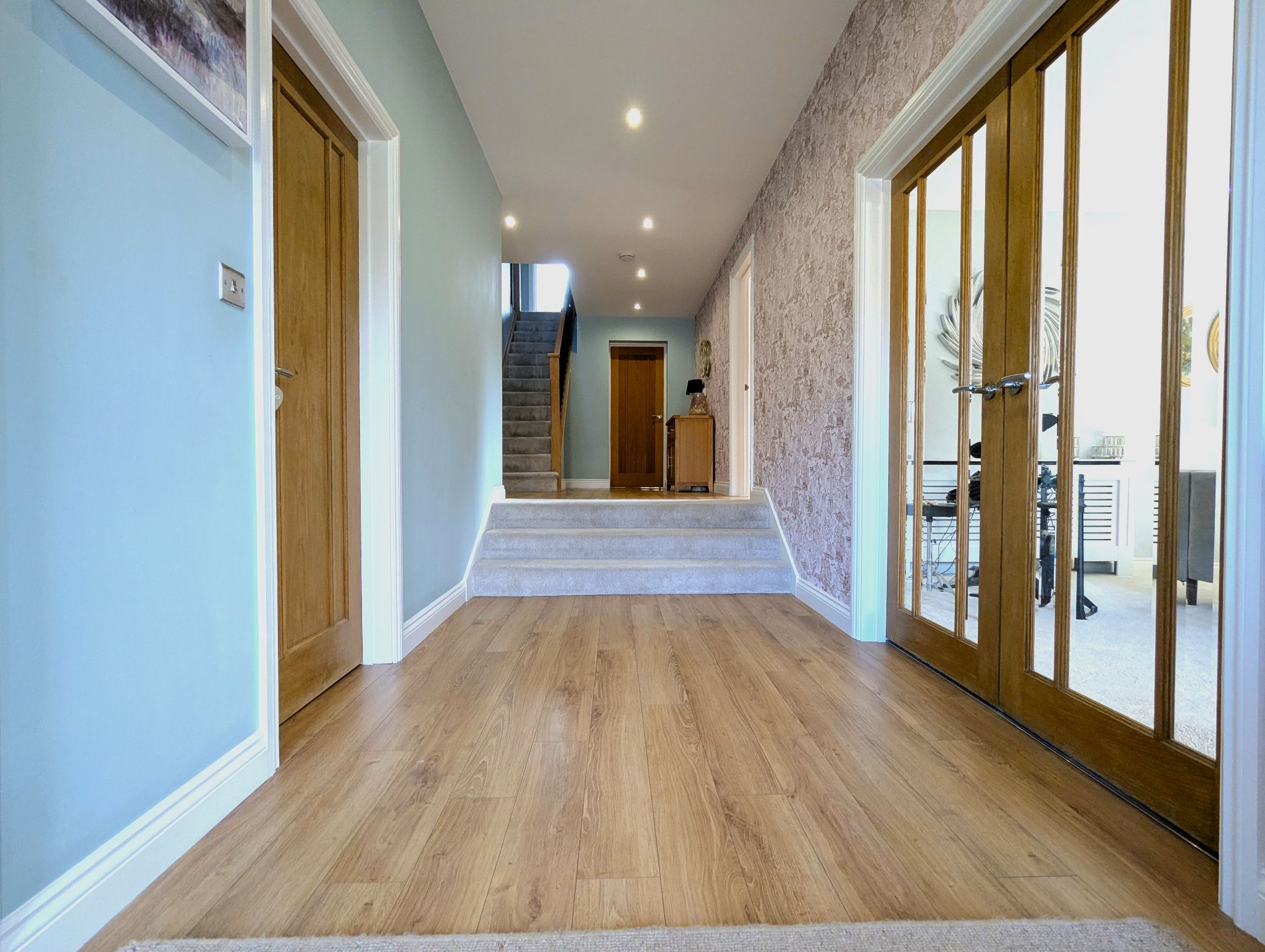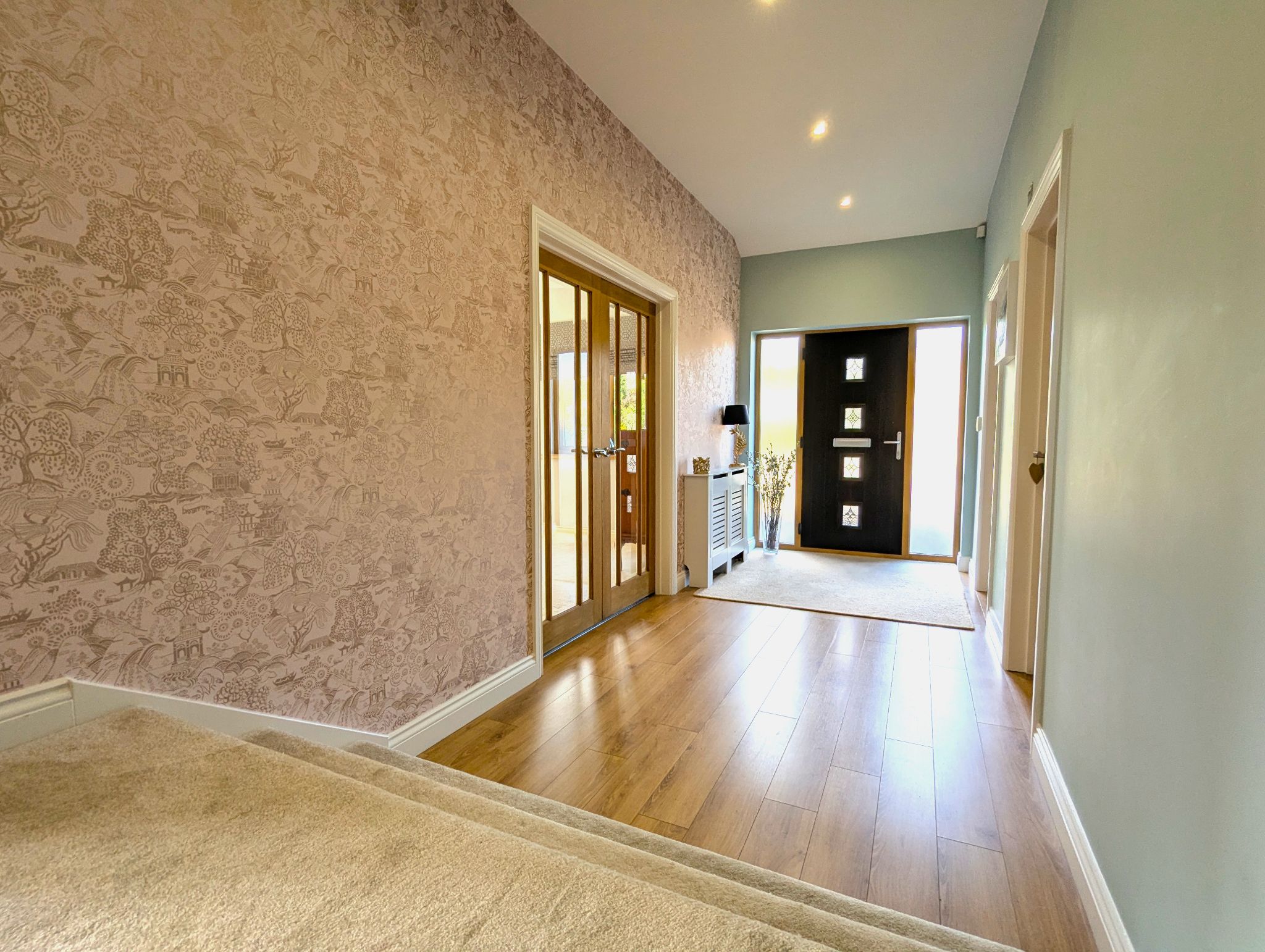 Entrance Hall Enter via a composite front door with front-facing UPVC windows to either side into a large entrance hall with laminate flooring, with access to a lounge via stunning glazed double French doors, a study, snug and kitchen/diner, WC, walk-in cloakroom and separate walk-in cupboard, side access to the garage via a side wing of the hall which also leads to the kitchen/diner and carpeted staircase with a solid oak banister with metallic spindles leading to the first floor. The rear of the hall is slightly elevated beyond a set of carpeted steps. Enclosed wall mounted radiator.