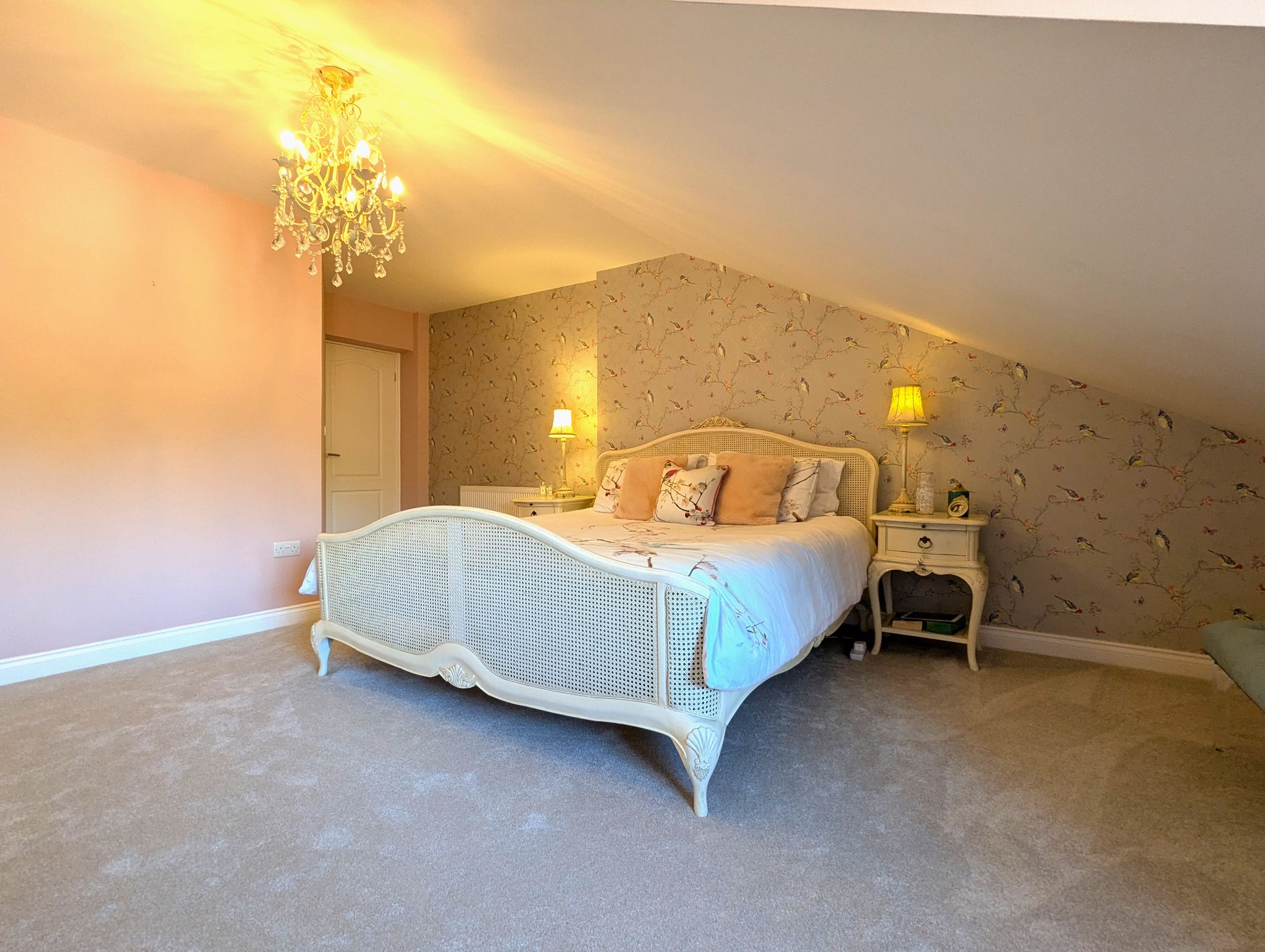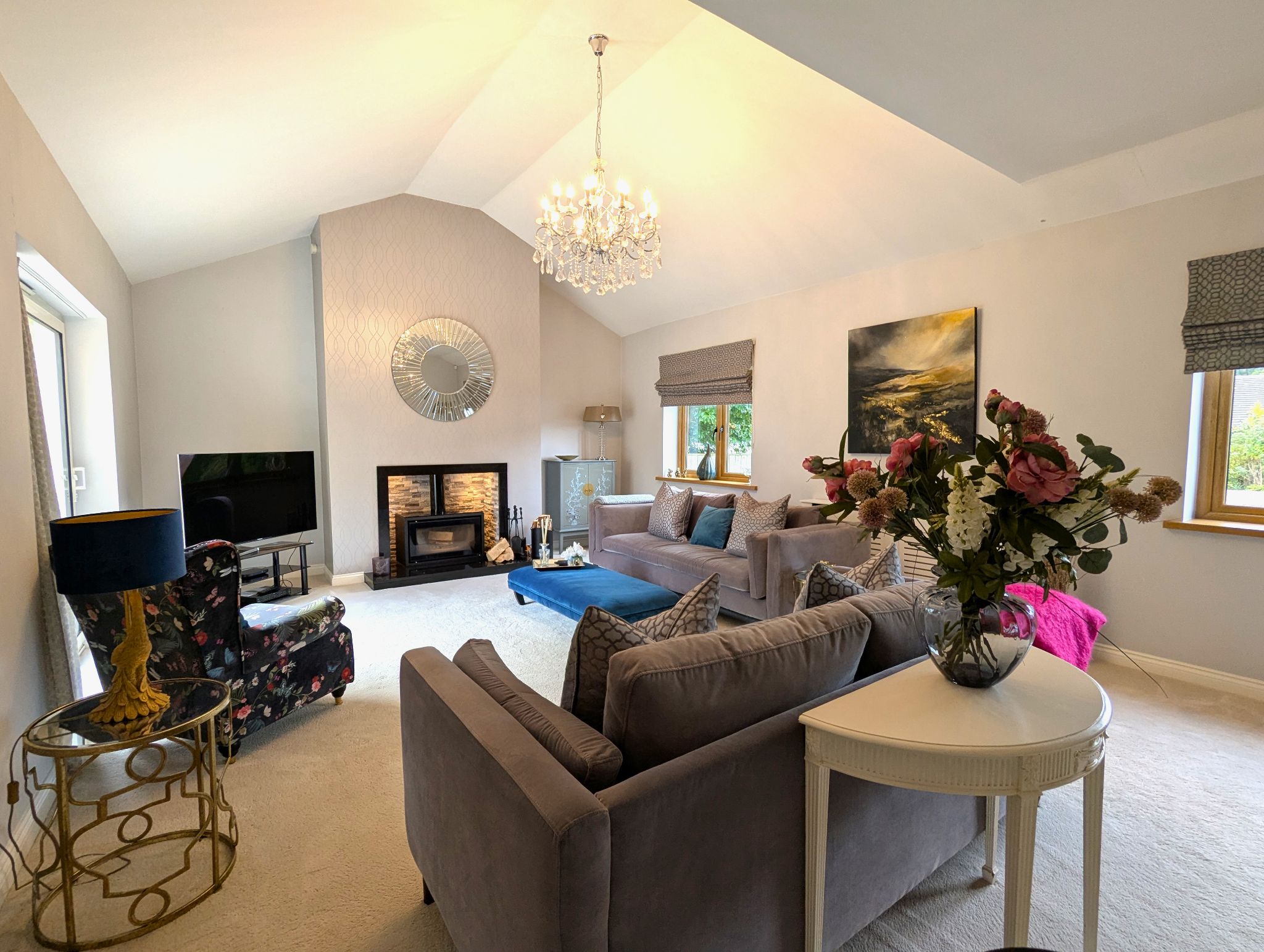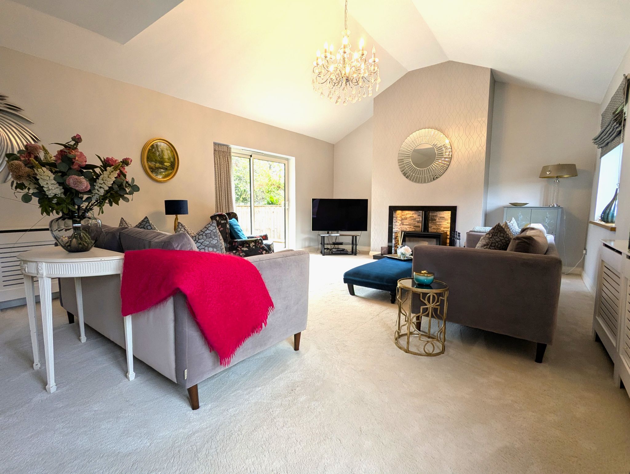 Lounge 15’5 x 22’6 (4.75m x 6.91m) A bright, airy and super spacious lounge with carpeted flooring, 2 front-facing wood effect UPVC double glazed windows and a rear-facing UPVC sliding patio door allows the room to fill with natural light. A 5kW multi-stove burner with a superb surround and down lighting as the rooms feature centrepiece. 2 enclosed wall mounted radiators and a stunning chandelier in a vaulted ceiling.