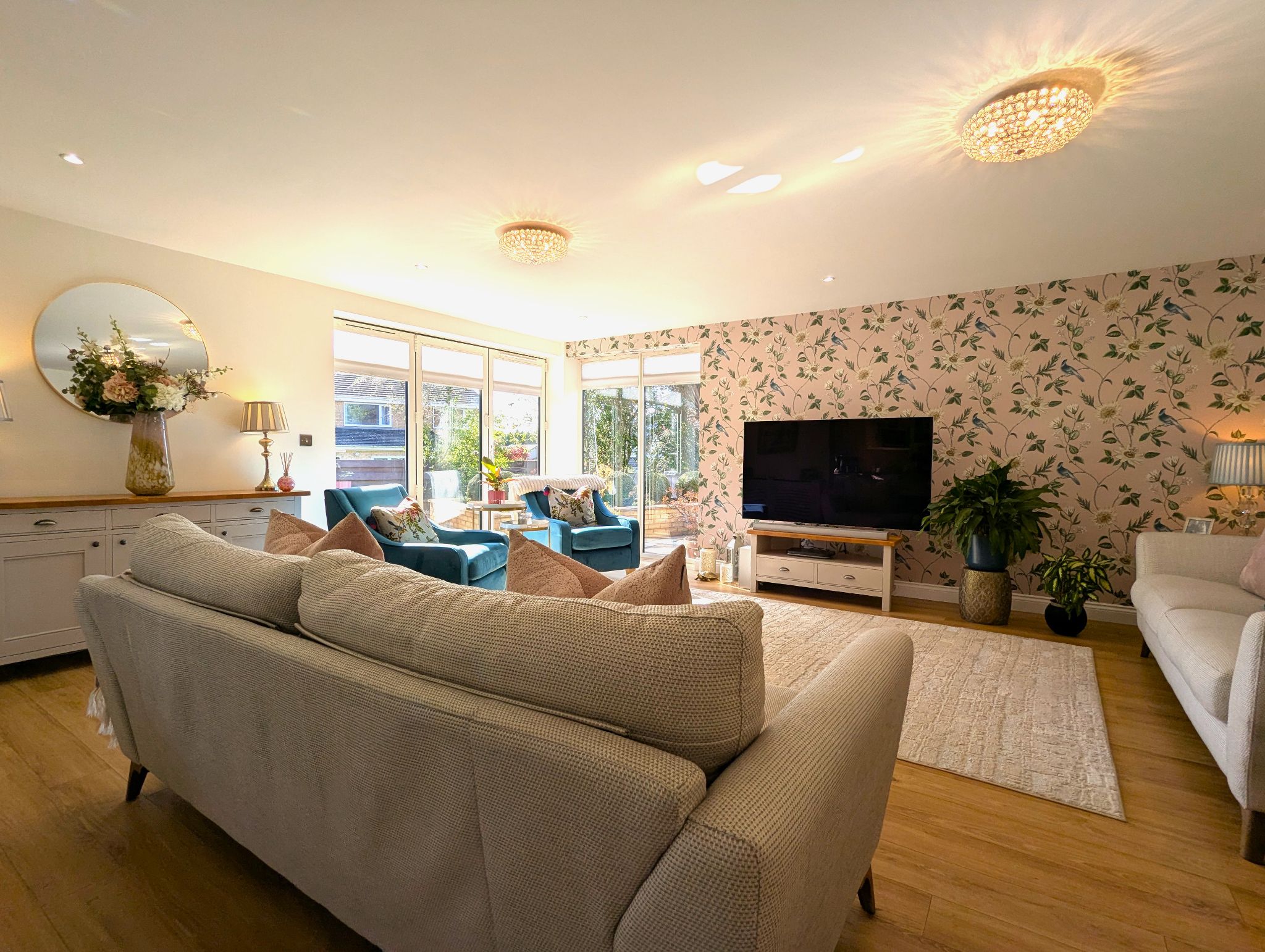 Snug 20’1 x 16’ (6.13m x 4.89m) The same laminate flooring continues through from the hall to this amazingly spacious snug area which has an open plan aspect with the kitchen/diner. With a wall-to-ceiling corner UPVC double glazed window alongside a rear-facing UPVC bi-folding door looking out onto the rear garden. 2 enclosed wall mounted radiators.