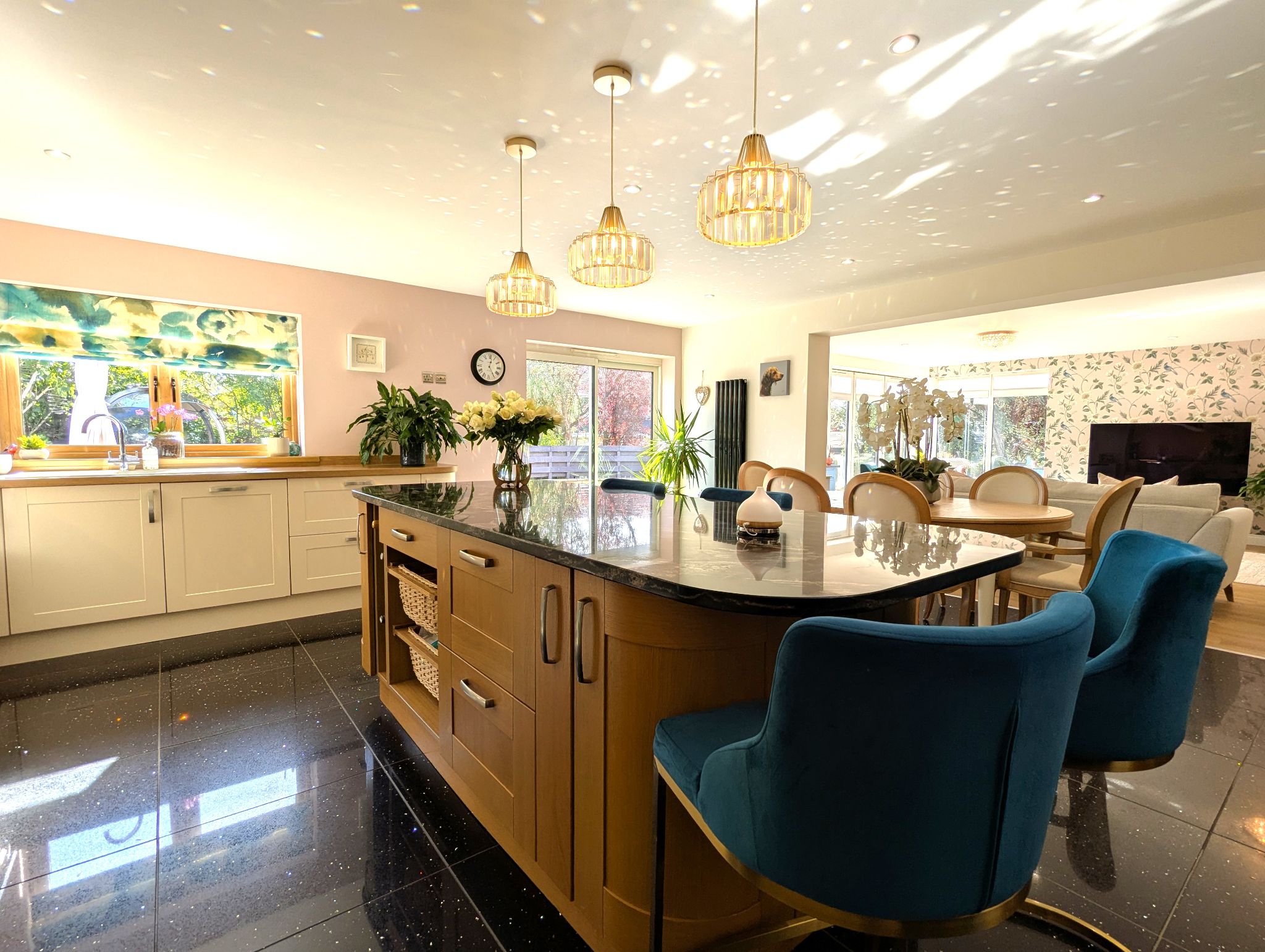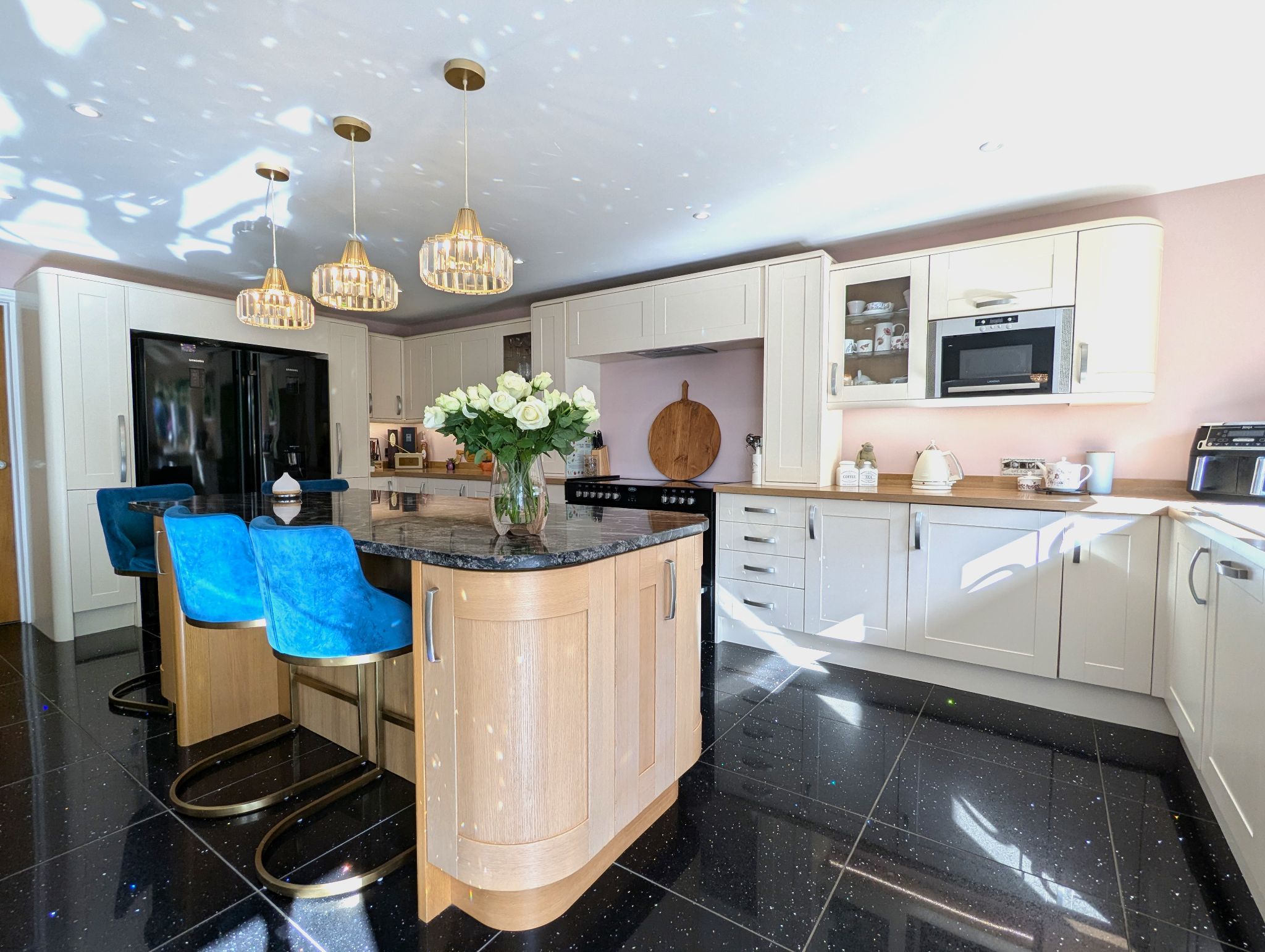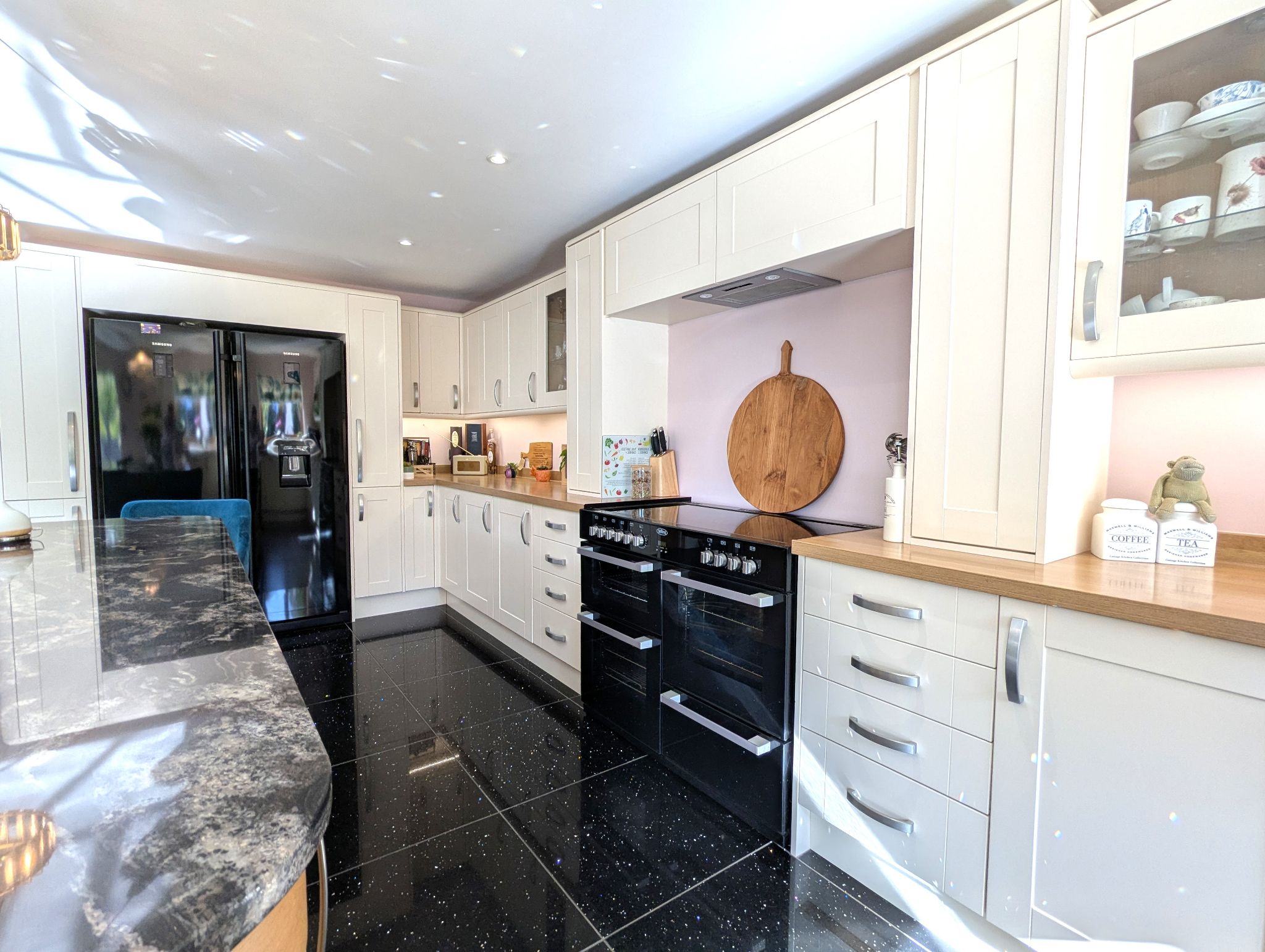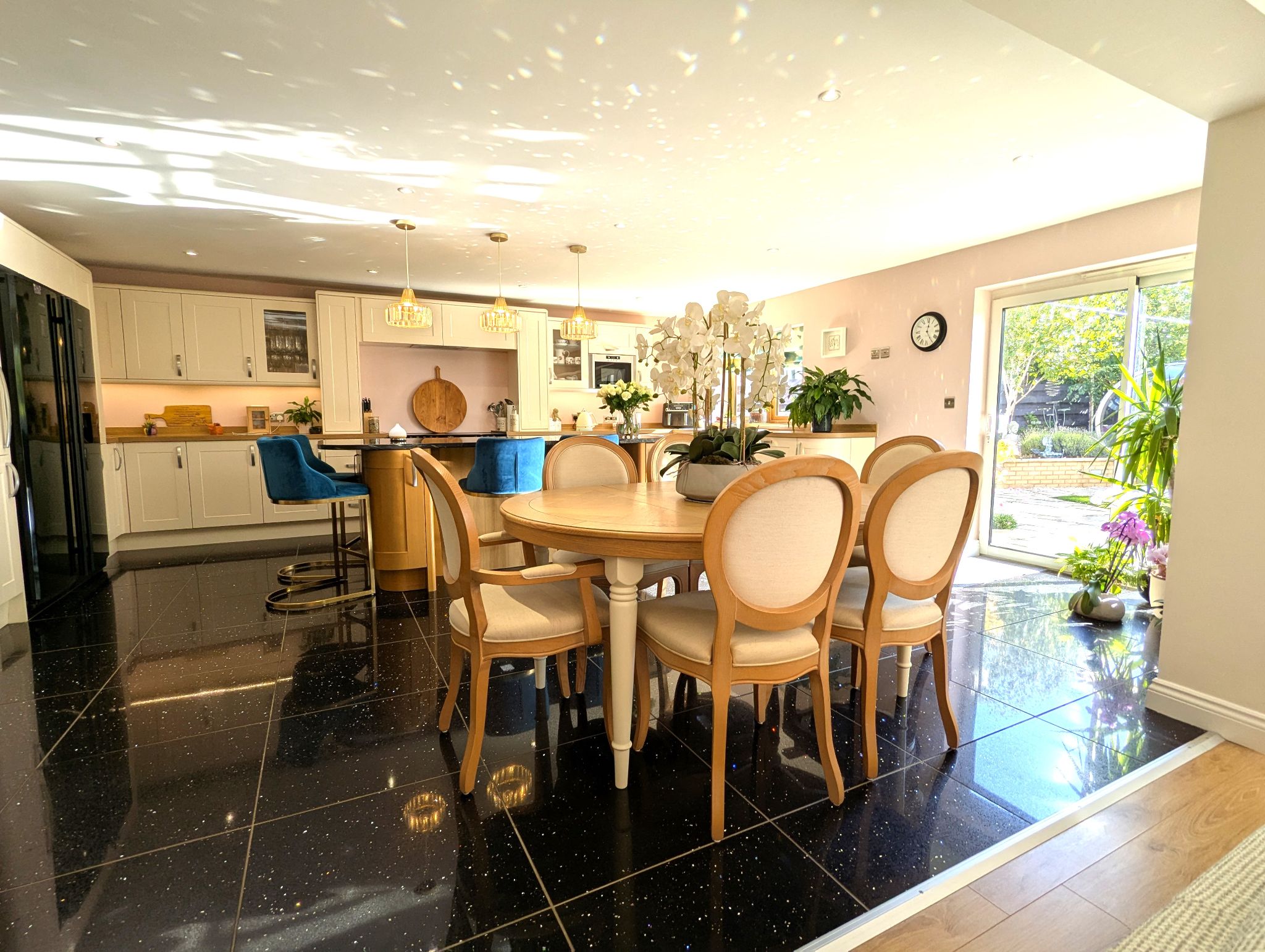 Kitchen/Diner 20’1 x 18’ (6.14m x 5.51m) A vast, grand and stylish kitchen range further complimented with a large island finished with a granite work surface, breakfast bar and retractable sockets. With granite floor tiling throughout, the kitchen offers a multitude of storage and work space. A custom design alcove for an all electrical Belling Range cooker with overhead extractor and further custom design to accommodate for an American style fridge/freezer. Integrated dishwasher. Composite one-and-a-half sink with mixer tap below a rear-facing wood effect UPVC double glazed window. UPVC double glazed sliding patio door leading to the rear garden. Dining area for a six-seater dining table and access to a utility.