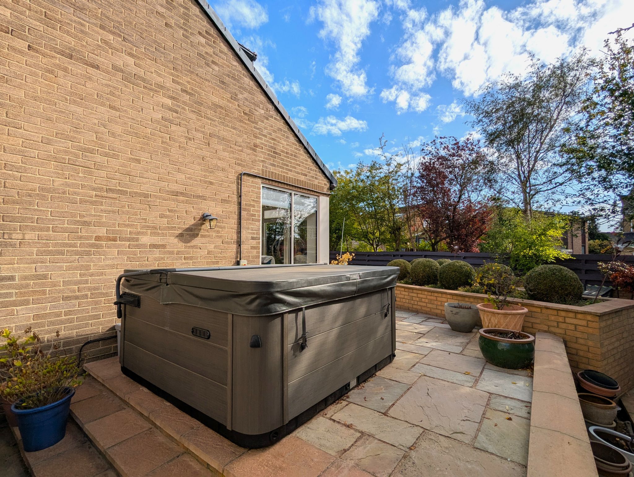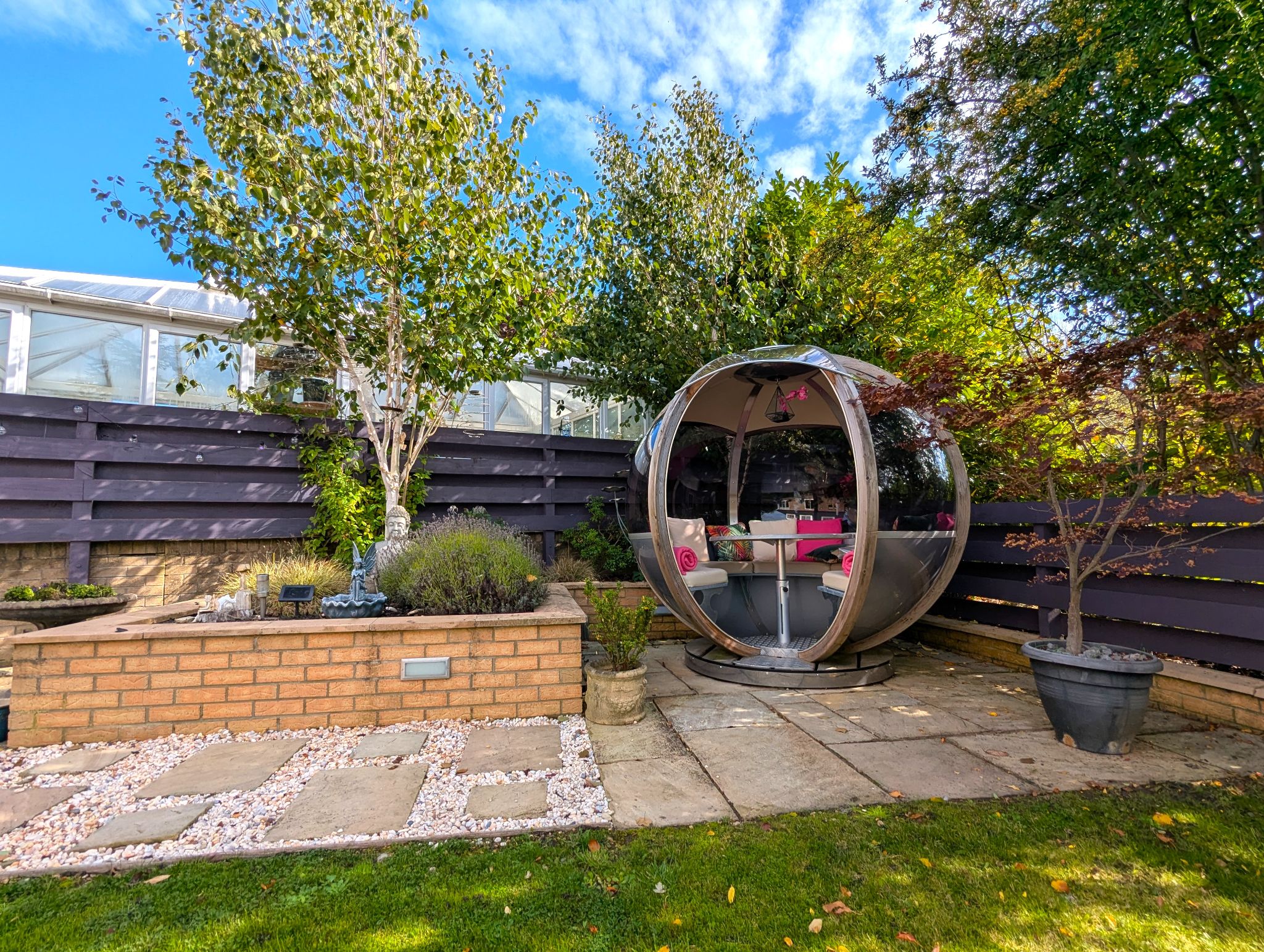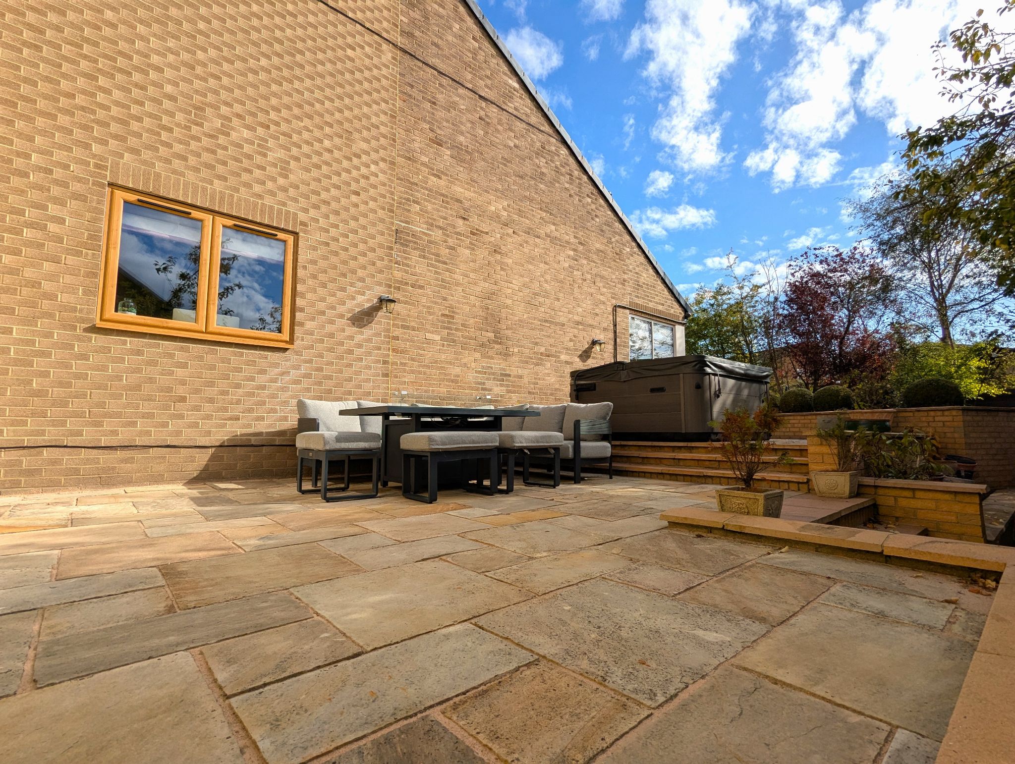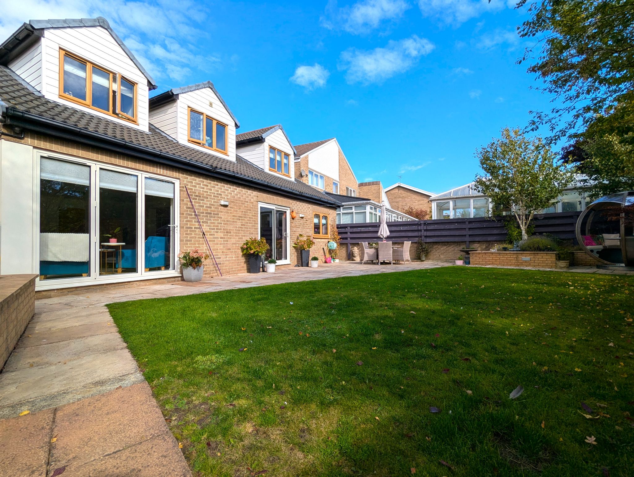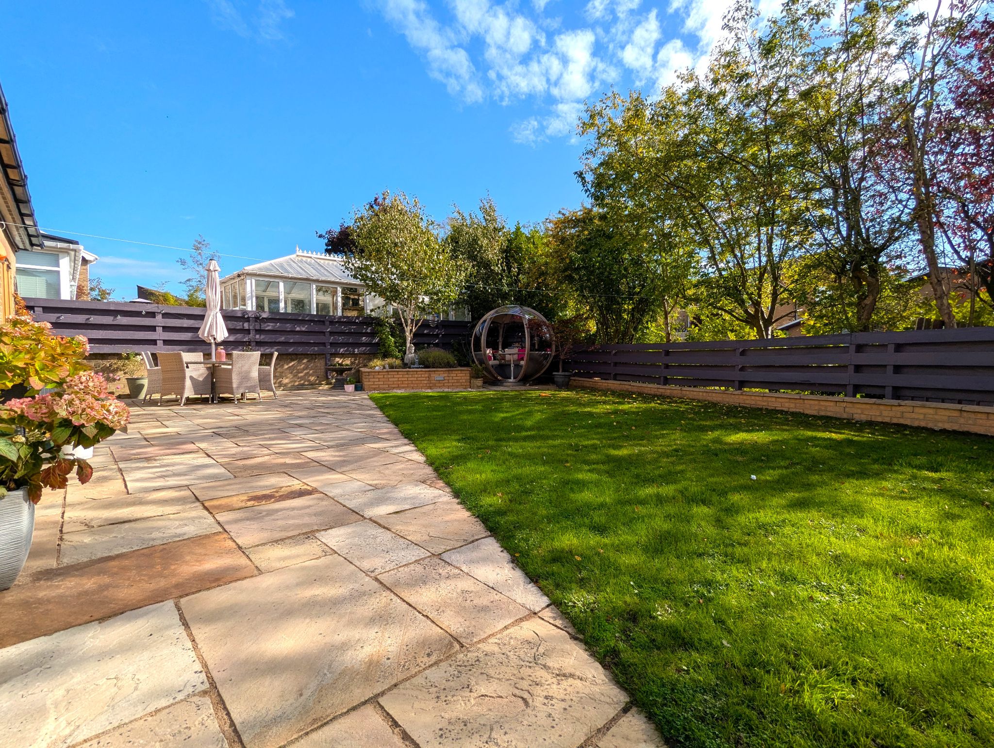 Rear Garden An impressive and beautifully presented South-Westerly garden with a large lawned area, 2 patio areas, hot tub and a stunning garden pod.