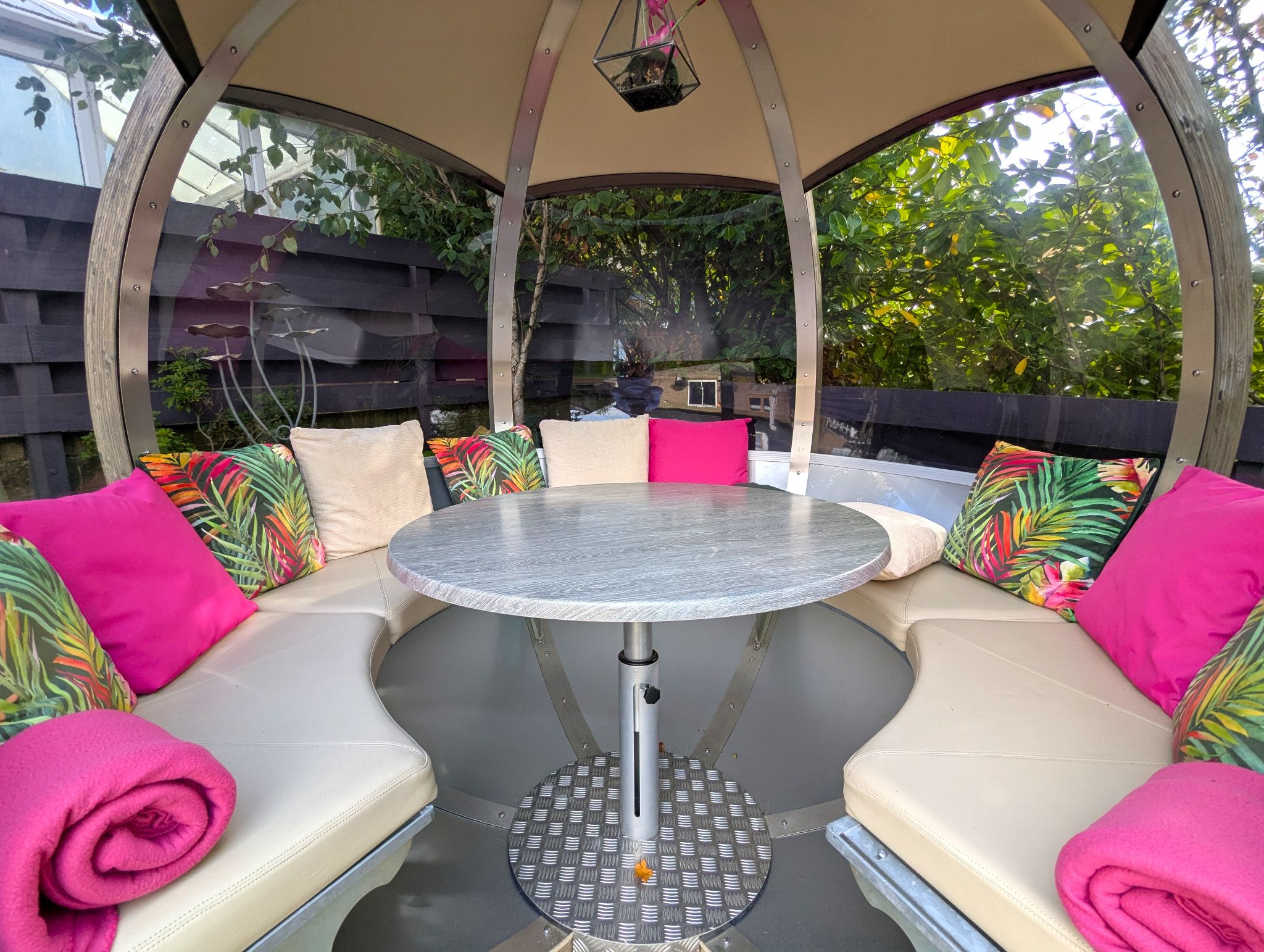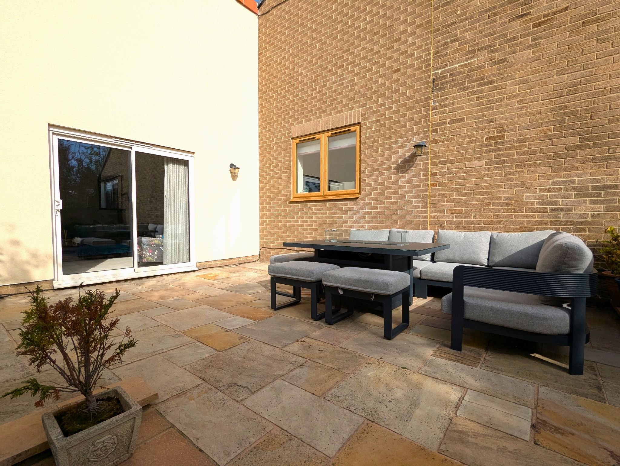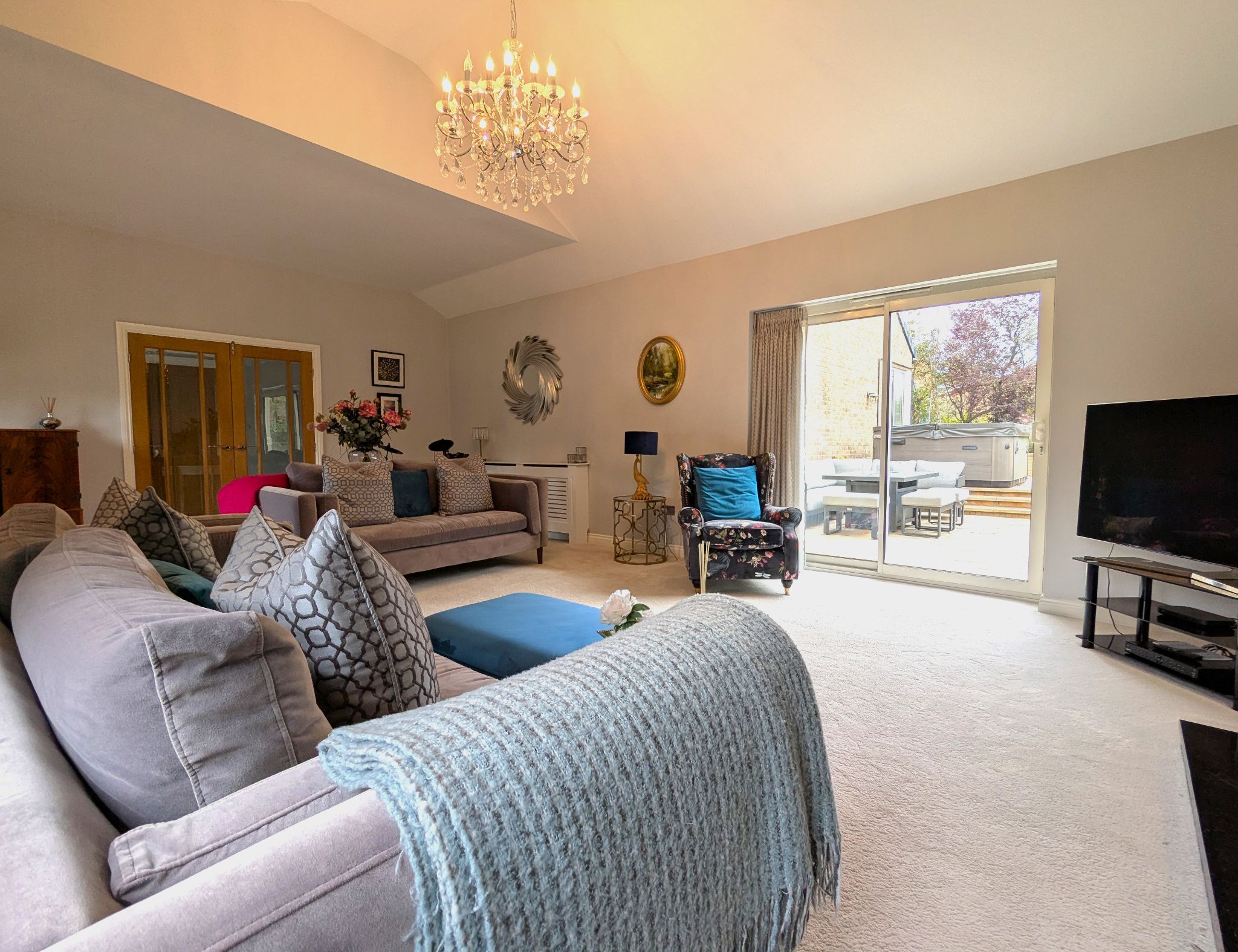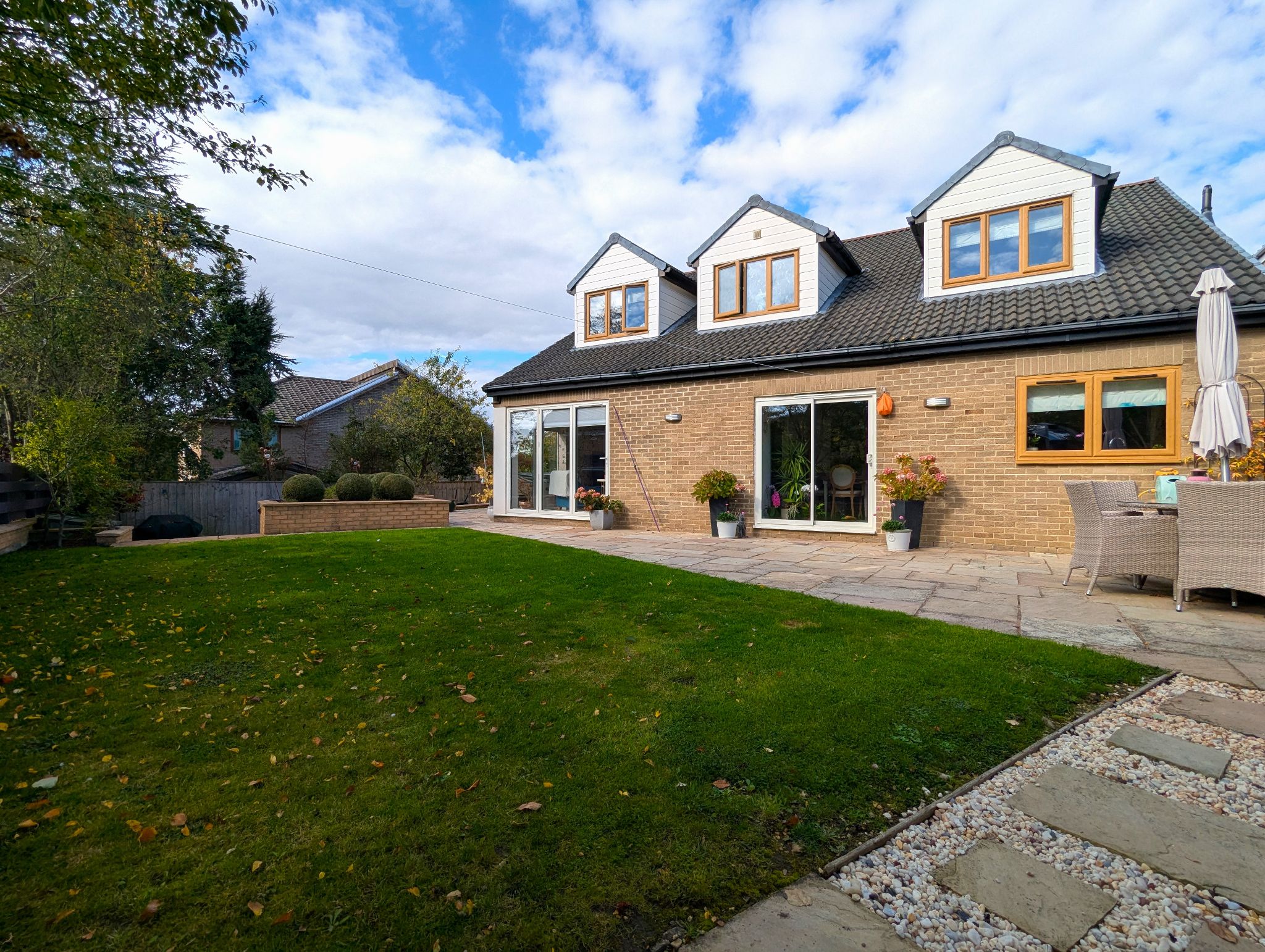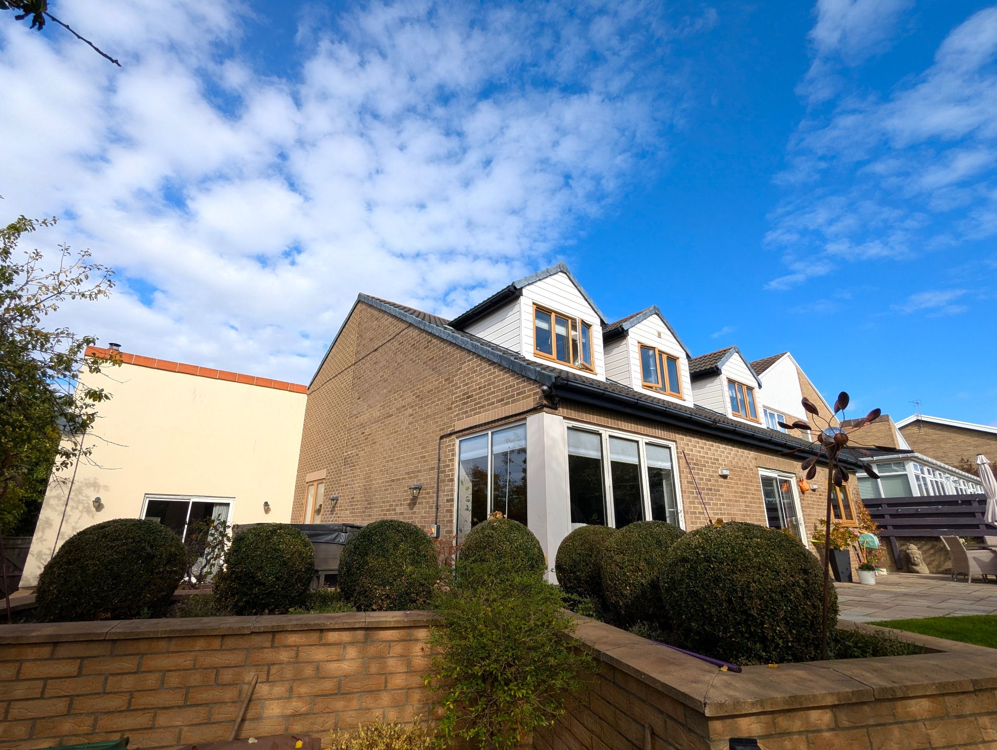 Rear Garden An impressive and beautifully presented South-Westerly garden with a large lawned area, 2 patio areas, hot tub and a stunning garden pod.