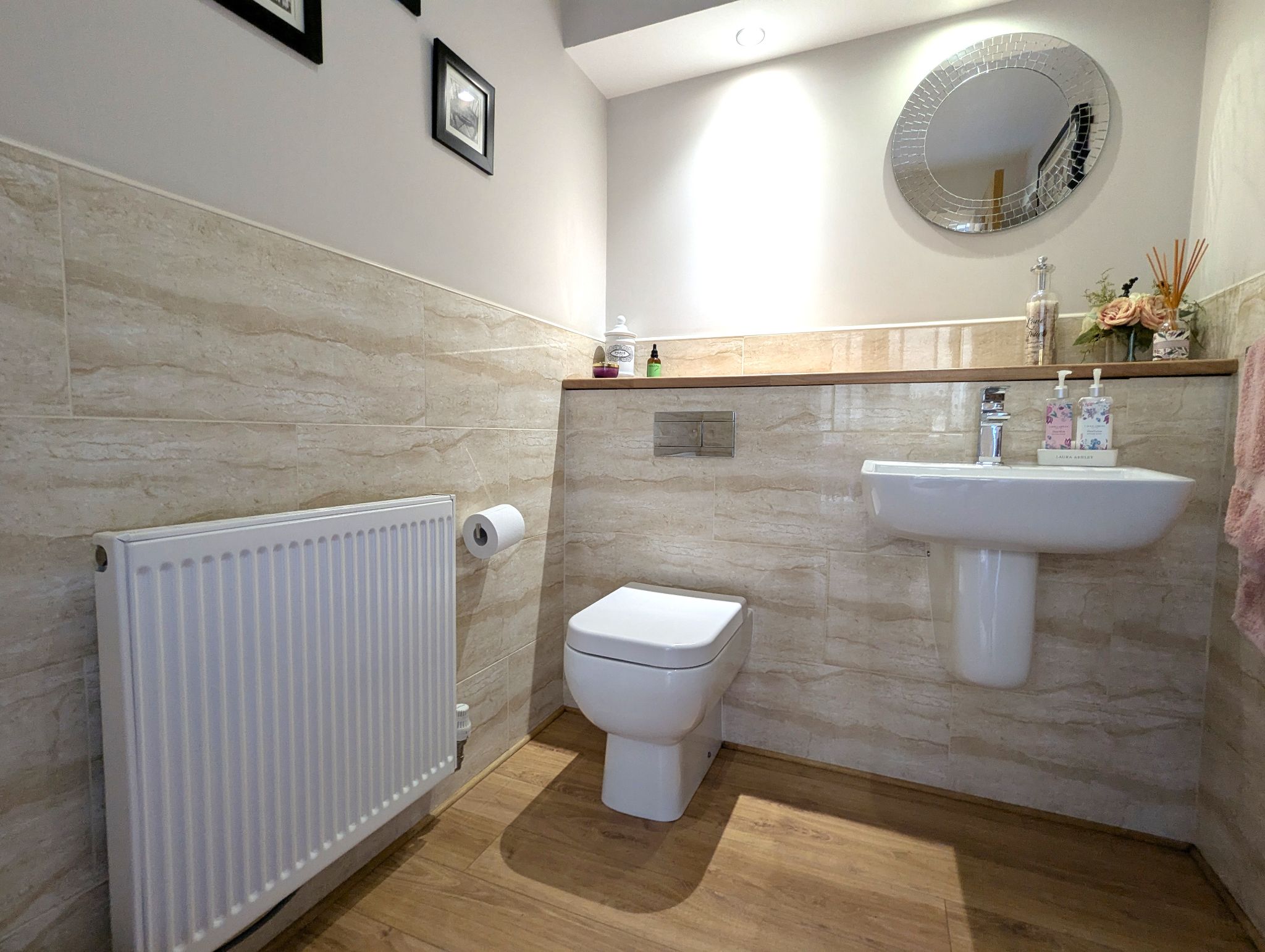 WC 4’7 x 5’9 (1.46m x 1.81m) Laminate flooring and low-height tiled splashback. Access to a toilet and wash basin. Wall mounted radiator and extractor fan.