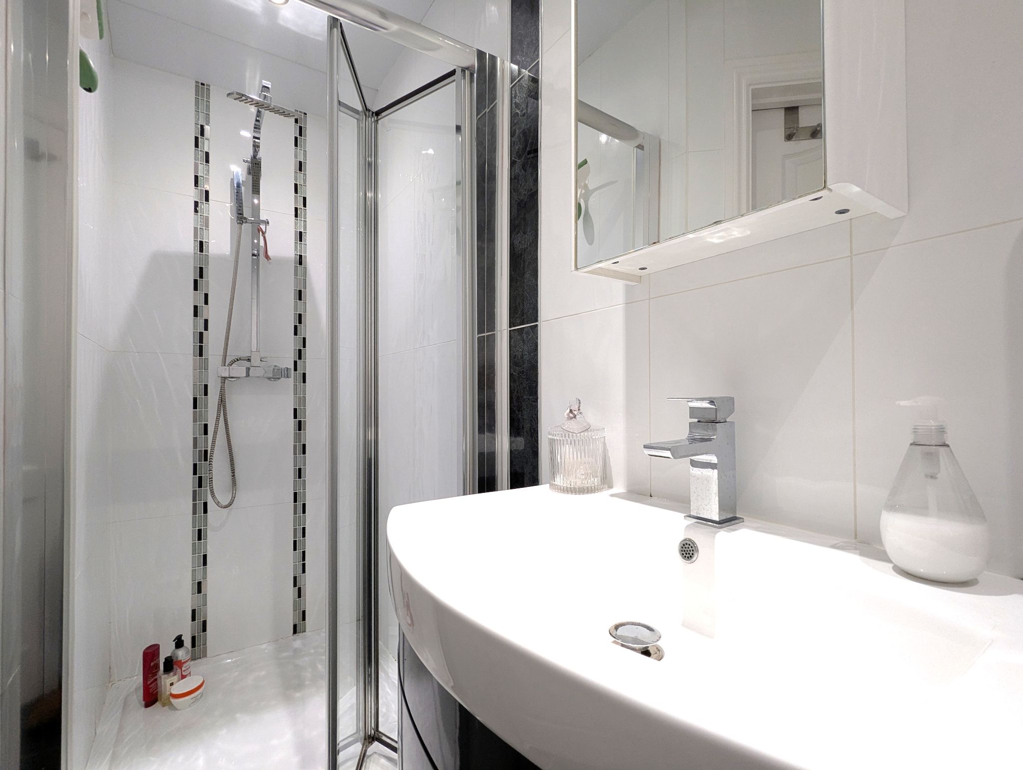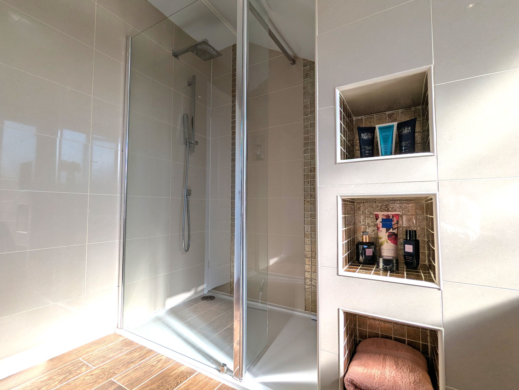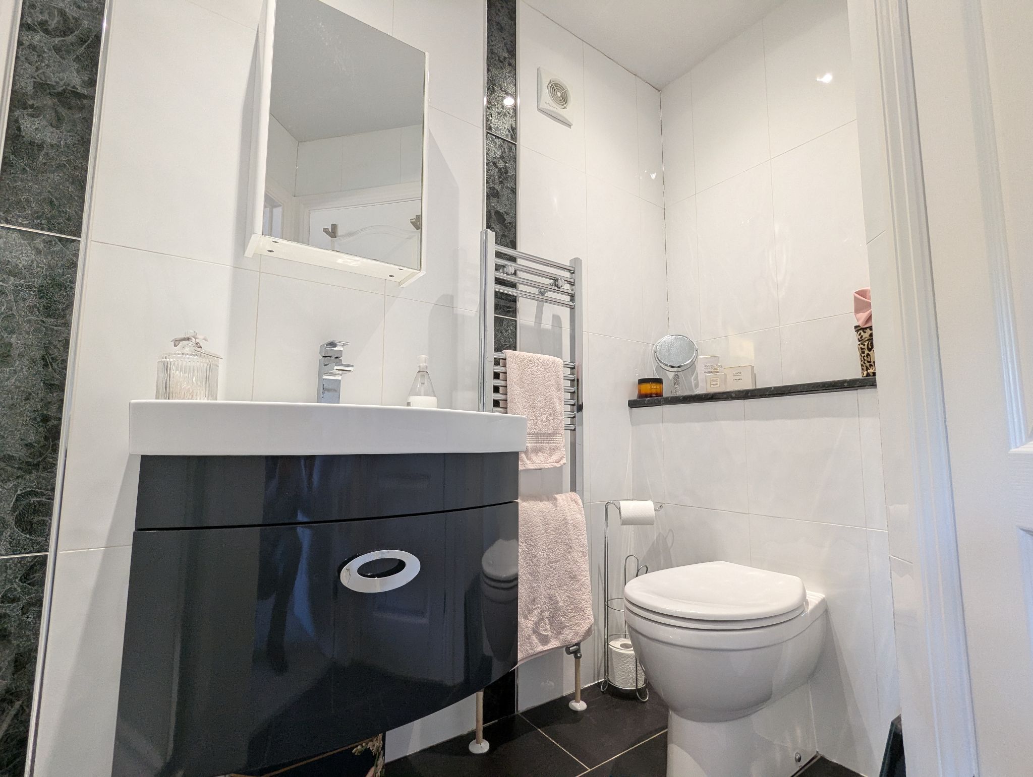 Ensuite 10’ x 4’6 (3.05m x 1.42m) Tiled flooring with a full-height tiled splashback. Access to a toilet, vanity unit with a fitted wash basin, shower cubicle with a mains supplied rainfall style mixer shower and walk-in wardrobe. Wall mounted heated towel rail and extractor fan.