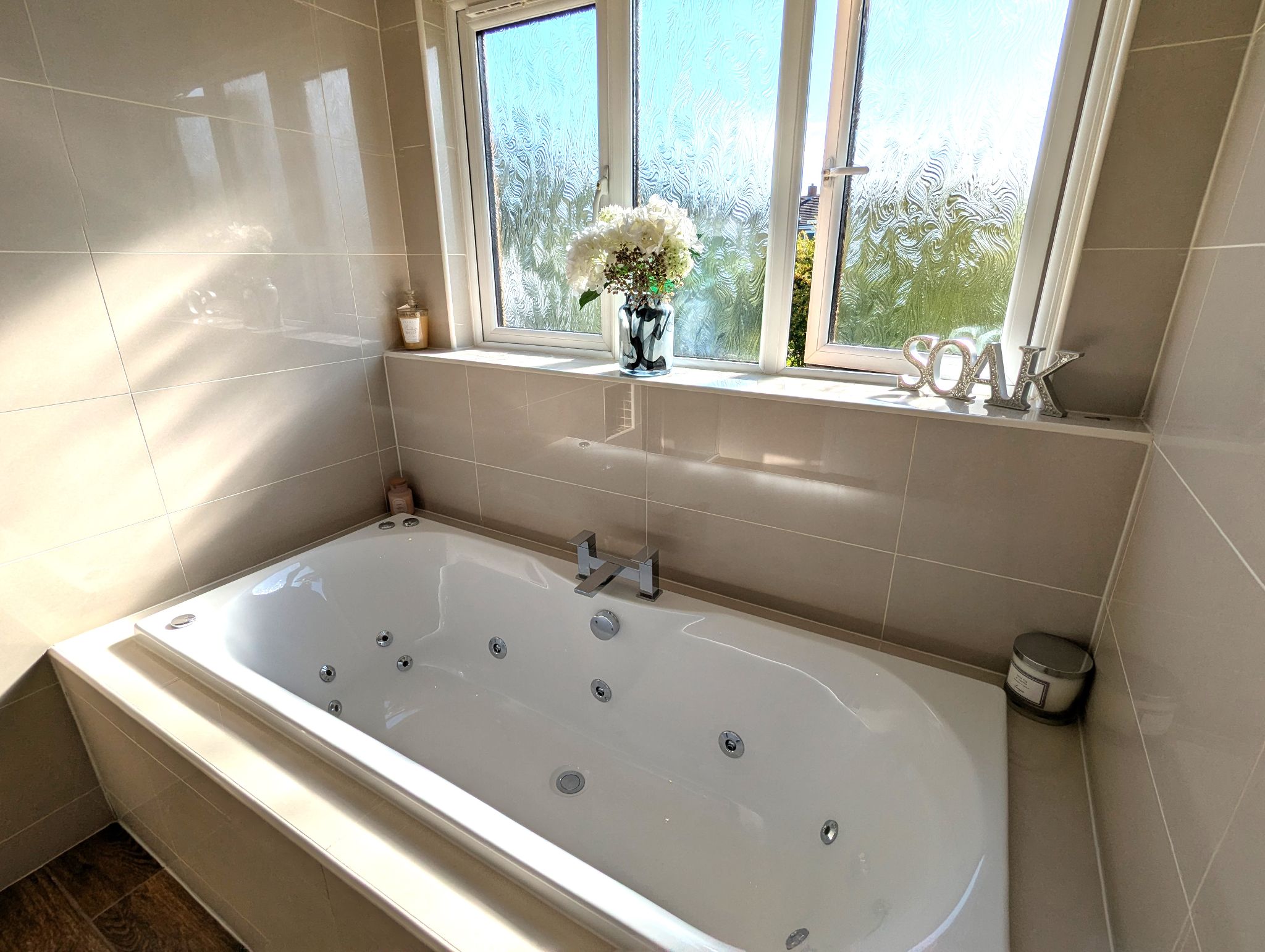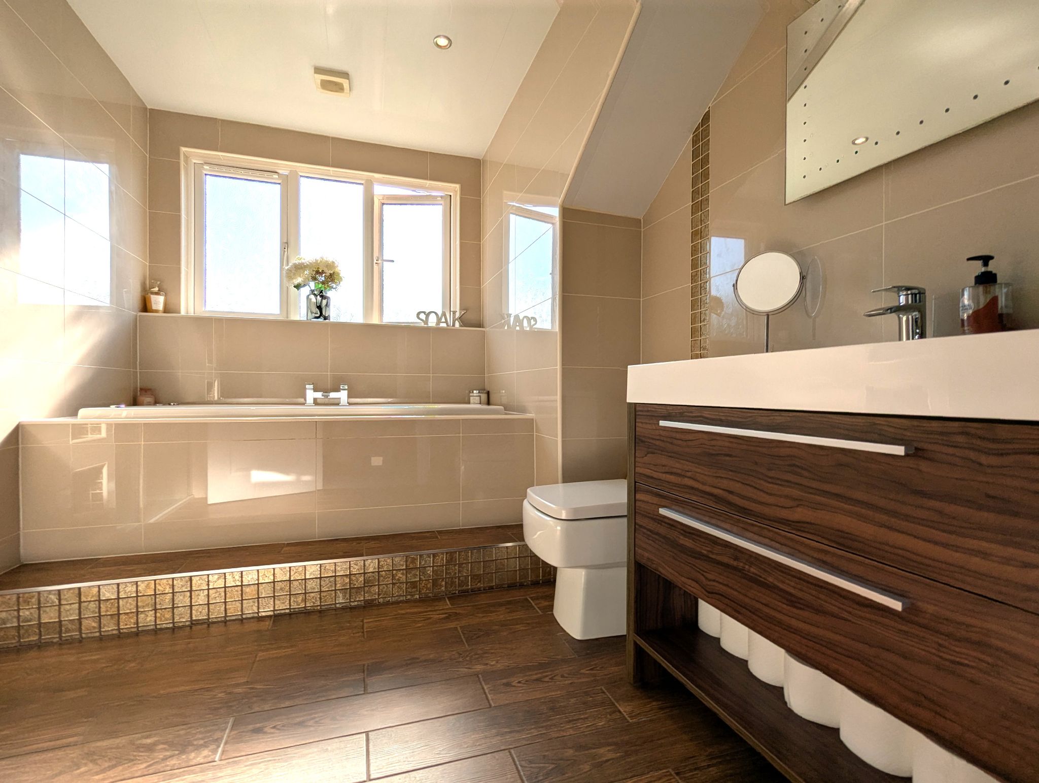 Family Bathroom 9’4 x 10’1 (2.88m x 3.08m) A beautifully present bathroom with wood effect tiled flooring and full-height tiled splashback. Access to a toilet, vanity unit with a fitted wash basin, shower cubicle with a mains supplied rainfall style mixer shower and separate Jetstream bath below a rear-facing UPVC double glazed window. Wall mounted heated towel rail and extractor fan.