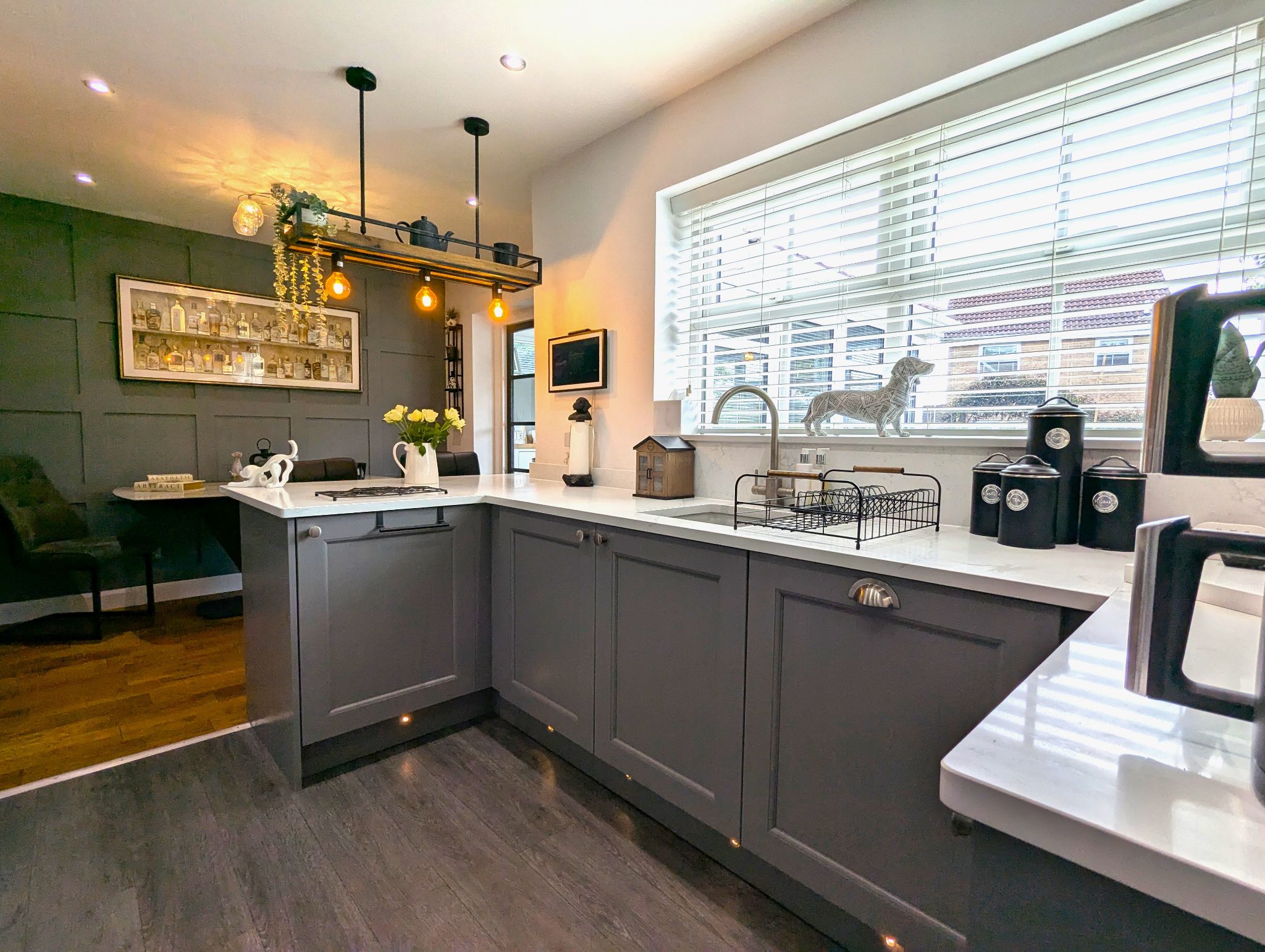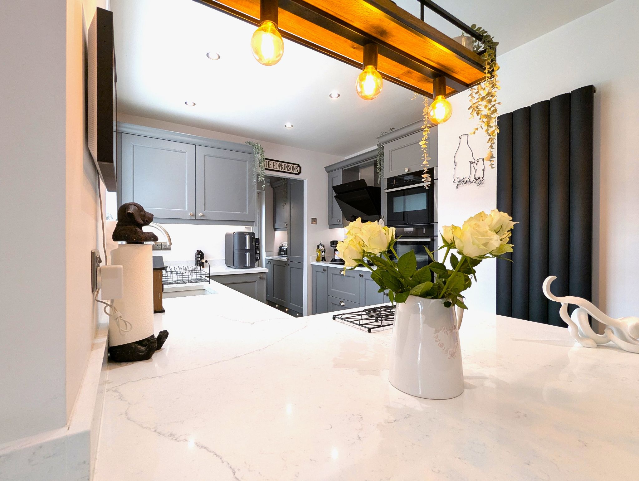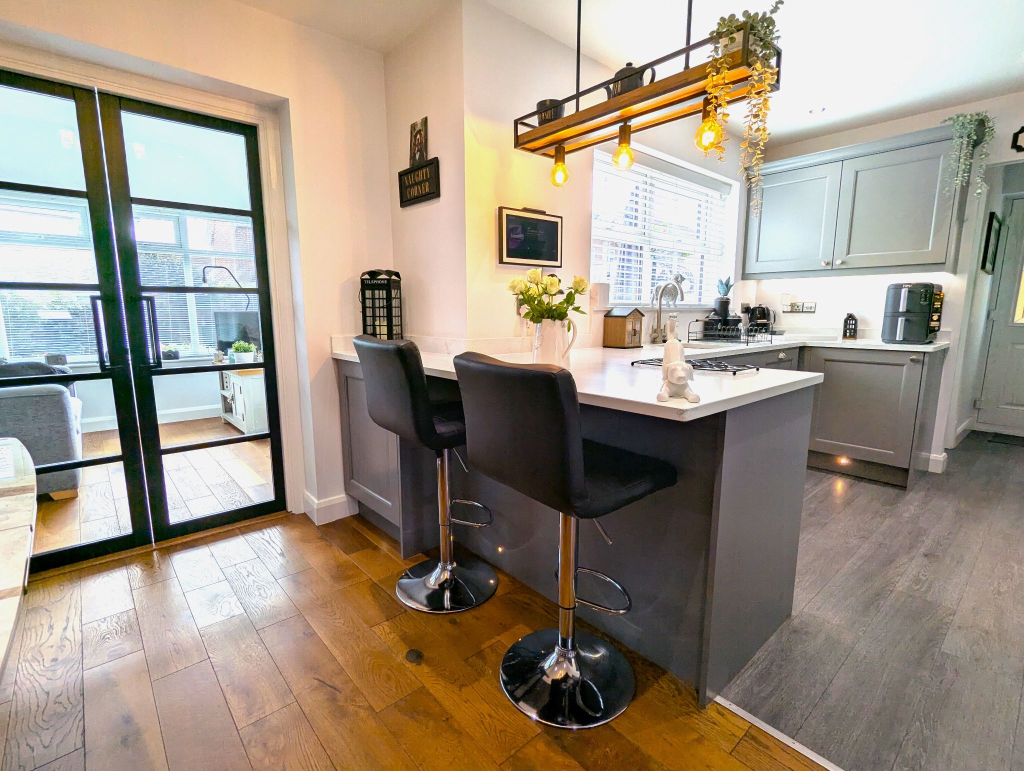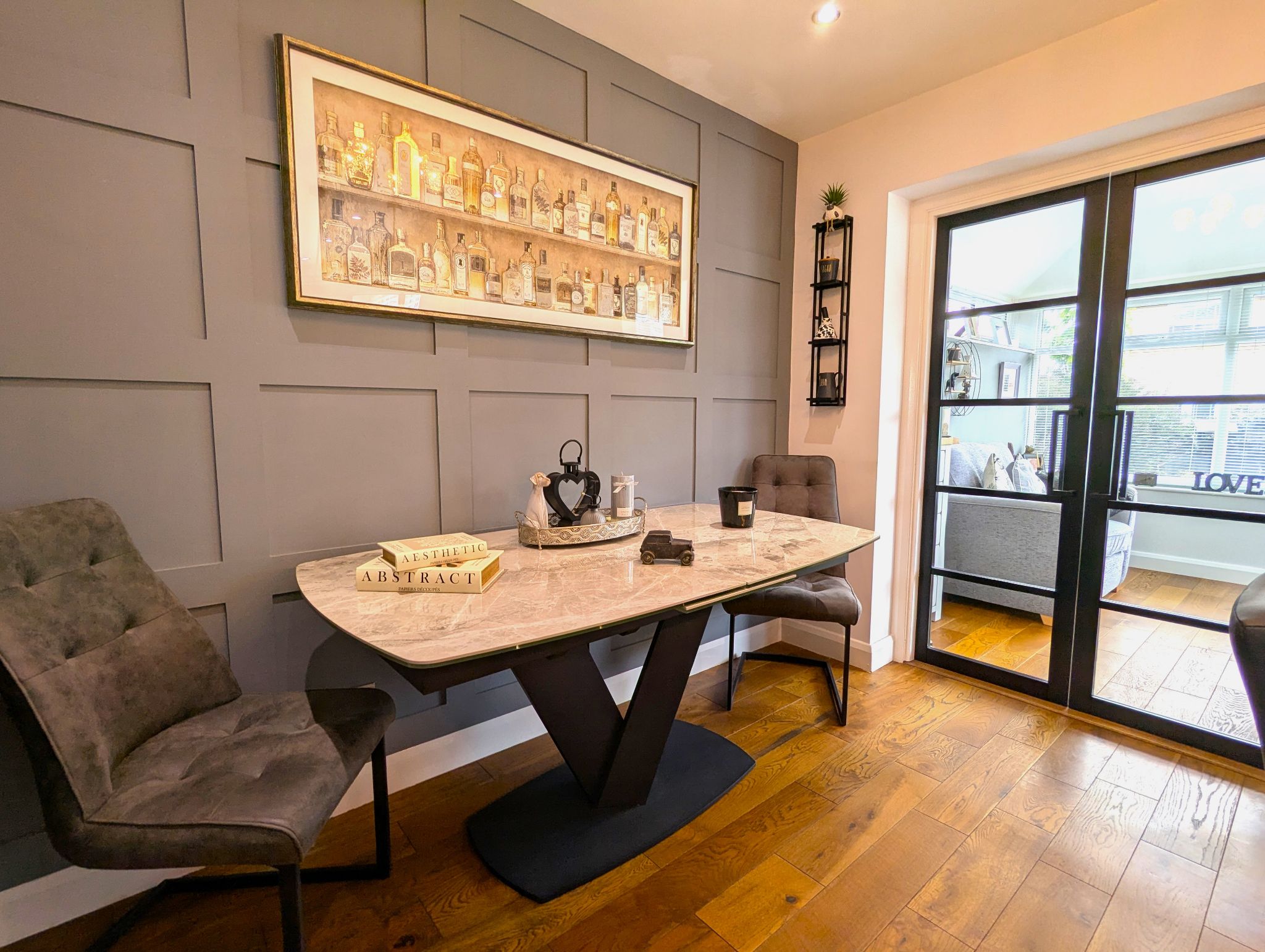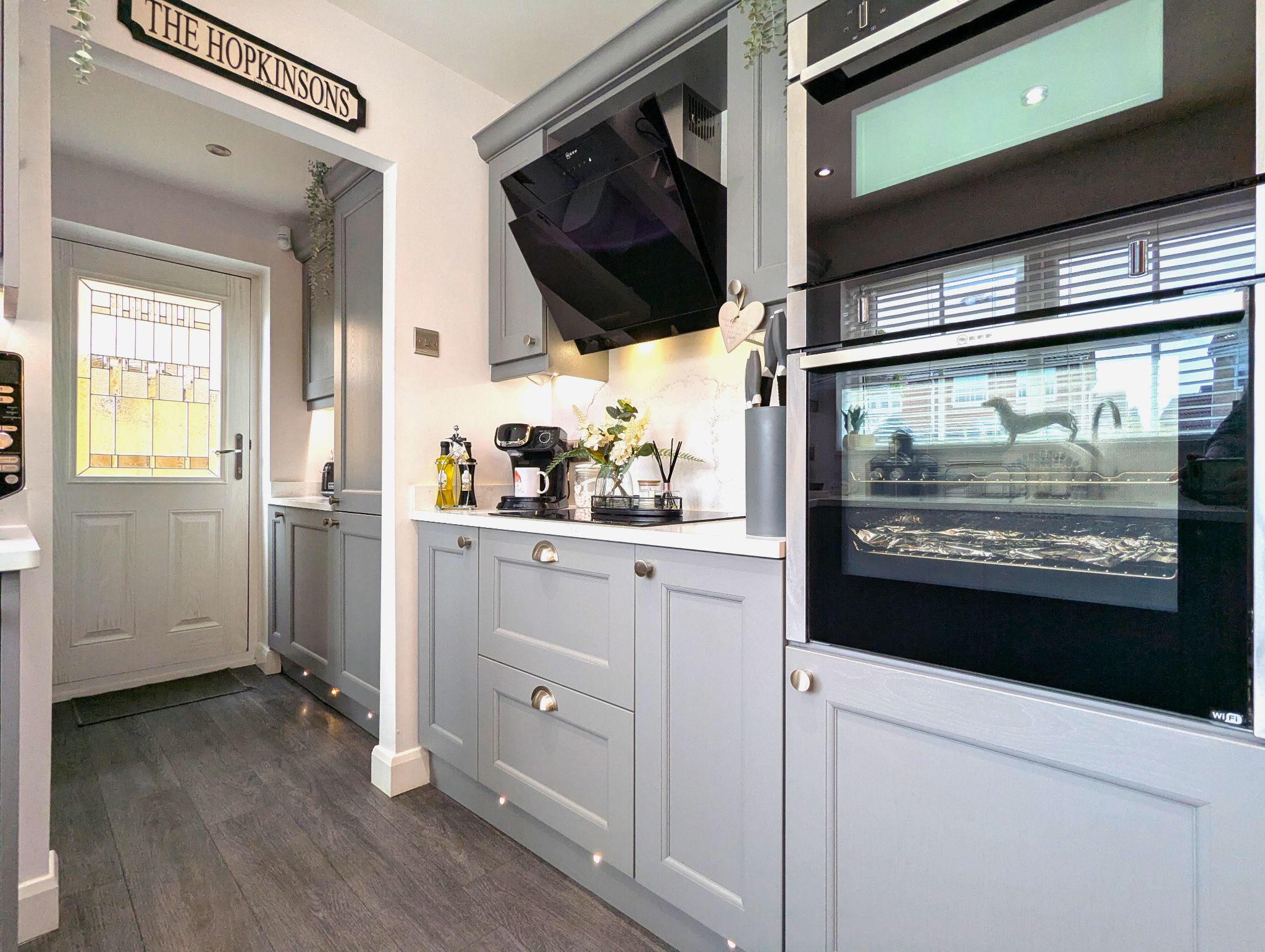 Kitchen/Diner 6'6 x 16'9 (2.01m x 5.15m) - Open plan kitchen/diner with a separate Sun Room off the rear of the dining area and utility space and WC off the far side of the kitchen. The dining area continues with the engineered wood flooring while the kitchen has grey laminate flooring. There is also a wood panelled wall feature to the dining area and a pair of French doors with black matt finish leading to the Sun Room. The kitchen boasts a stunning range of units (some with carousel shelves) with a grey slate finish contrasting with white onyx work surfaces. Integrated appliances include twin NEFF electric ovens and a separate induction hob with an overhead extractor as well as a dishwasher. Ceramic sink with mixer tap below a rear-facing UPVC double glazed window and a wall mounted vertical radiator.