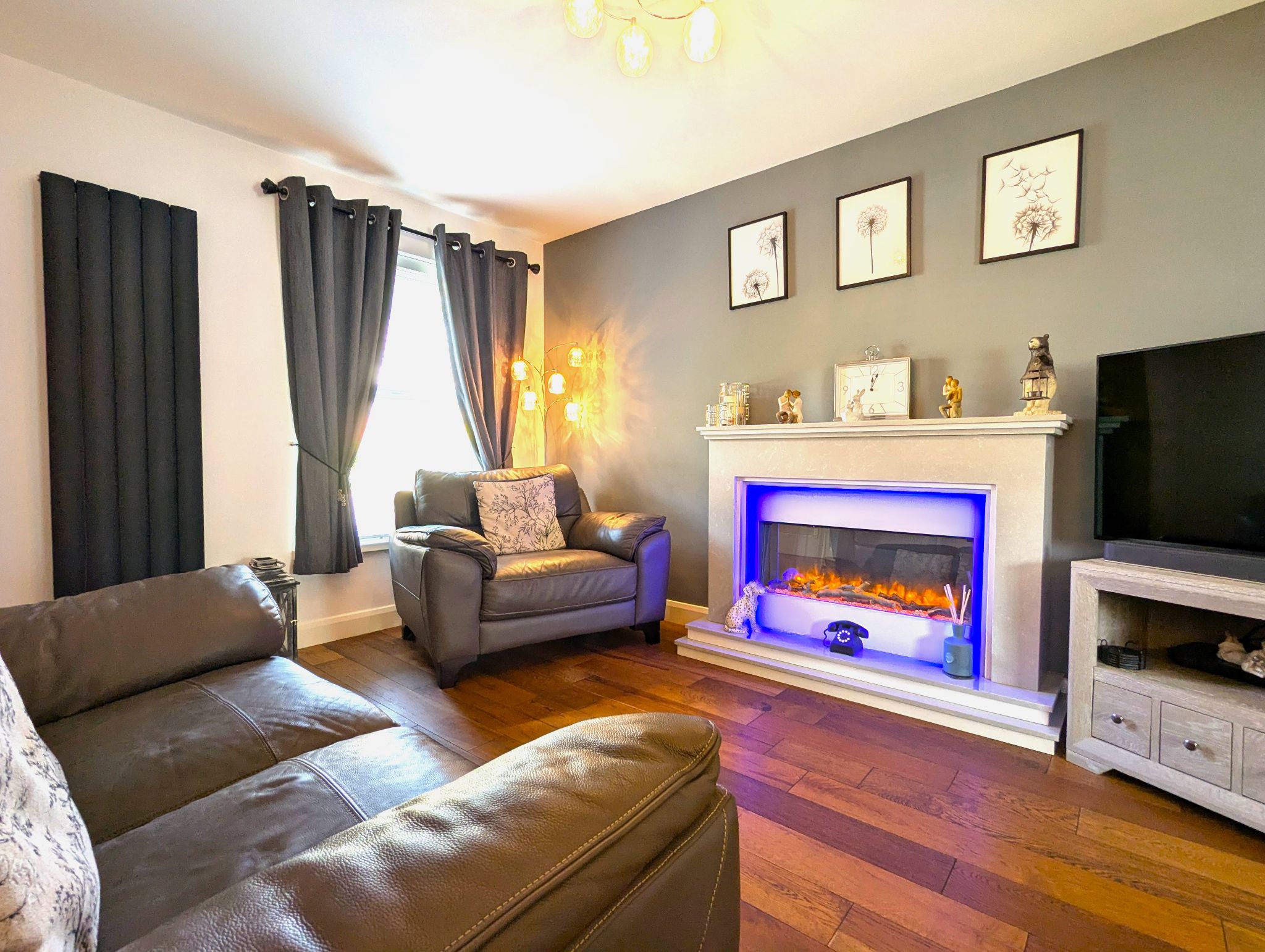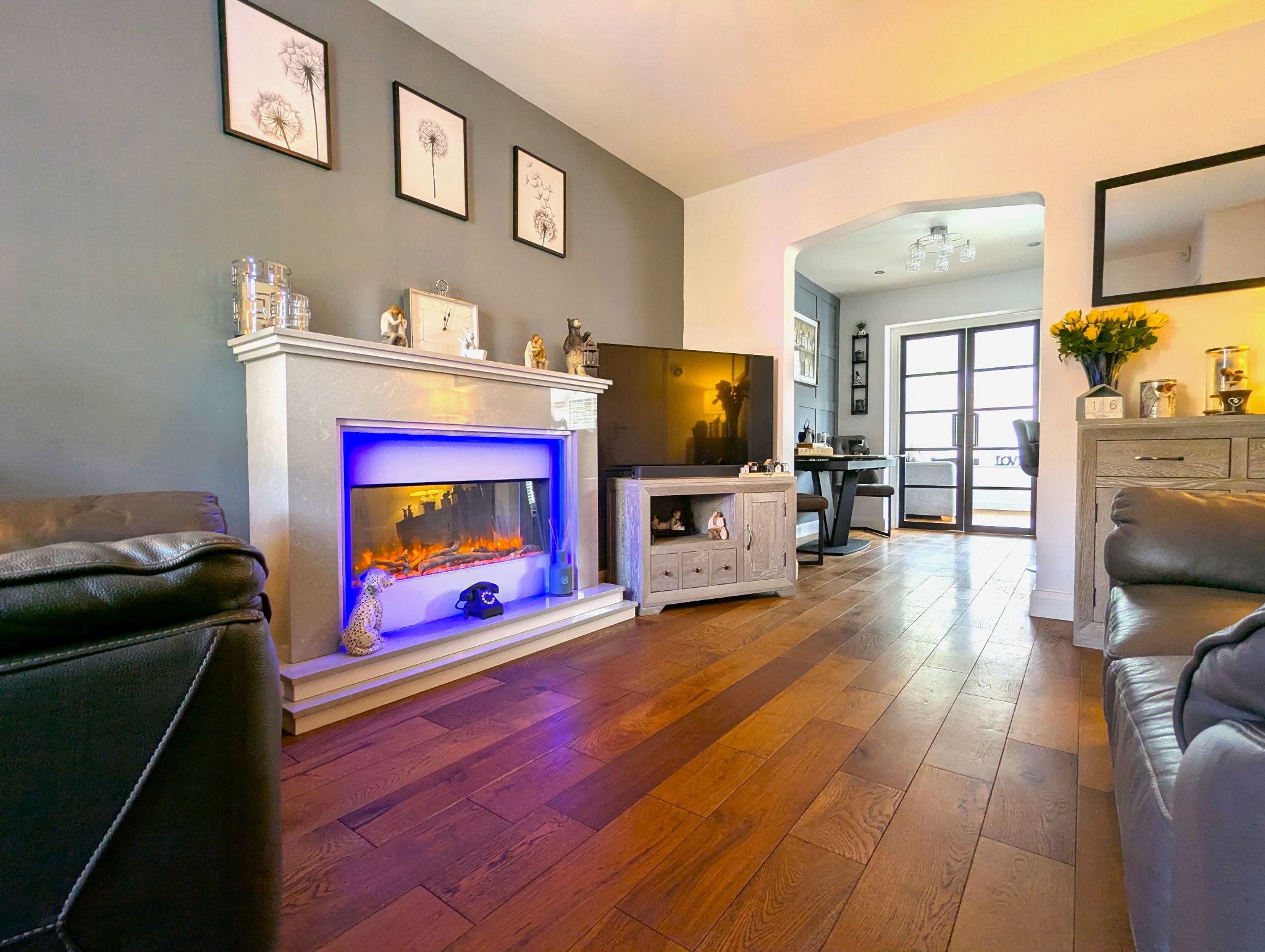 Lounge 13' x 9'8 (3.96m x 2.98m) - Engineered wood flooring, front-facing UPVC double glazed window, wall mounted vertical radiator, remote controlled electric fireplace with Italian marble surround as the rooms centrepiece, open access for the kitchen/diner to the rear.