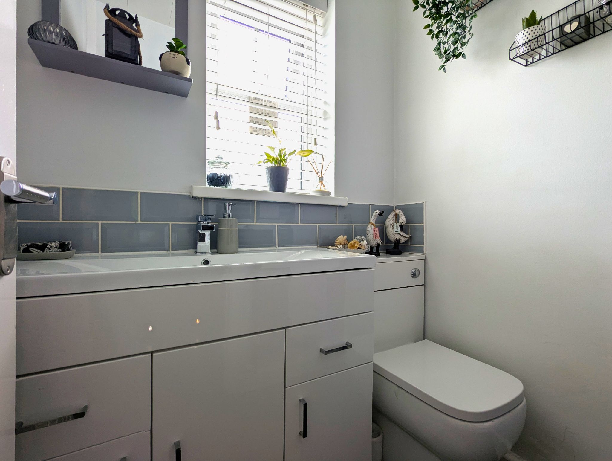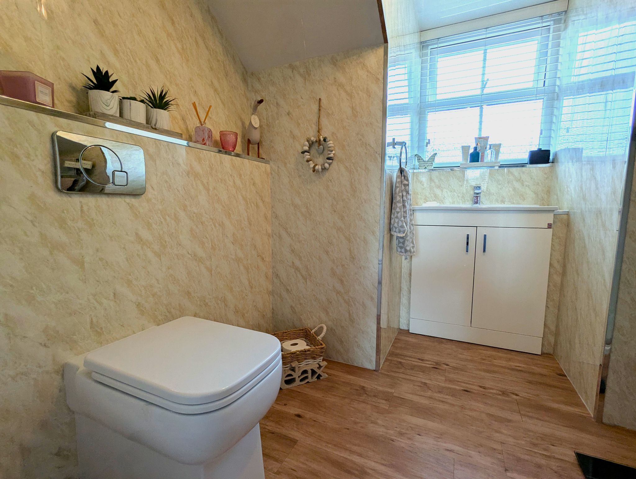 WC - Access to a toilet and wash basin. Rear-facing UPVC double glazed window and wall mounted heated towel rail.
