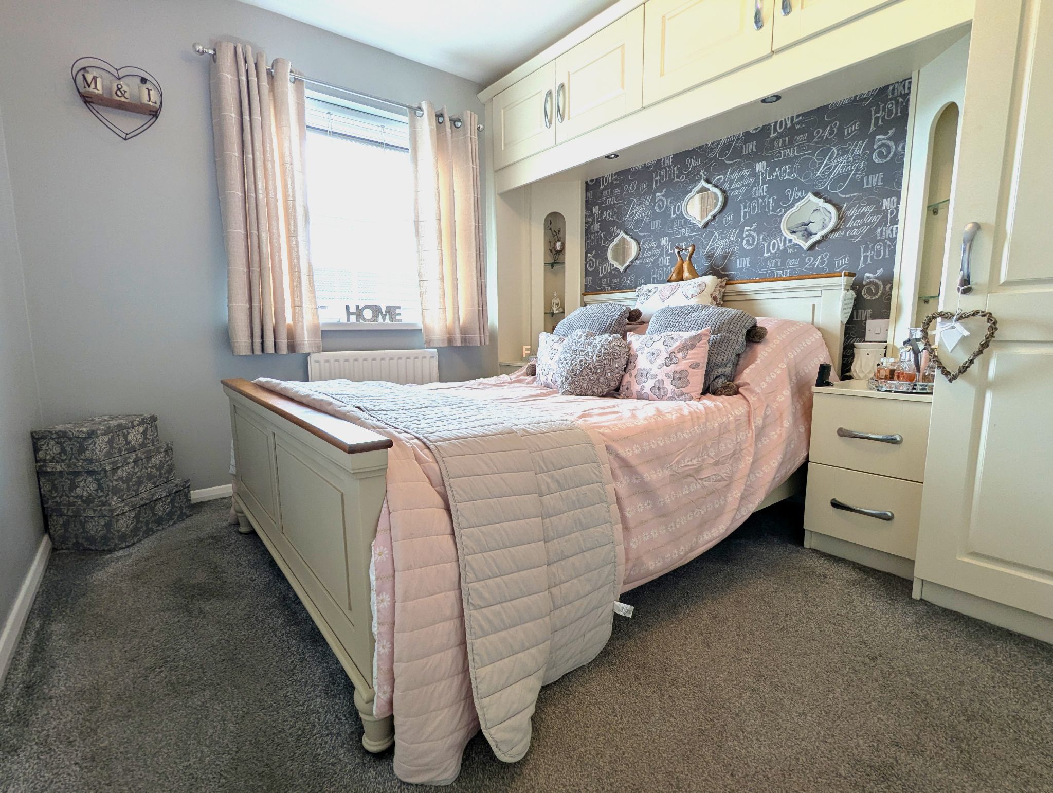 Bedroom One 12'5 x 8'4 (3.81m x 2.56m) - Carpeted bedroom with a rear-facing UPVC double glazed window, fitted wardrobes and units, wall mounted radiator and access to an ensuite.