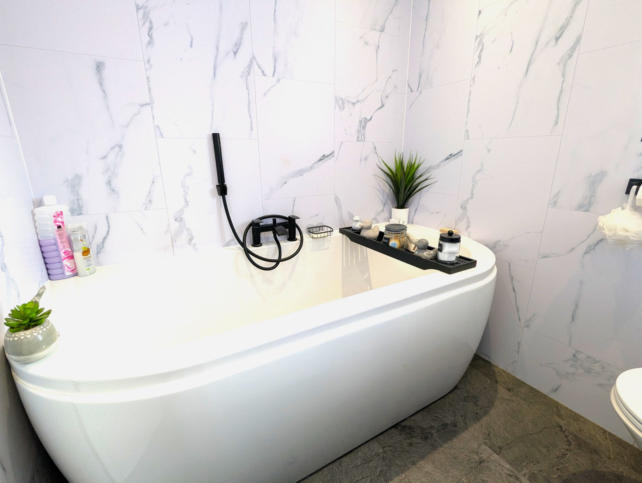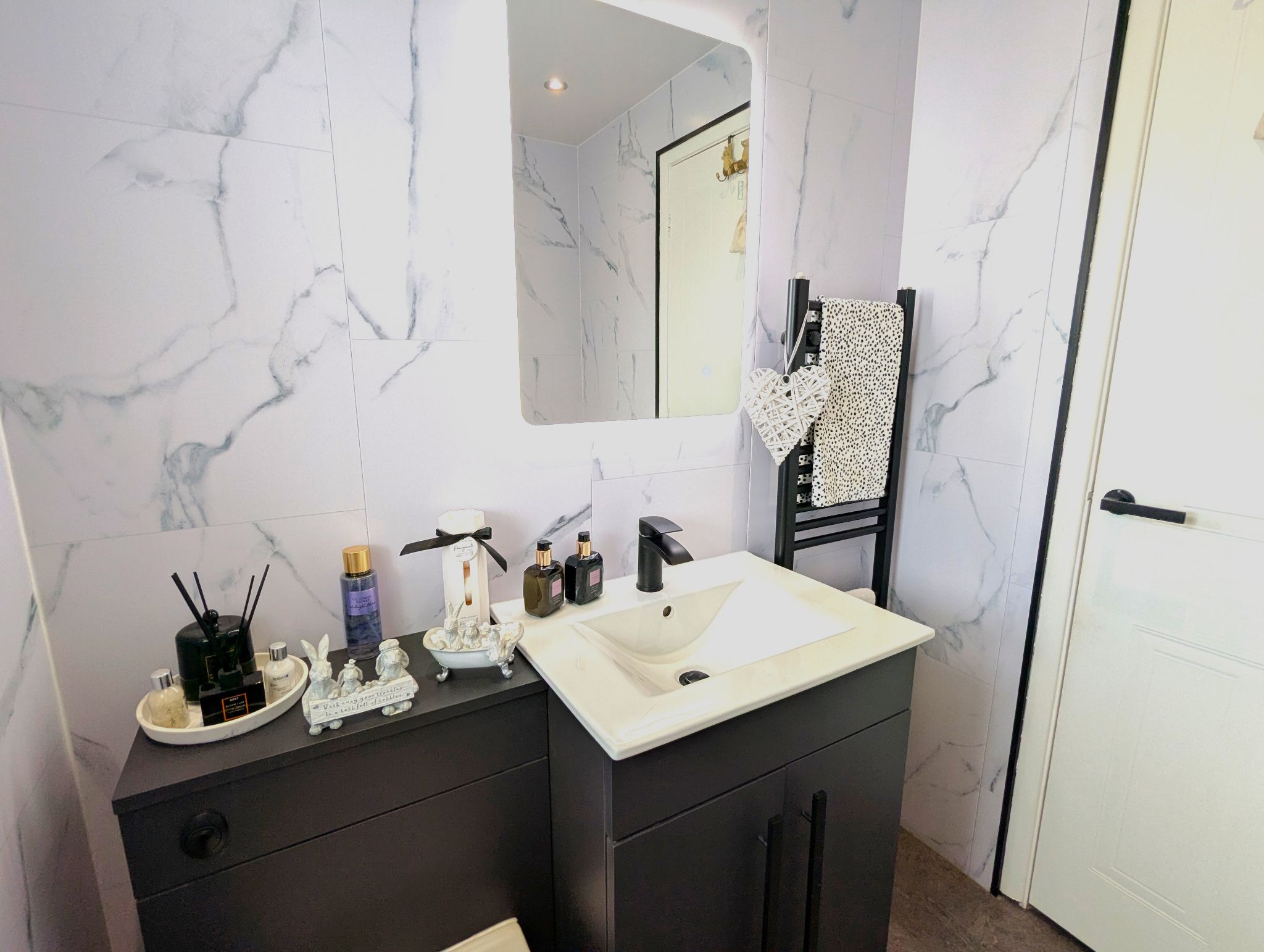 Family Bathroom 5' x 5'9 (1.52m x 1.79m) - LVT flooring with a full-height cladding tile splashback. Access to a toilet, vanity unit with fitted wash basin and bath. Matching taps, handheld shower unit and wall mounted heated towel rail with black matt finish. LED mirror. Rear-facing UPVC double glazed window. Extractor fan.