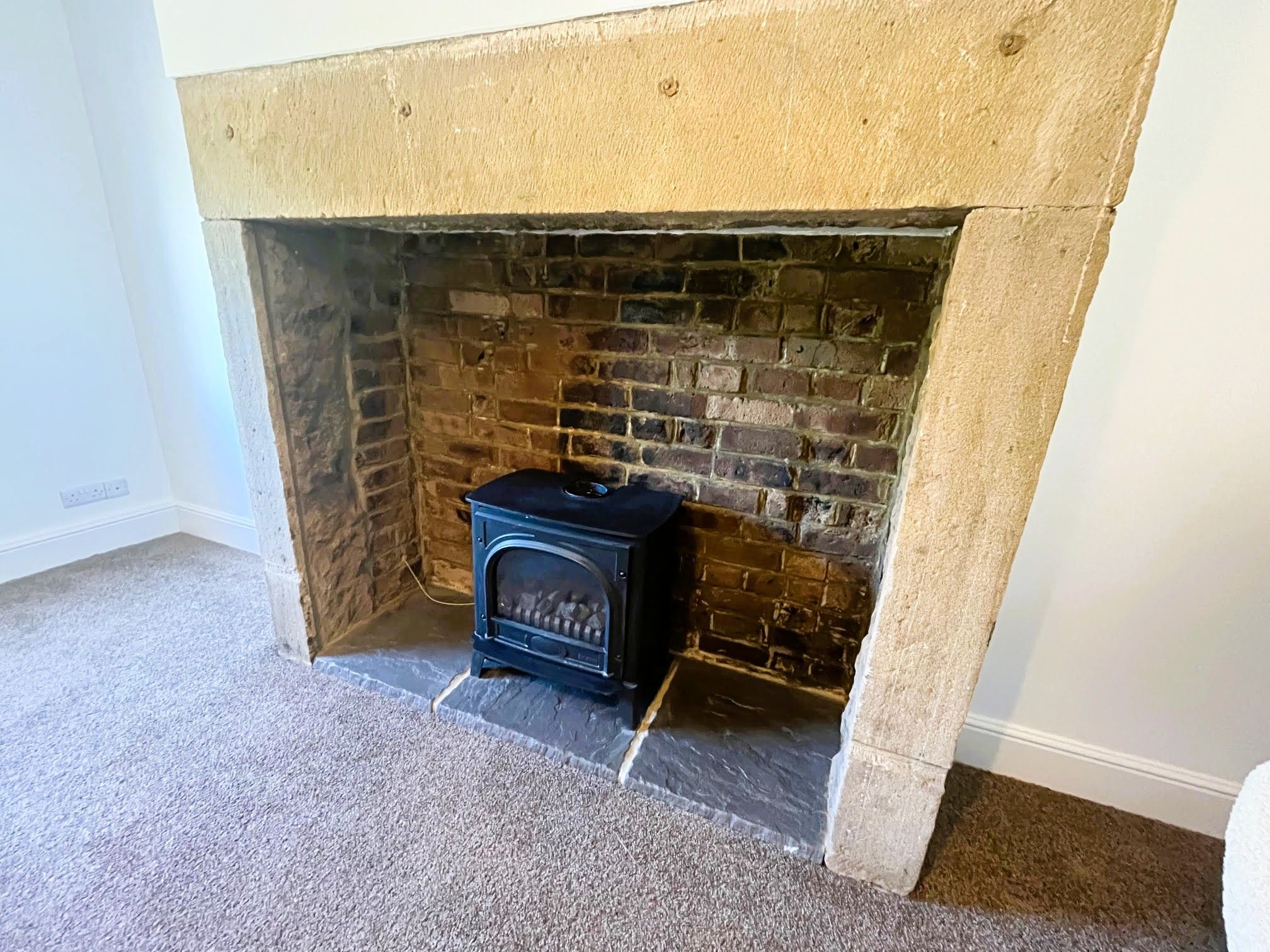 Lounge - 4.74 x 4.76 - featuring radiator, double glazed UPVC window to front with blinds, pendant light fitting, TV point, smoke alarm, feature fireplace & carpeted flooring. (electric fire not included)