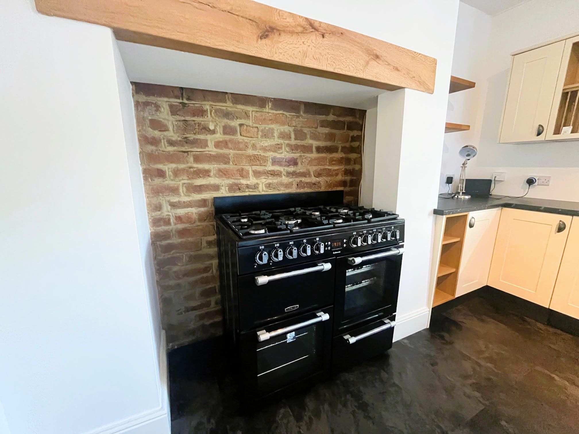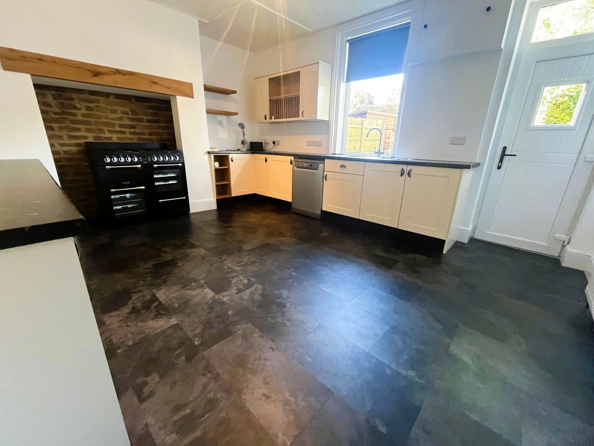 Kitchen - 3.57 x 4.84 - featuring UPVC door leading to rear garden & driveway, double glazed UPVC window with blinds to rear, gas range cooker, dishwasher, stainless steel sink with mixer tap & drainer, under counter integrated fridge, radiator, spotlights & composite flooring.