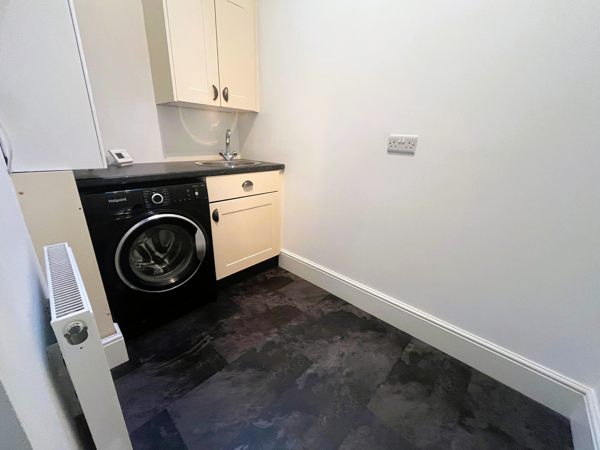 Utility room - 1.4 x 2.42 - featuring velux window, washing machine, stainless steel sink with mixer tap, combi boiler & composite flooring.