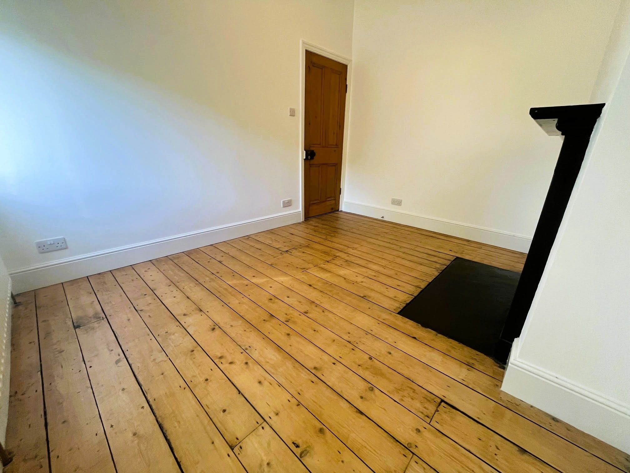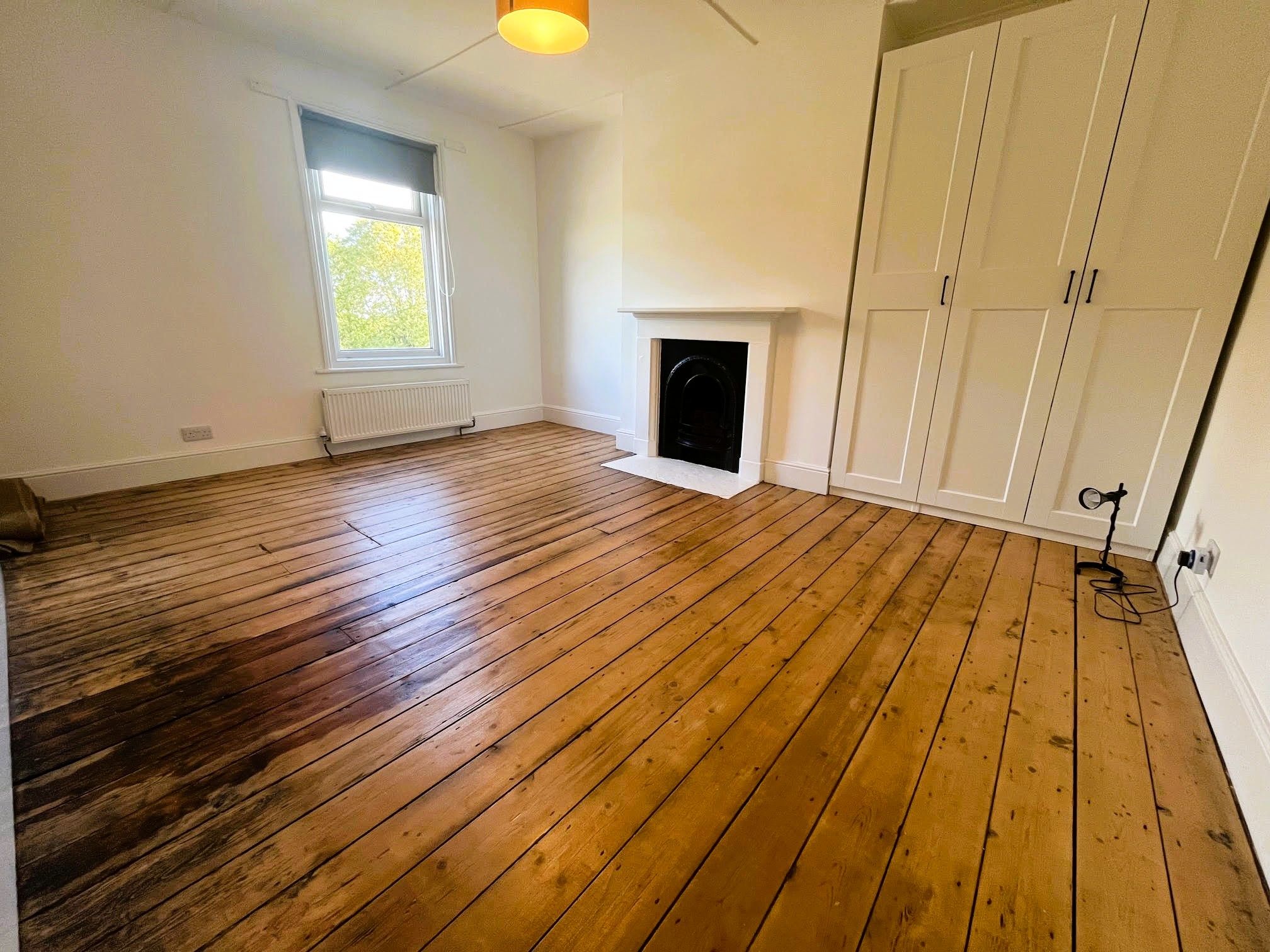 Bedroom 1 - 4.75 x 3.80 - featuring double glazed UPVC window to front with blinds, radiator, wardrobes, built in cupboard, pendant light fitting, original feature fireplace & wooden flooring.