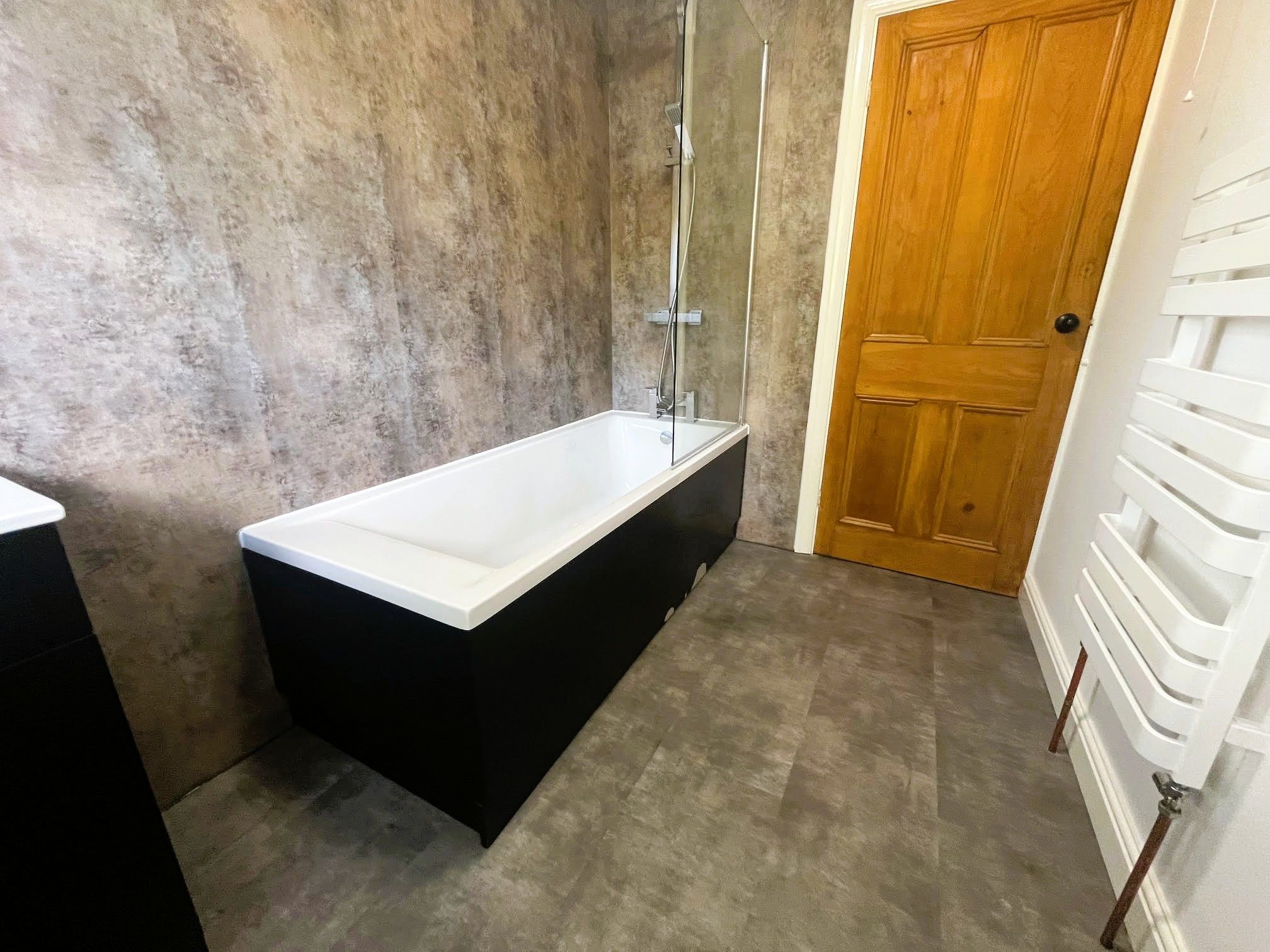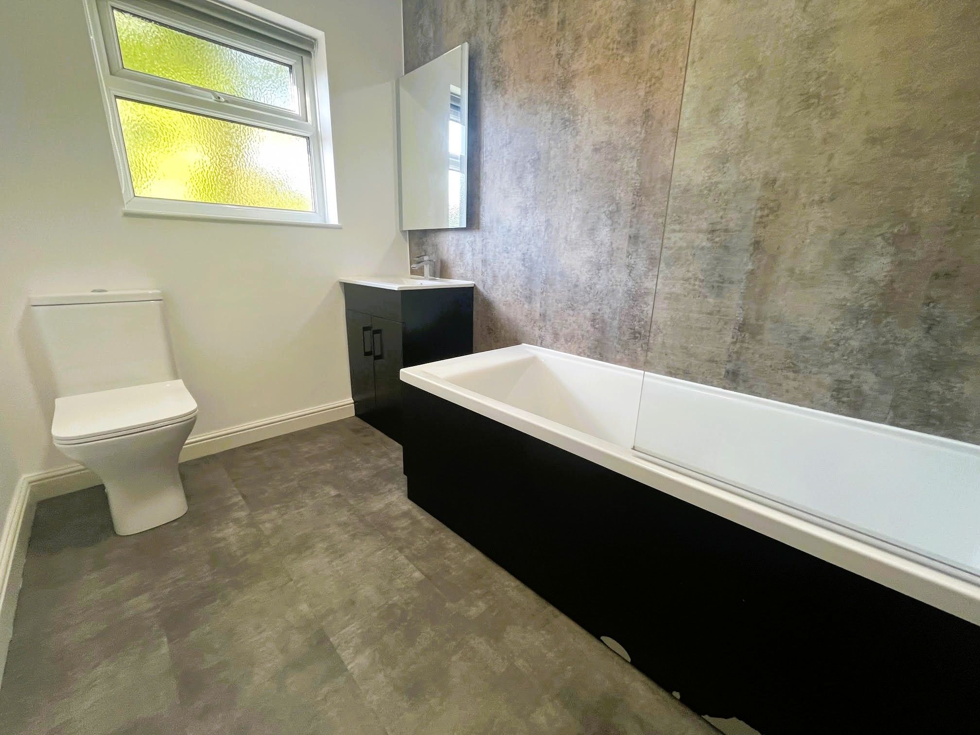 Bathroom - 2.66 x 1.80 - featuring double glazed UPVC window to rear, WC, hand basin, bath with shower overhead powered by mains, heated towel rail, dome light fitting & composite flooring.