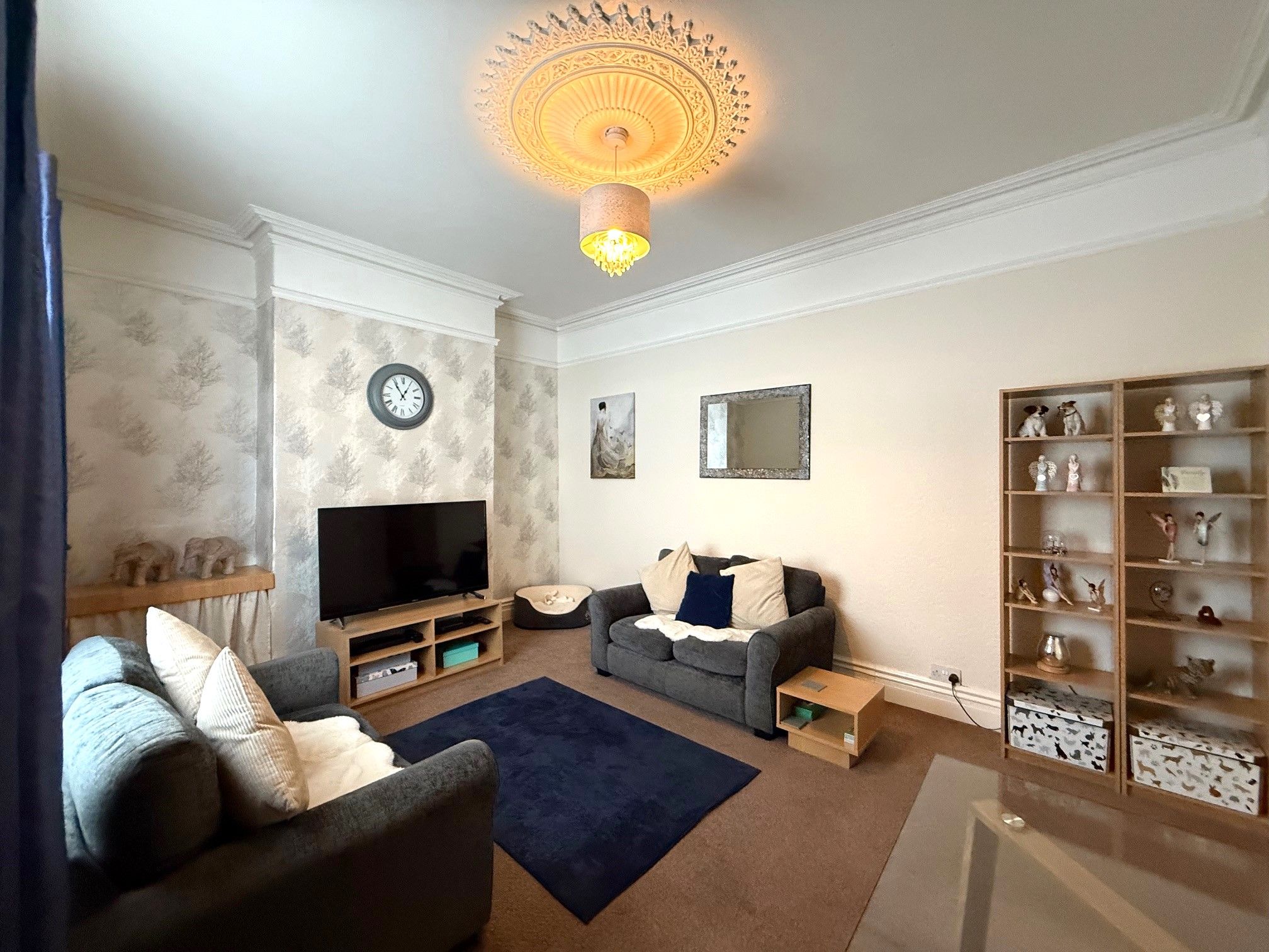 2 reception rooms provide ample living space. The primary living room again boasts higher than average ceilings, original covings and a stunning plaster ceiling rose. Located to the rear is a larger than average dining room. This could be opened up to the kitchen or even move the kitchen into this room and make a superb family area. White high gloss units are with kitchen along with a handy storage cupboard and door way to rear porch.