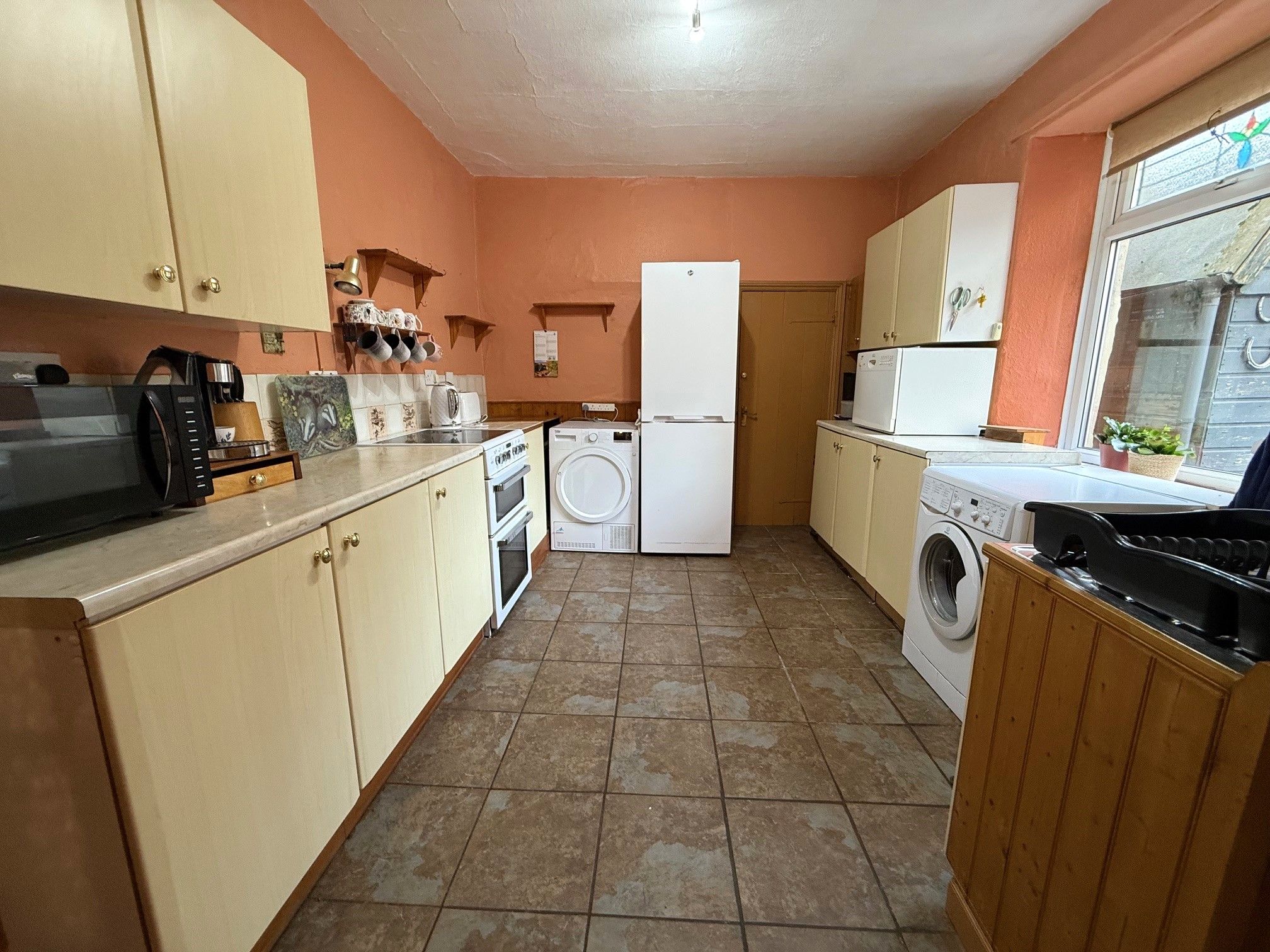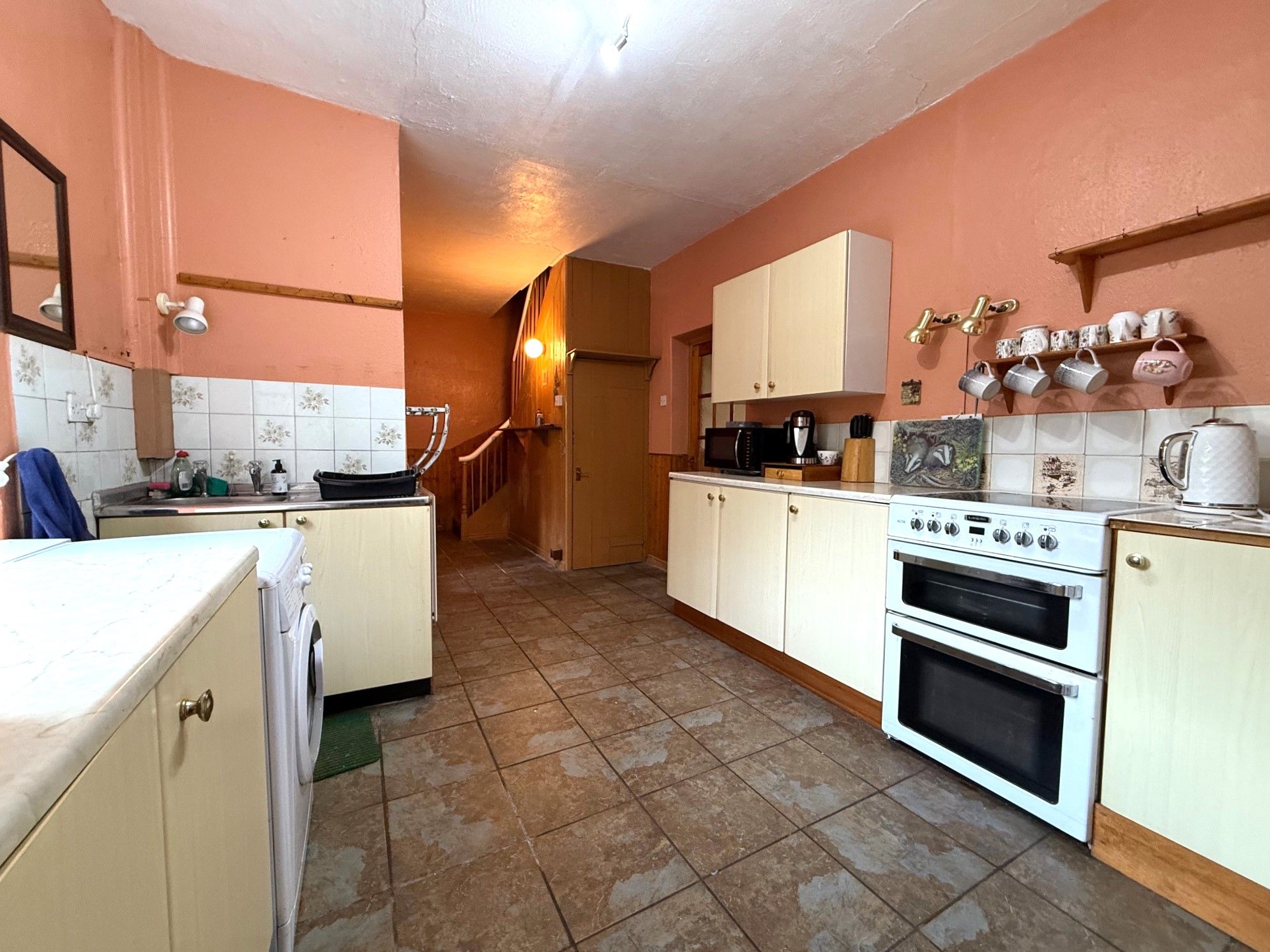 Kitchen. 11'6 x 11'3 (3.49m x 3.42m) Double glazed window to rear, range of wall and base units, space for oven, fridge freezer, sink and drainer, plumbed for washing machine, space for tumble dryer, radiator, pantry and storage cupboard under stairs, door to rear and stairs to upper floor.