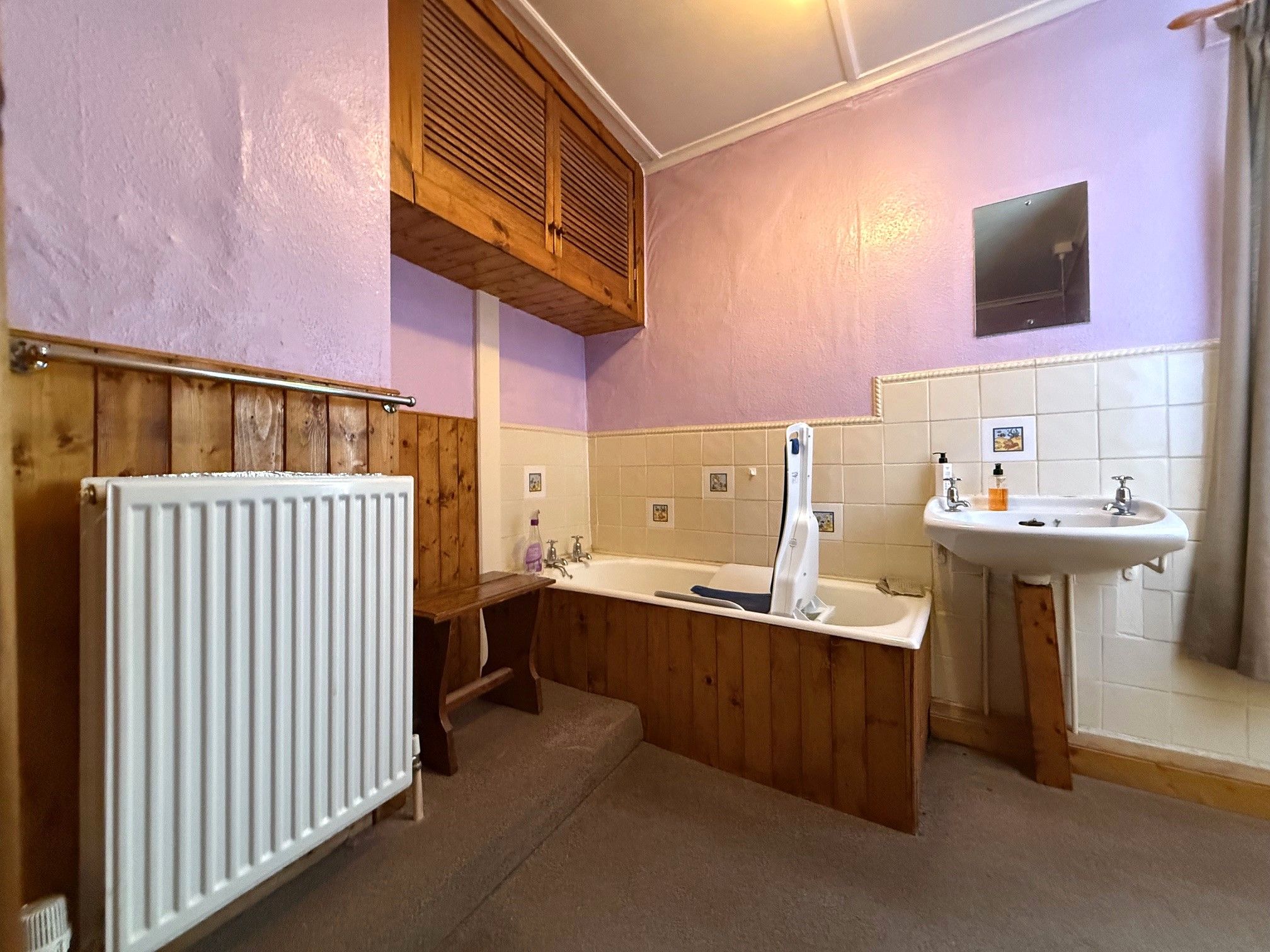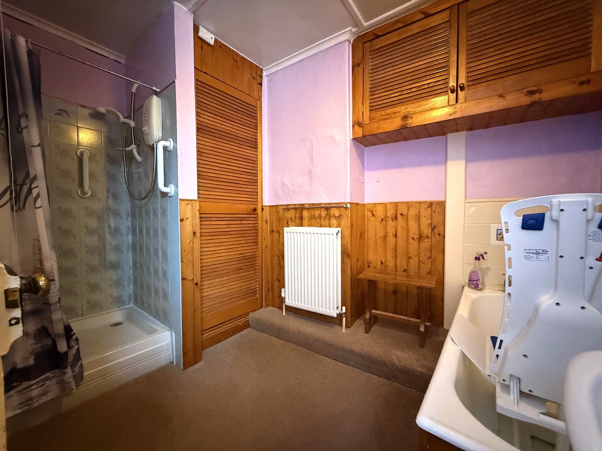 Bathroom. Double glazed window to rear, bath, shower enclosure, hand basin, WC and radiator. Storage cupboard with combination boiler.