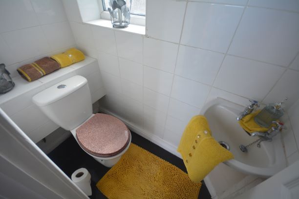 Downstairs W/C 2.5ft x 5.4ft double glazed window with frosted glass, toilet, hand basin, full height tiled walls, pendant light fitting and tiled flooring