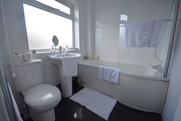 Family Bathroom double glazed window with frosted glass, toilet, hand basin, bath, full height tiled walls, heated towel rail, pendant light fitting and tiled flooring