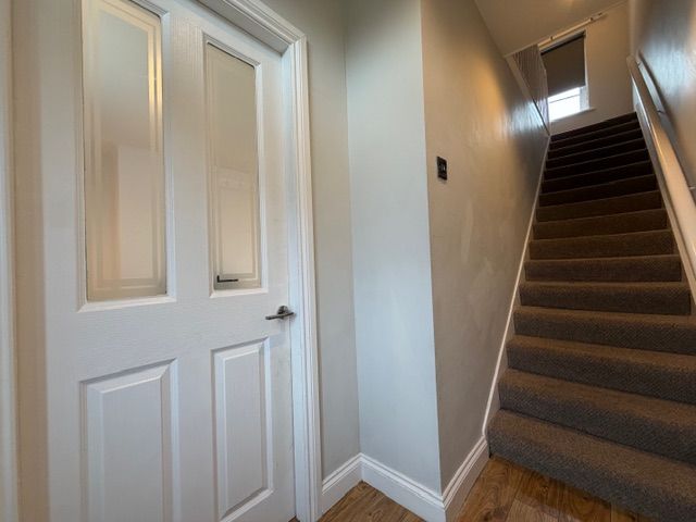 Entrance into Hallway featuring UPVC door with double glazing, double panel radiator and laminate flooring.