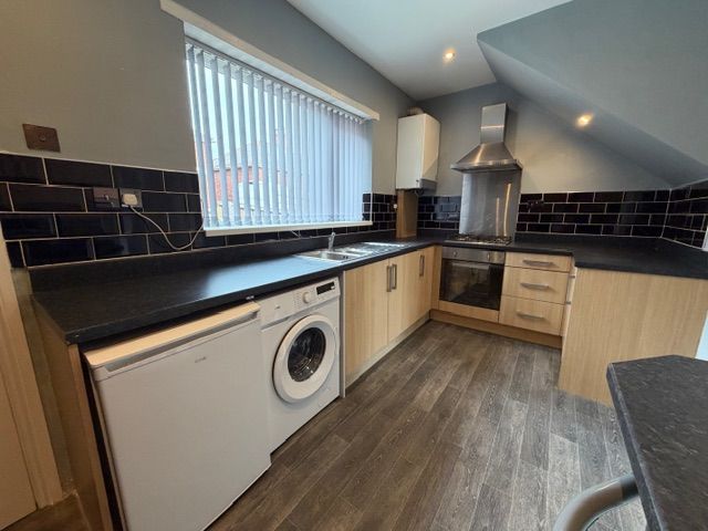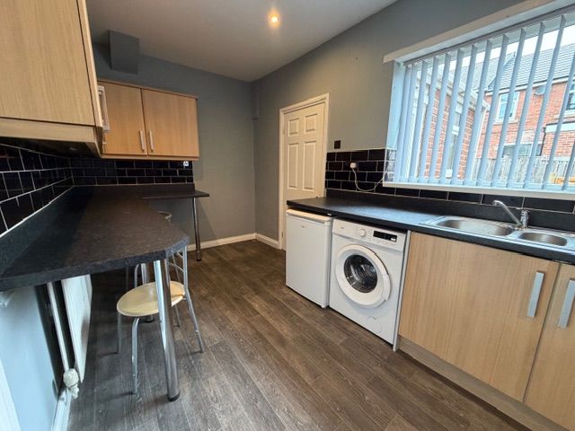 Kitchen - 2.38 x 5.20 - featuring UPVC window to rear, oven & gas hob, washing machine, fridge/freezer, stainless steel sink & drainer with mixer tap, tiled splash back, double panel radiator, spotlights & vinyl flooring.
