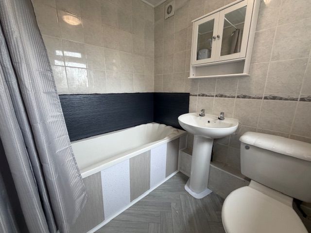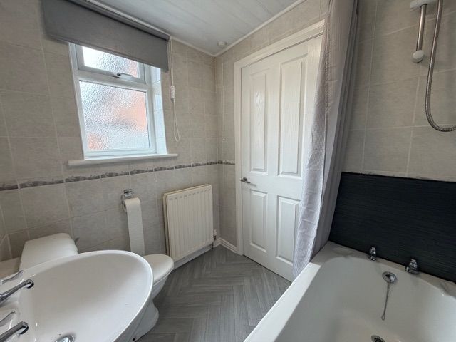 Downstairs bathroom - 1.69 x 1.97 - featuring double glazed UPVC window to side, double panel radiator, WC, bath with overhead shower, tiled, wash hand basin, dome light fitting & vinyl flooring.