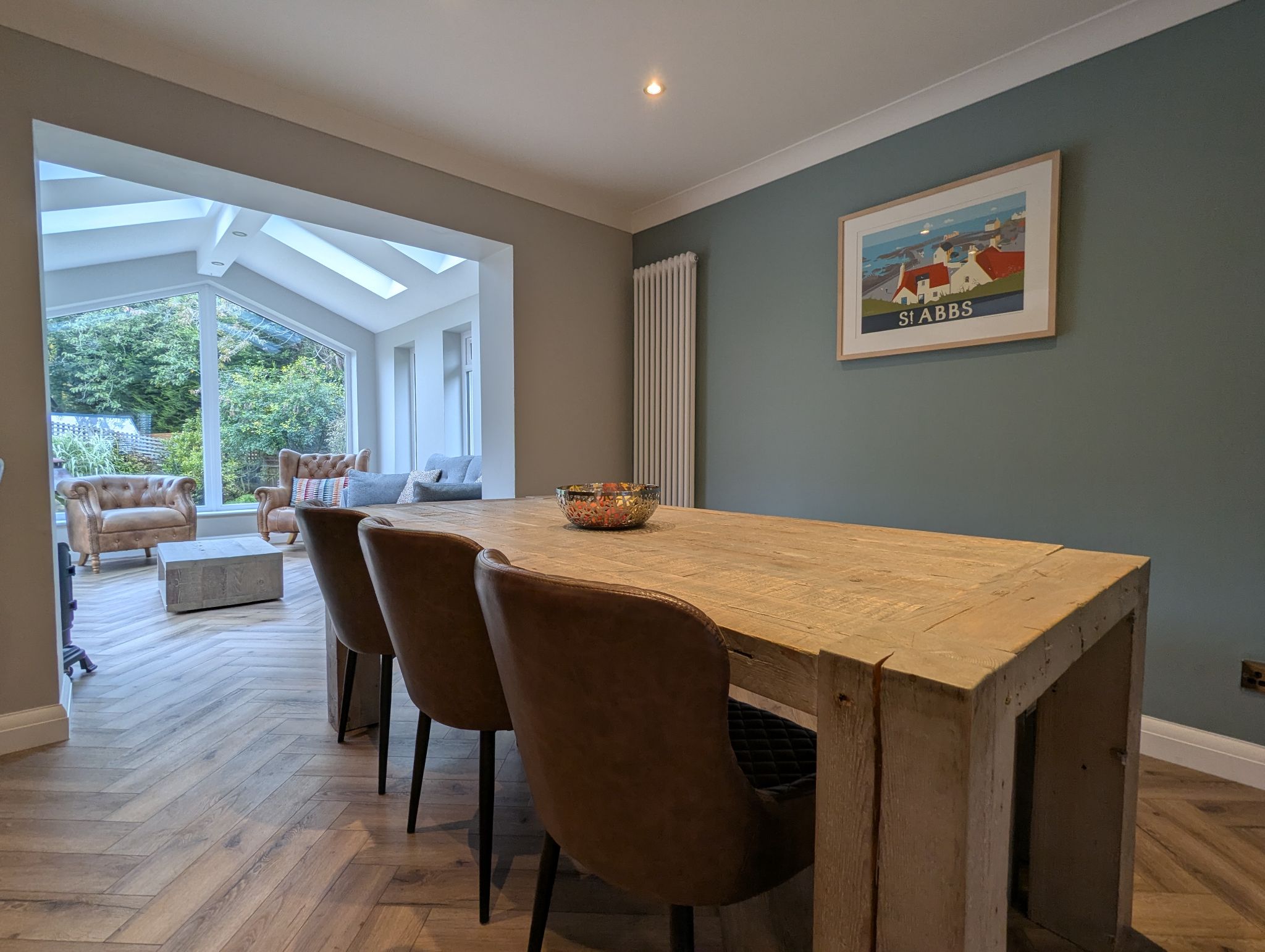 Kitchen/Diner - 10' x 22'5 (3.05m x 6.88m) - A bright, airy and spacious kitchen/diner with an open plan aspect for a stunning sun room off the dining area. An ample range of sublime base and wall fitted kitchen units with sleek quartz work surfaces. Integrated appliances included a twin electric oven and separate 5 ring induction hob, dishwasher and fridge/freezer. Composite one-and-a-half sink with mixer tap below a rear-facing UPVC double glazed window. 2 wall mounted vertical radiators and access to a lounge and utility.