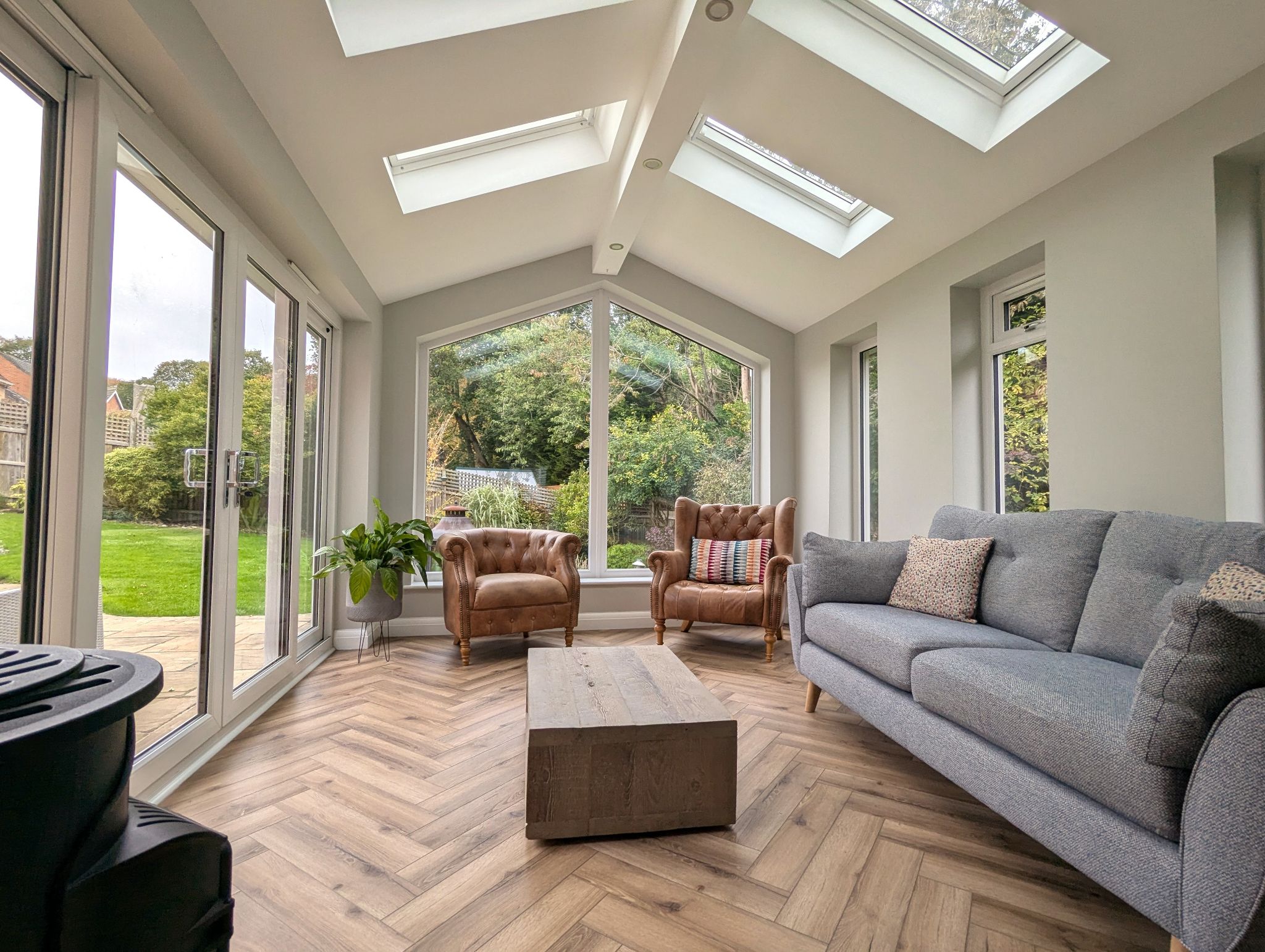 Sun Room - 12'7 x 9'8 (3.89m x 2.99m) - Go through to an open, airy and bright sun room in a well-designed extension, with electric under floor heating and vaulted ceilings boasting 4 large Velux skylights. Floor to ceiling UPVC double glazing to the most part with double French doors leading out into the rear garden.
