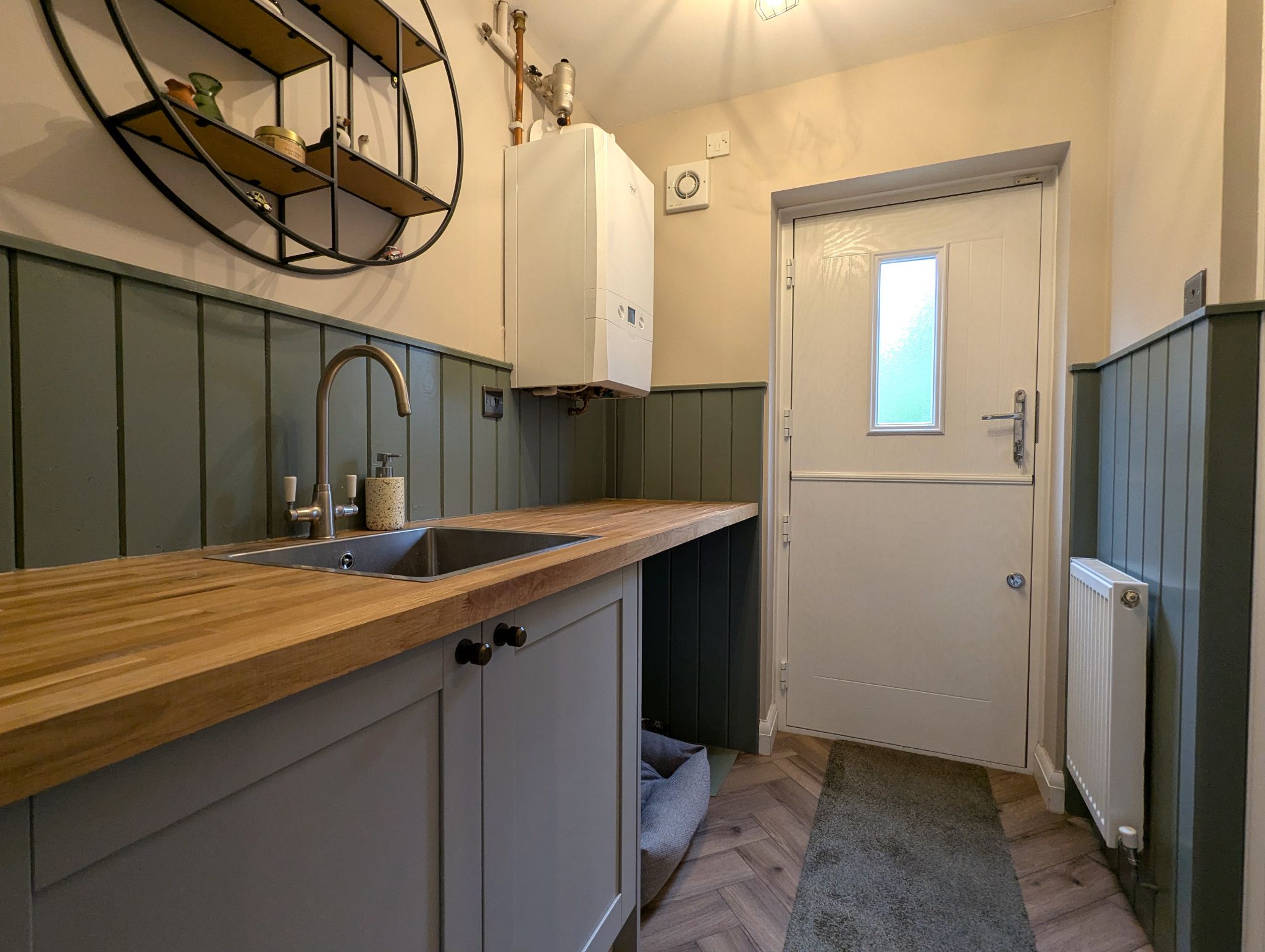 Utility - 4'8 x 6'5 (1.48m x 2.01m) - Wood workbench with a fitted base unit and stainless steel sink with mixer tap. Space for a freestanding washing machine and tumble dryer. Logic combination boiler. Composite stable door to the rear garden. Extractor fan and access to the WC.