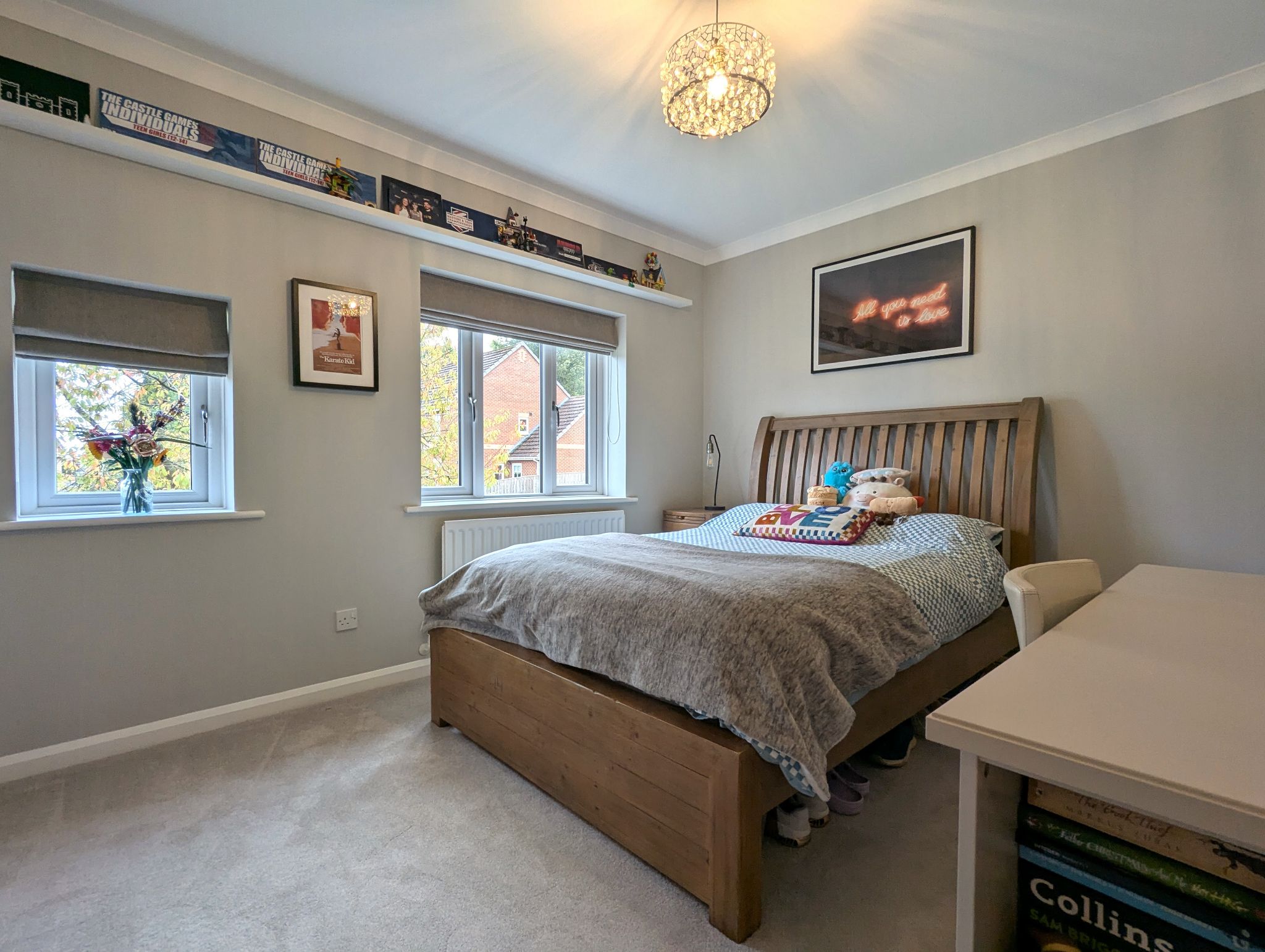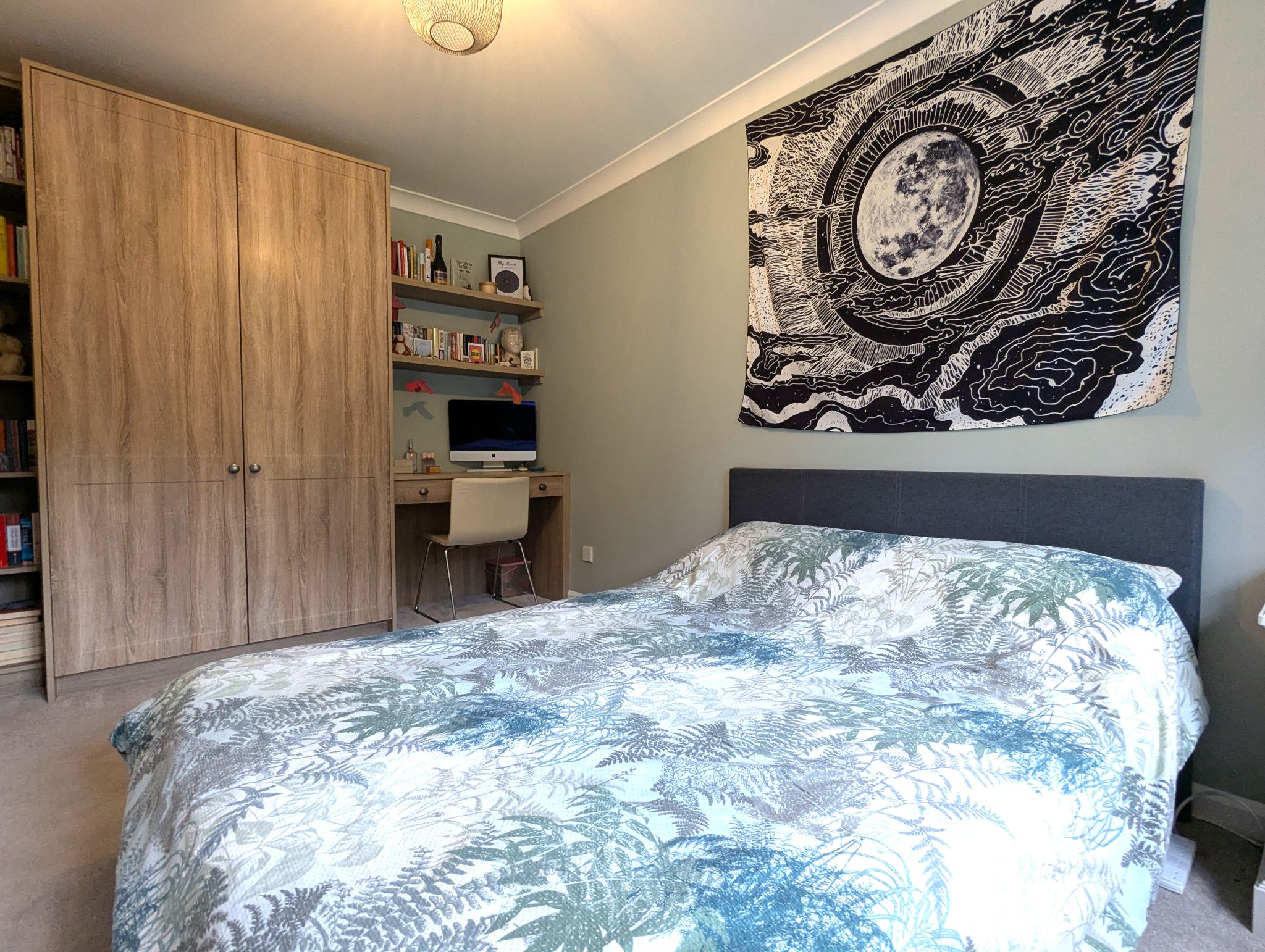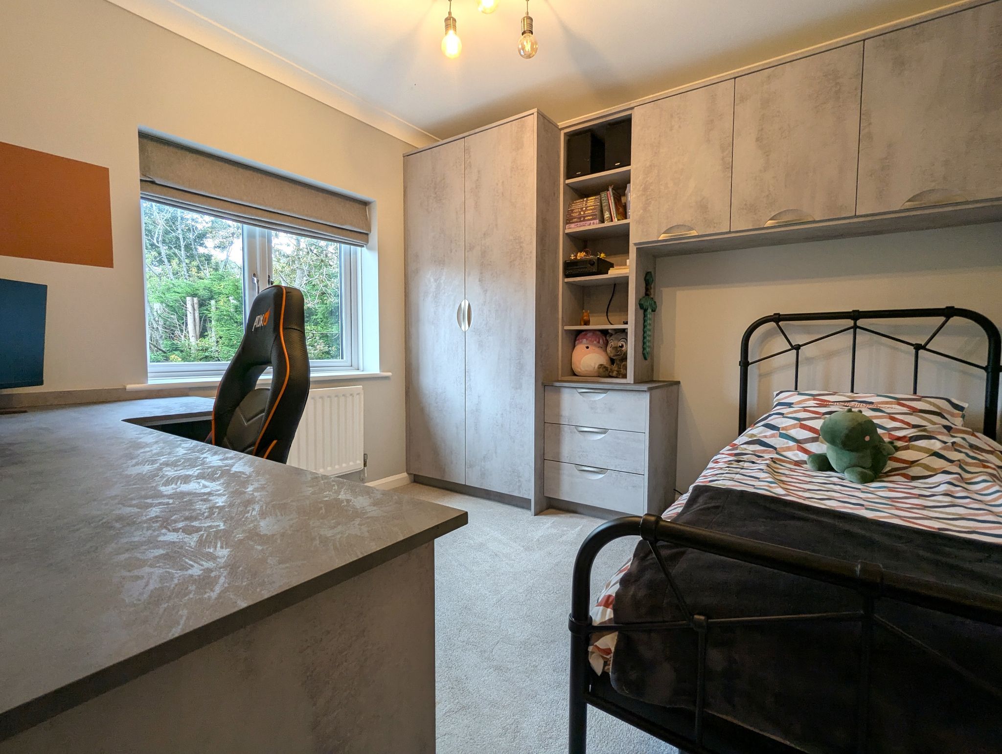 Bedroom Four - 9'5 x 9'4 (2.92m x 2.87m) - Carpeted bedroom with a rear-facing UPVC double glazed window, fitted wardrobe, cupboard unit and desk, wall mounted radiator.